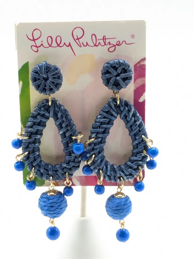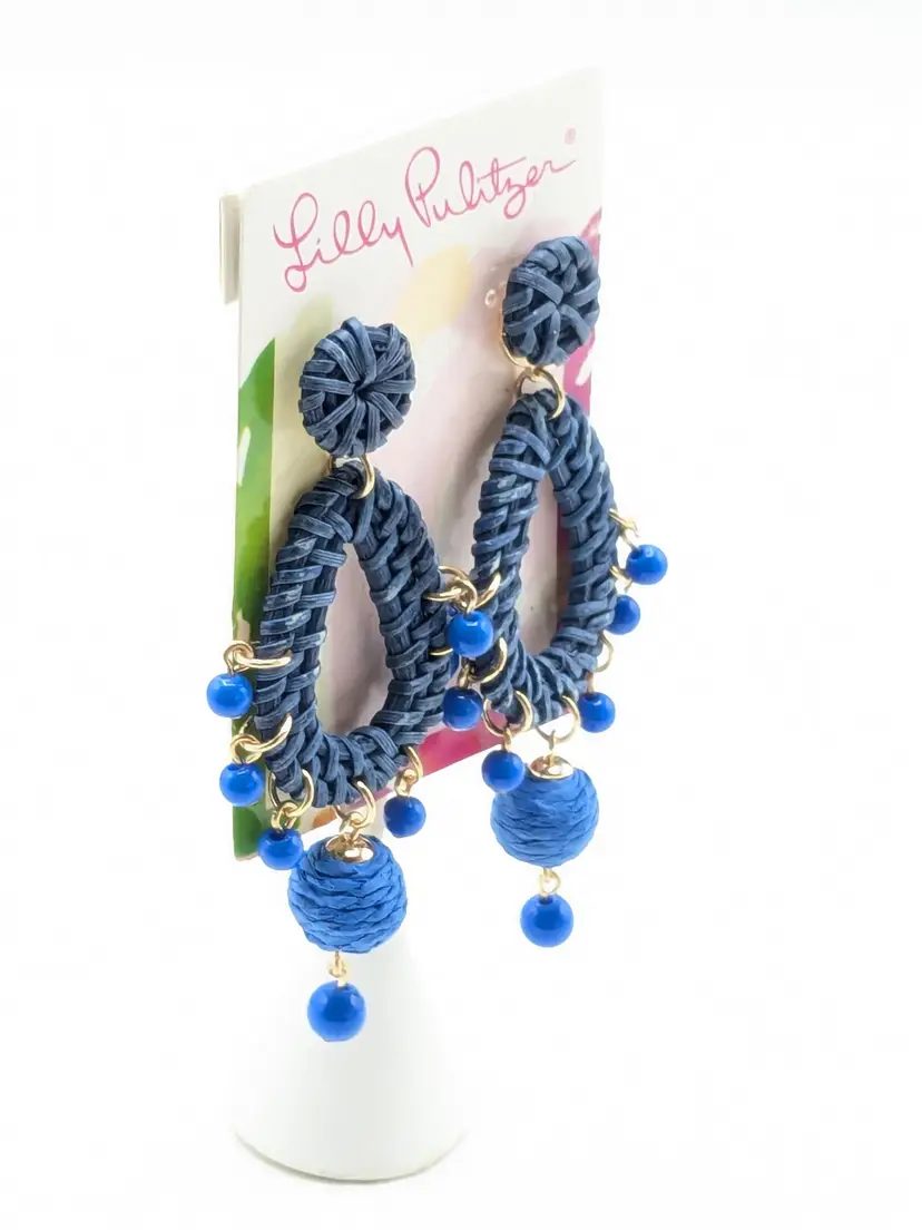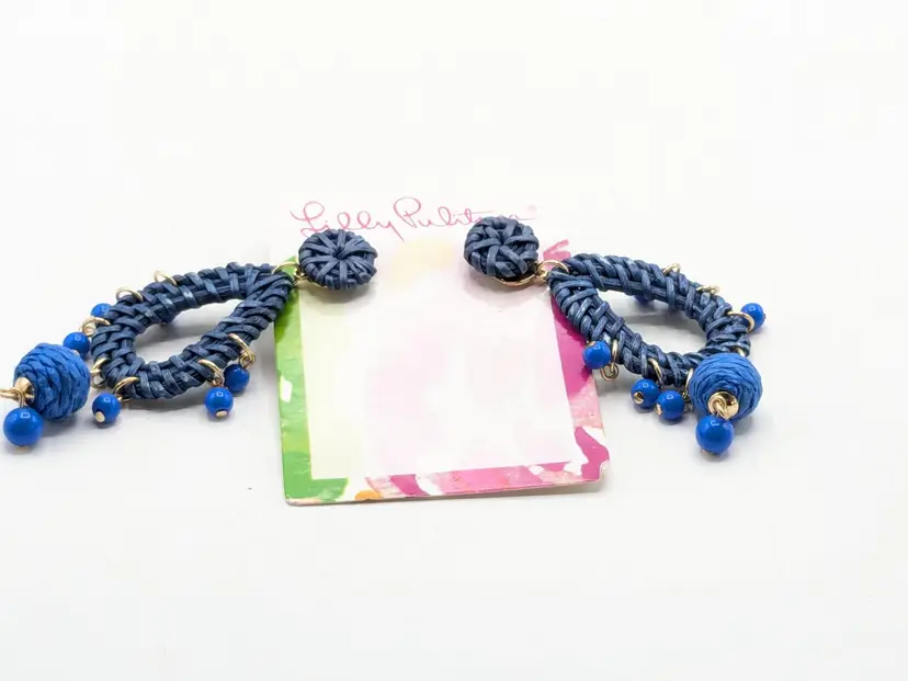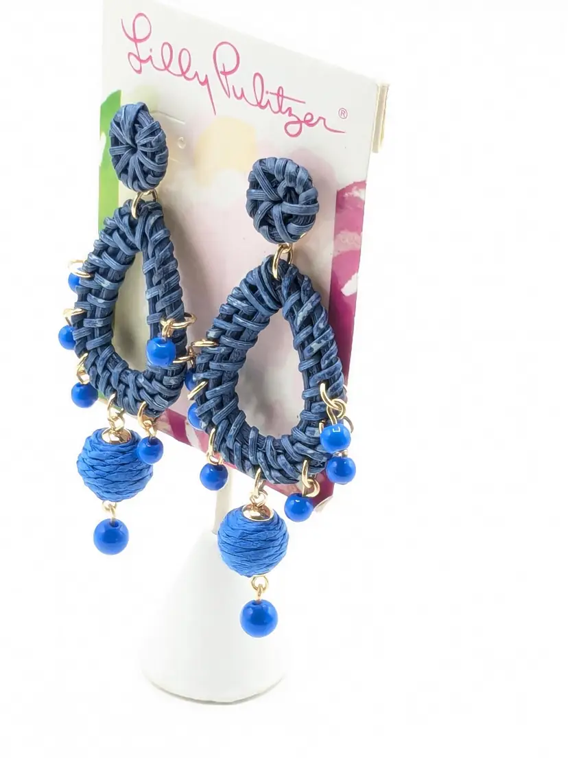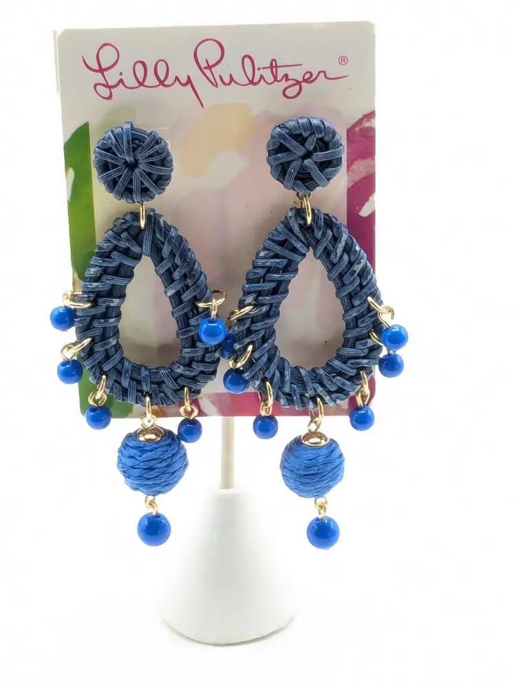 Vibrant and stylish, these Lilly Pulitzer earrings feature a unique blue woven design with playful bead accents. Good condition. New old stock. Measures 4" length and 1 1/2" wide. EN2