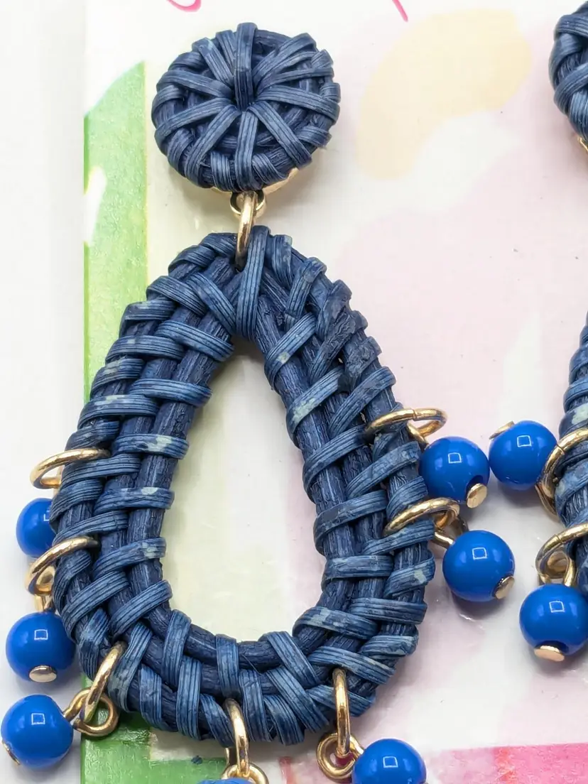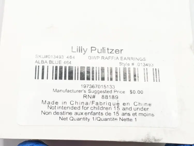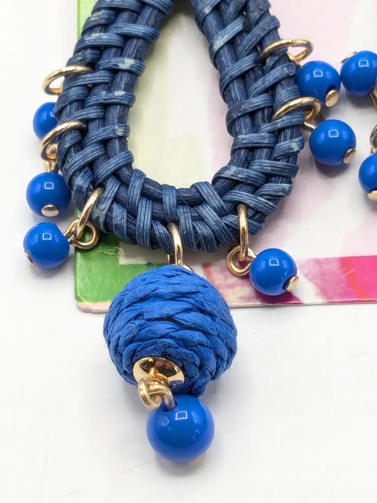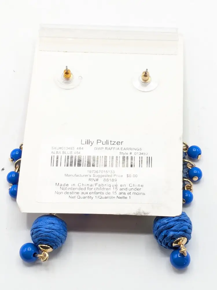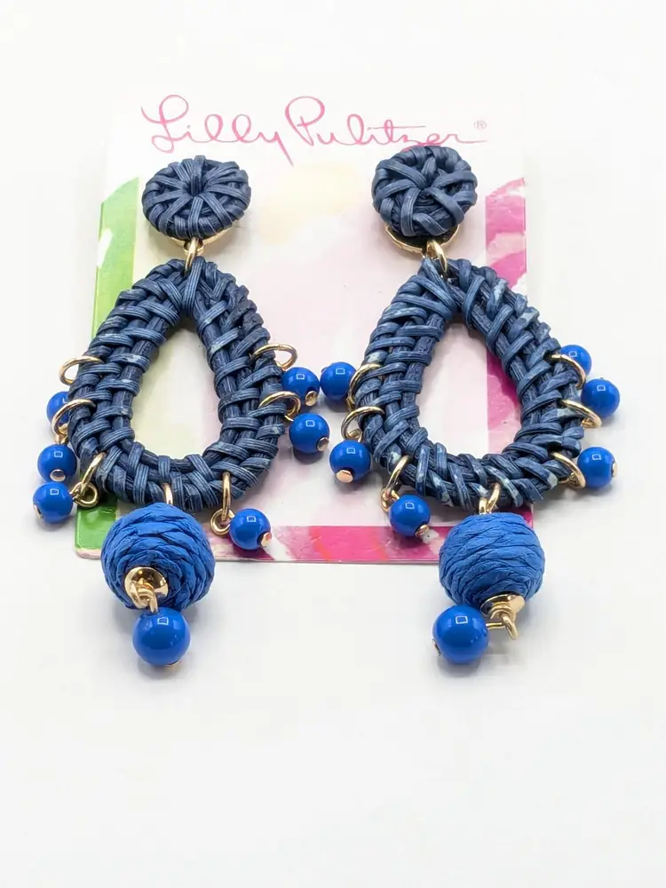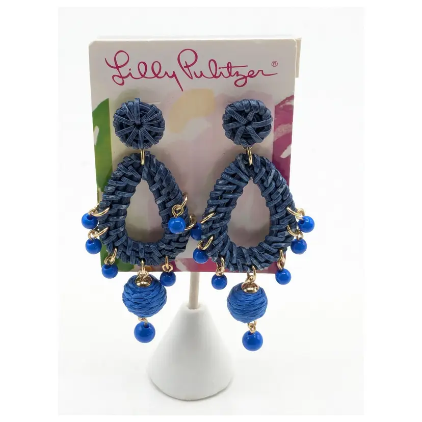 Vibrant and stylish, these Lilly Pulitzer earrings feature a unique blue woven design with playful bead accents. Good condition. New old stock. Measures 4" length and 1 1/2" wide. EN2