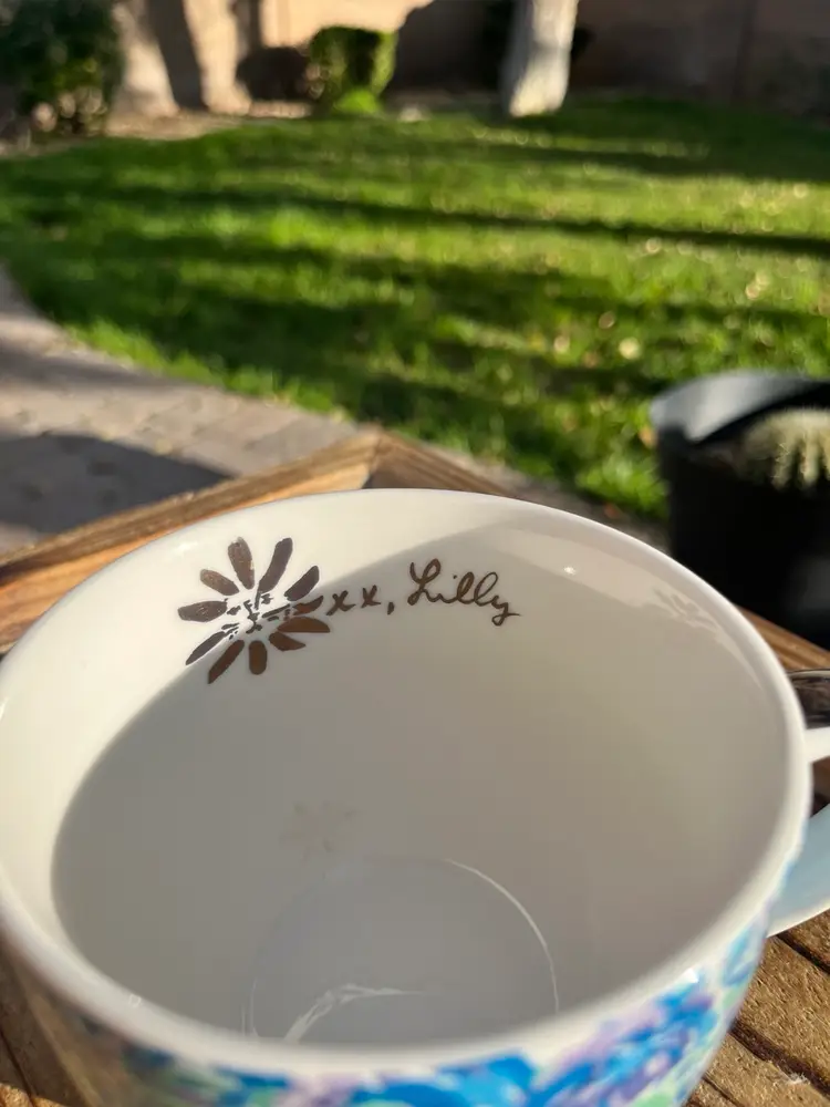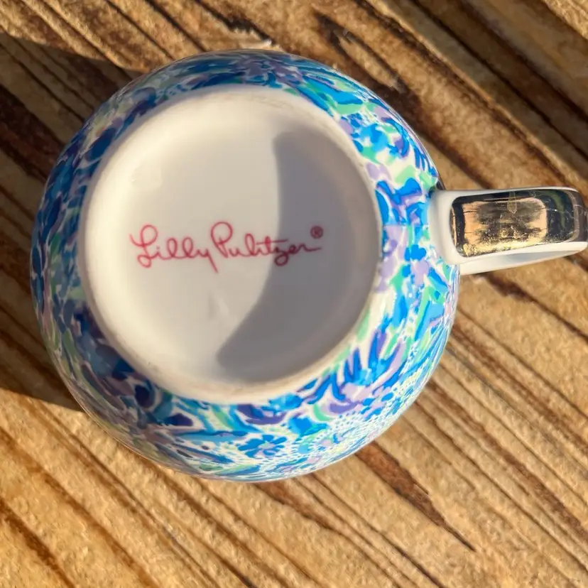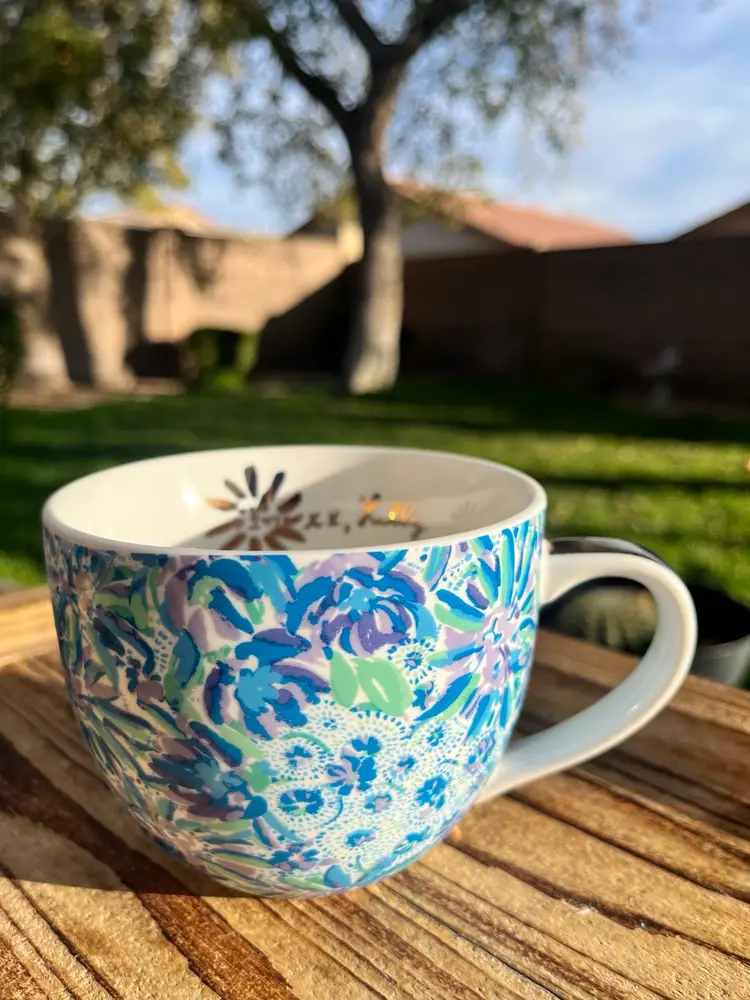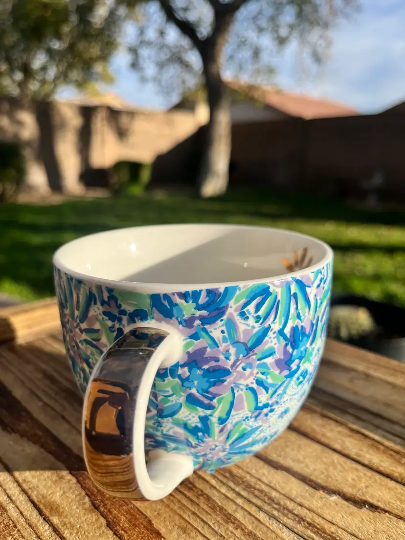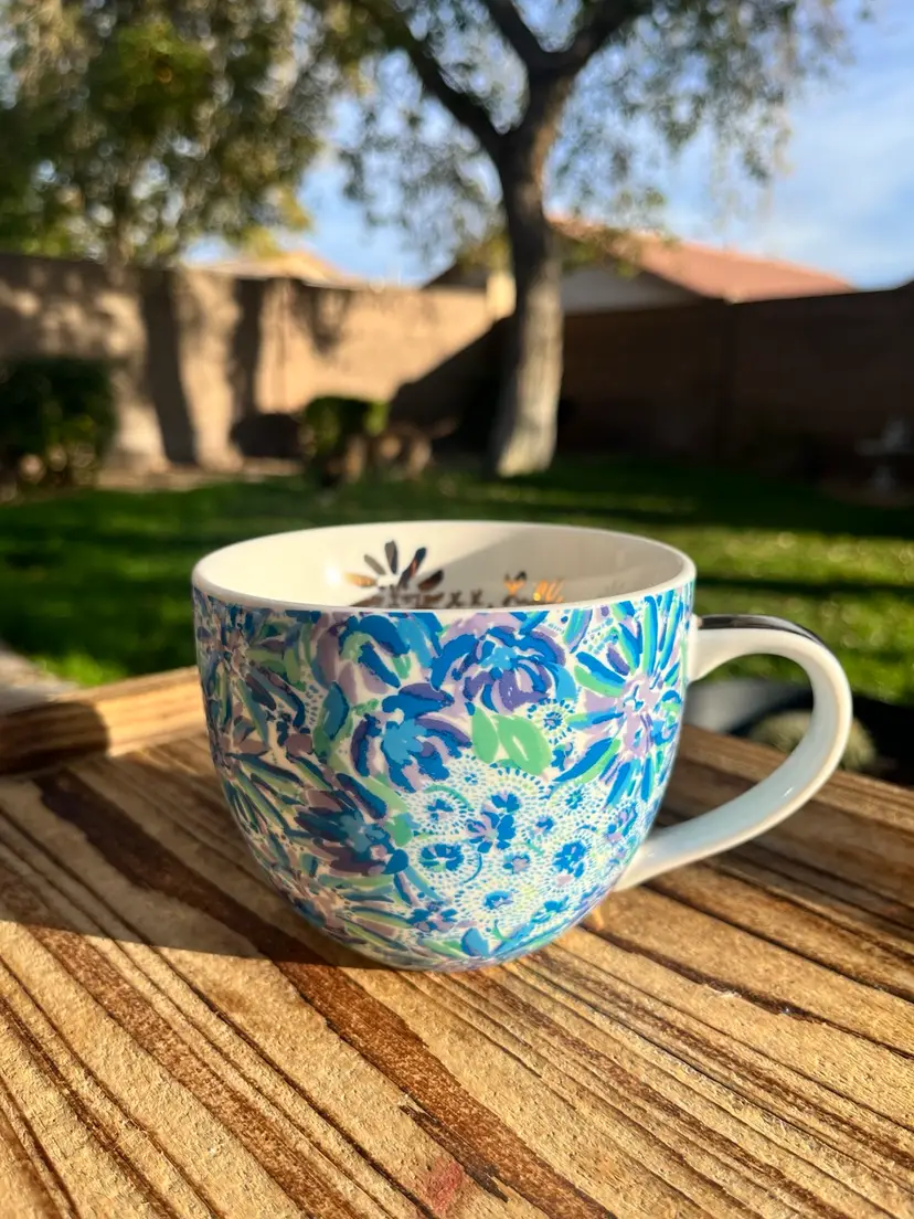 Beautiful mug that just makes you happy when sipping coffee or tea do to all the gorgeous bright colors of lavender, blues and green. 31/2” tall