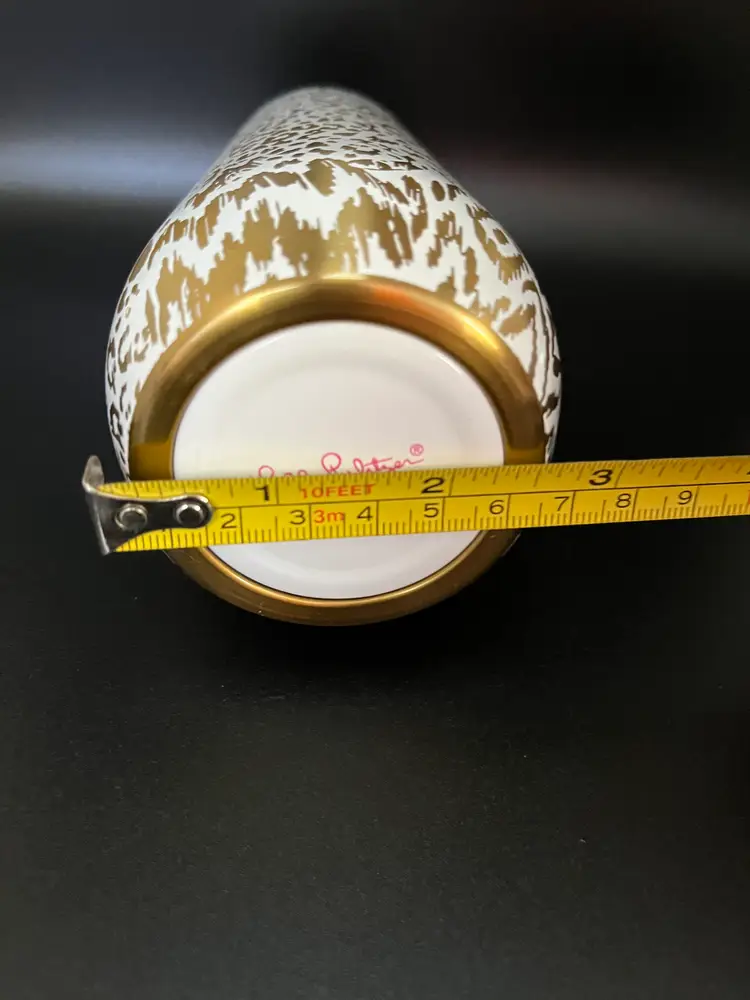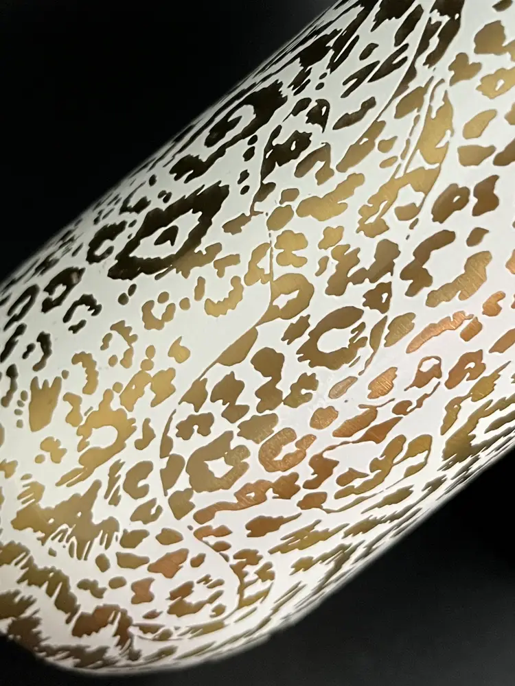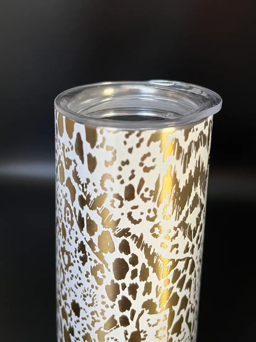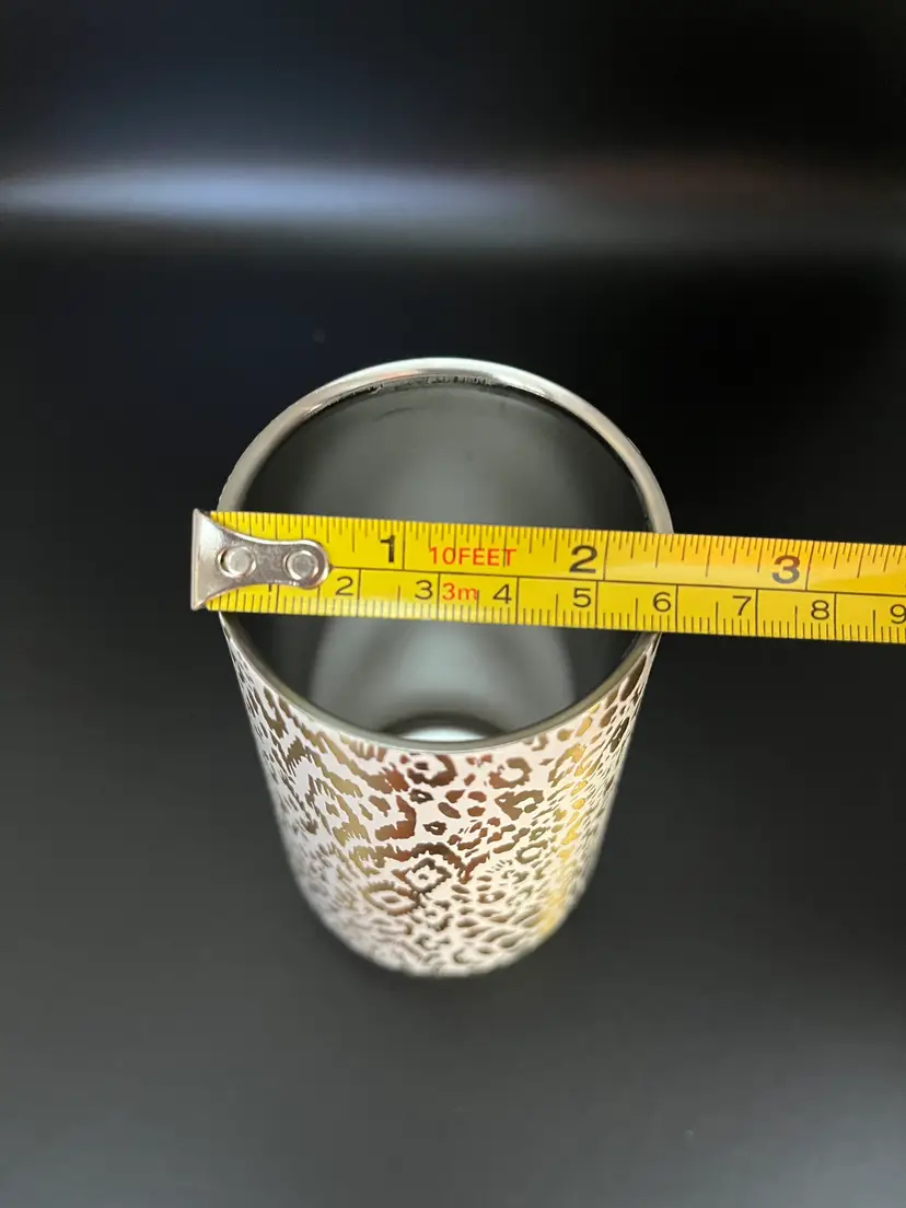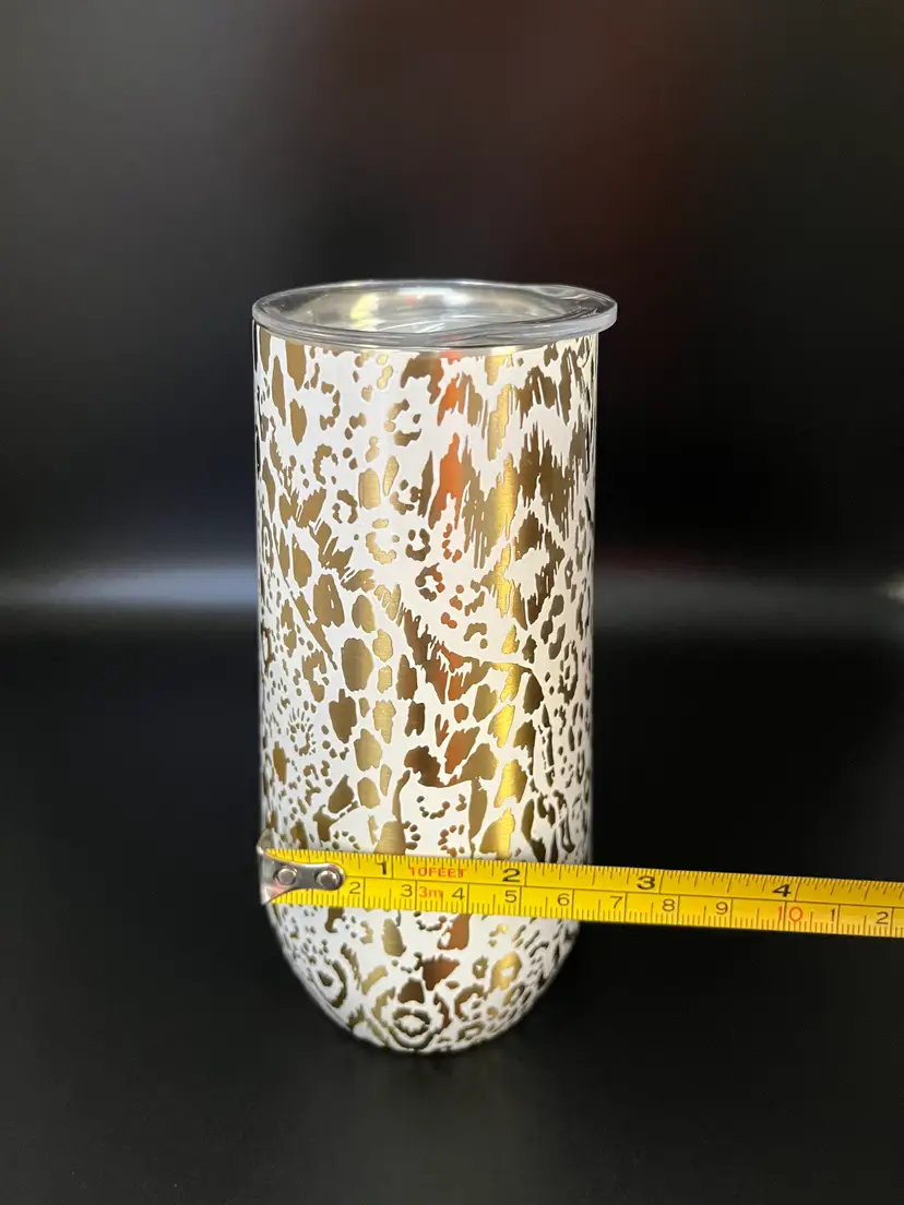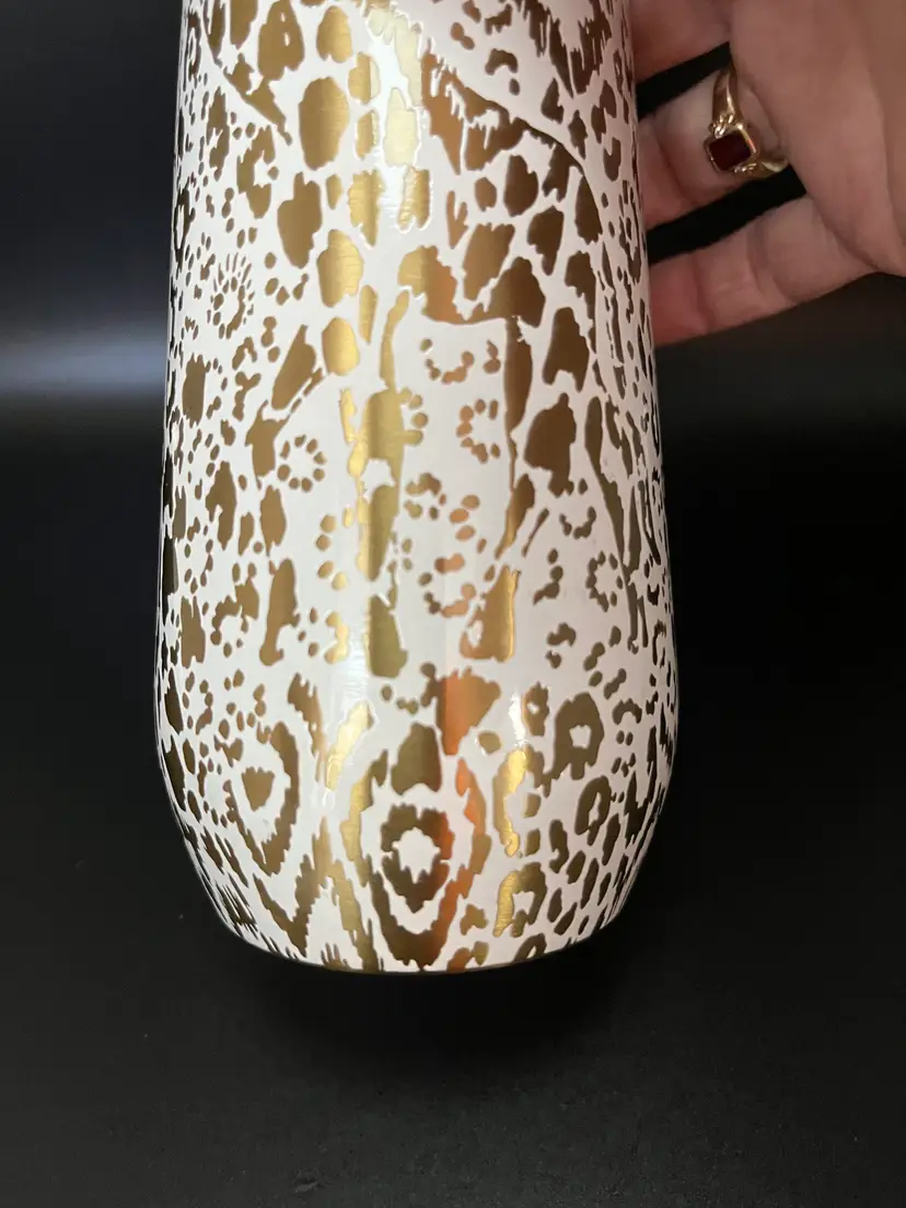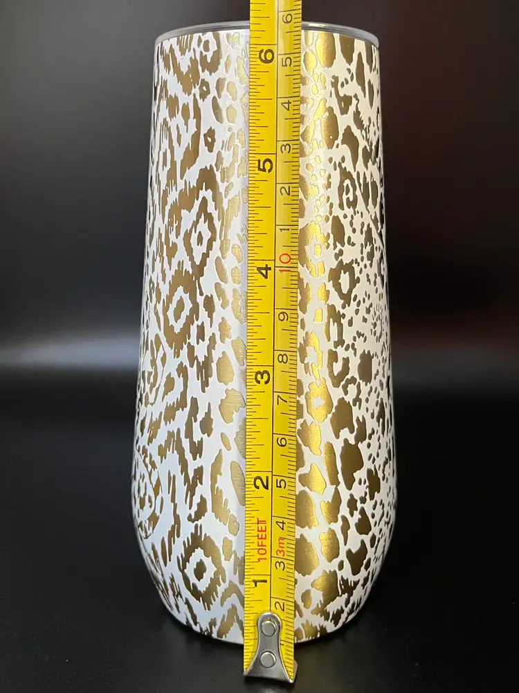 Sip in style with this 10 oz. steel chic durable double wall insulated champagne flute tumbler featuring a striking gold patern "Play" print that features a giraffe and a jaguar. Plastic lid with straw opening. Slim base fits in most cupholders. A great gift for fashion-forward friends or a fun addition to your own collection. Small flaw on lid see last picture before purchasing. SKU B106
