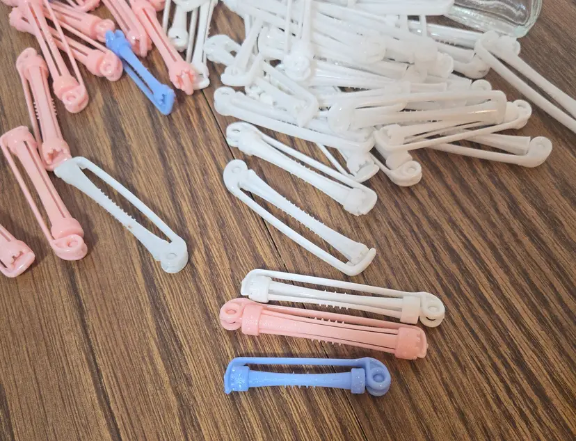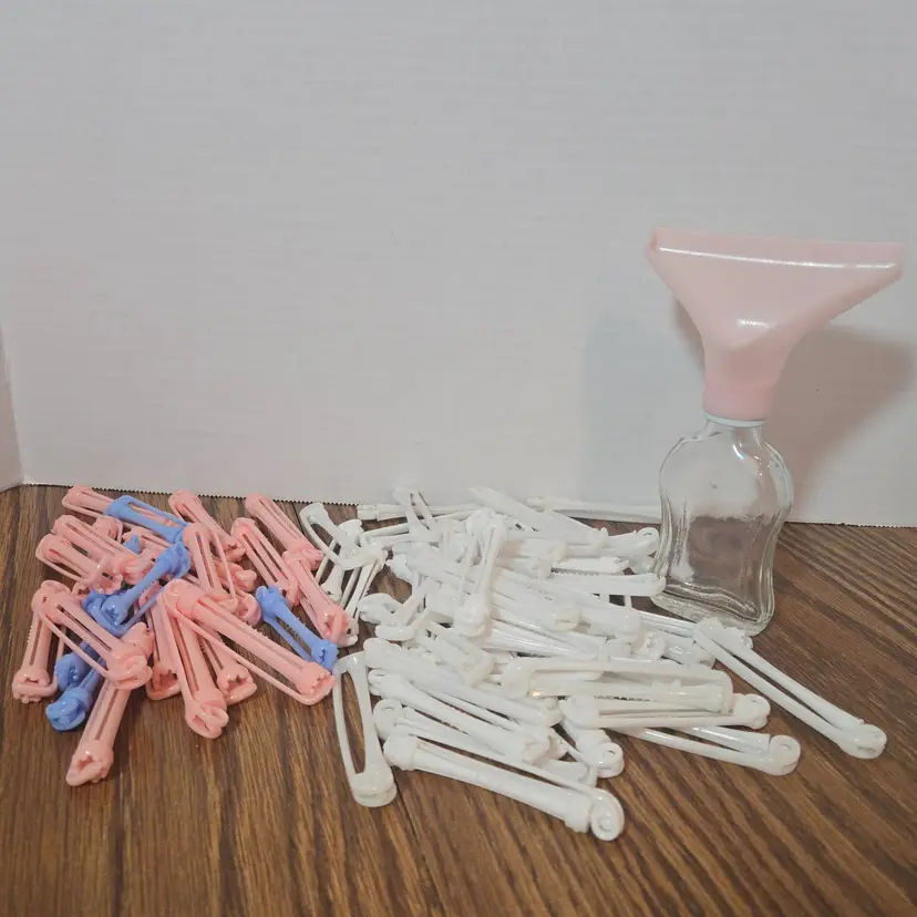 I've included curlers that I think were from this same set. There are 18 white curlers and 18 pink curlers that are about 3" long. There are also 6 smaller blue curlers, about 2" long. I will also toss in some roller papers that I found (not pictured) but I'm not sure if they went with this set.