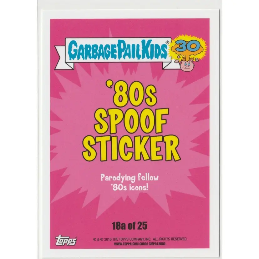 Brand: Topps Autographed: No Genre: Comedy, Parody, Satire Country/Region of Manufacture: United States Year Manufactured: 2015 Graded: No Card Size: Standard Manufacturer: Topps Card Condition: 400010 Language: English Type: Non-Sport Trading Card Vintage: No Franchise: Garbage Pail Kids Original/Licensed Reprint: Original Features: Base Set, Sticker Material: Card Stock Set: Garbage Pail Kids - 30th Anniversary Insert Set: '80s Spoof Sticker