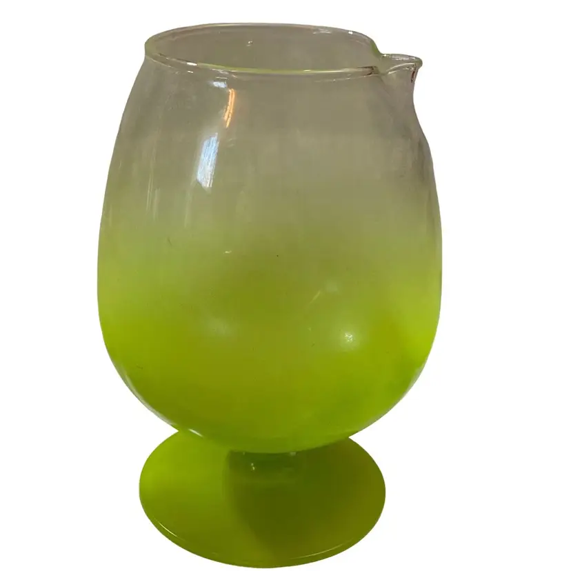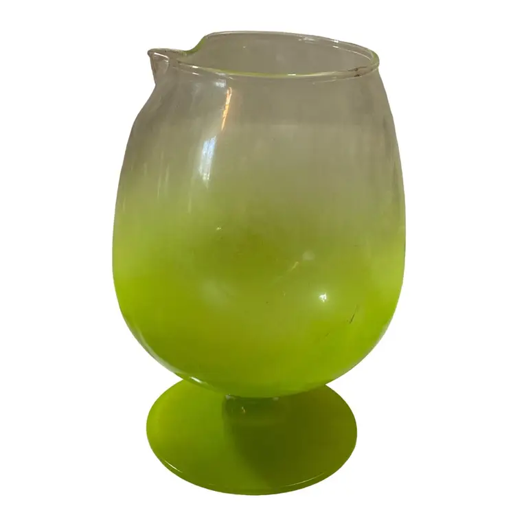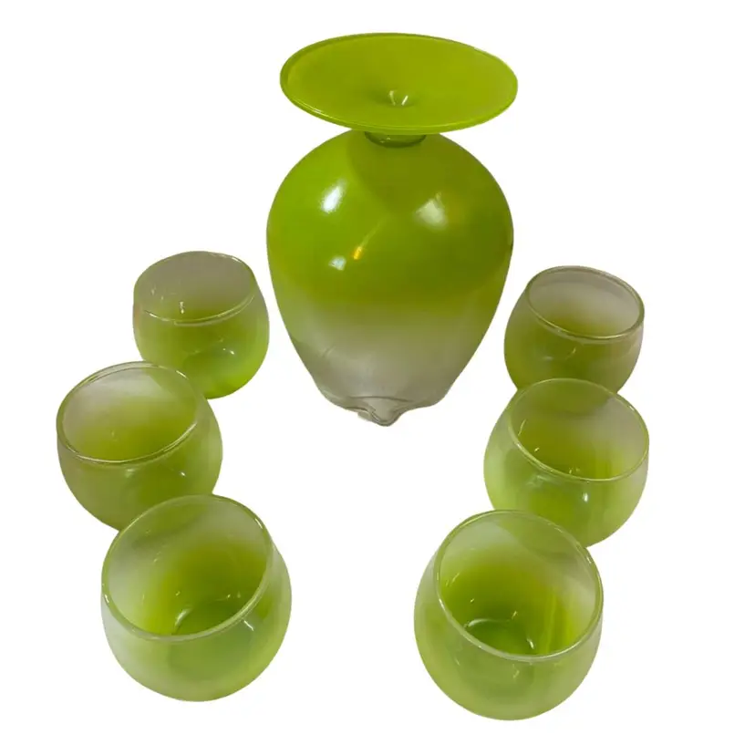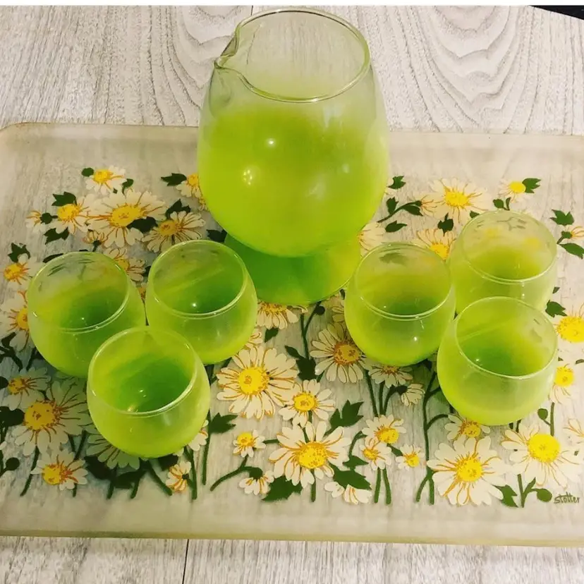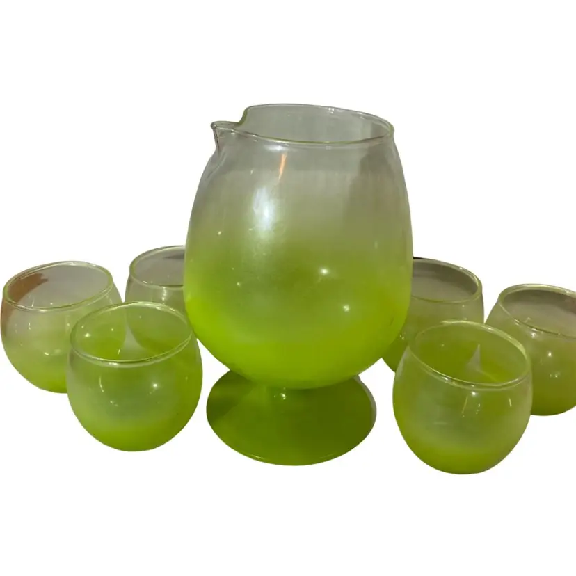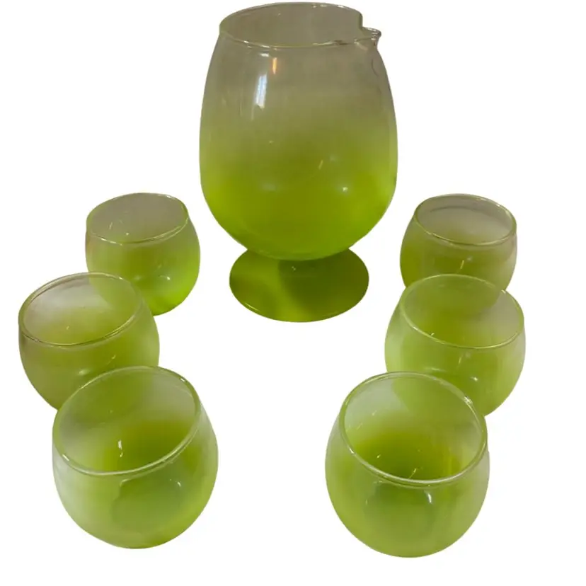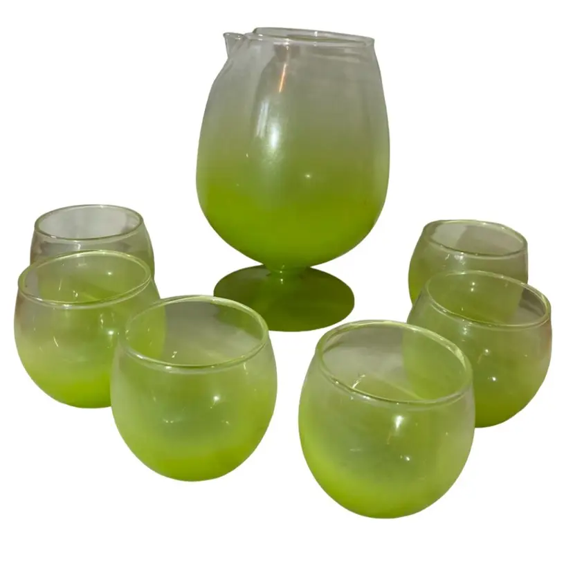 condition: no chips or cracks. on the pitcher there is a large black scuffing mark sorta the shape of a J. The glasses are mostly nice, BUT one glass has a black scuff mark, a brown scuffing mark and a few specks of the green blendo scratched off. Please refer to photos and look them over carefully as they are part of my description.