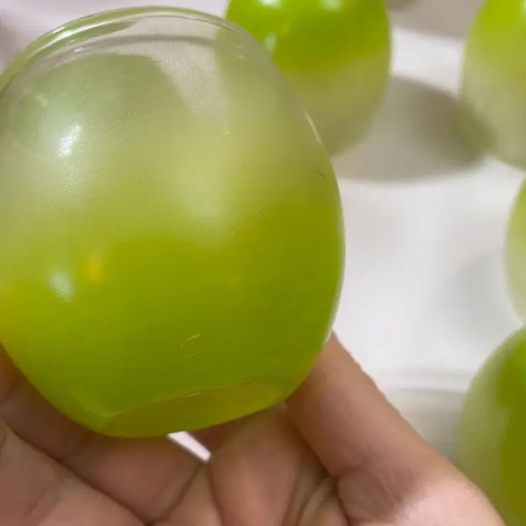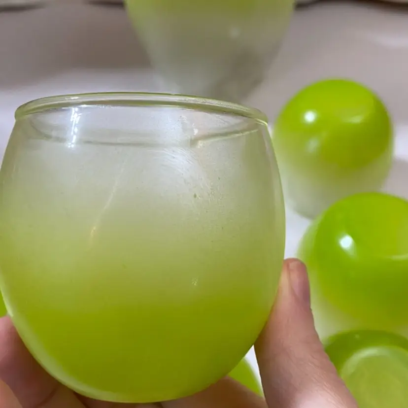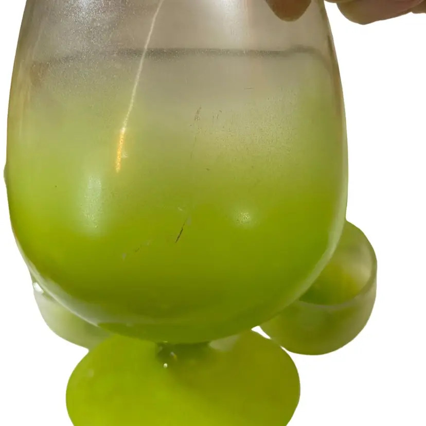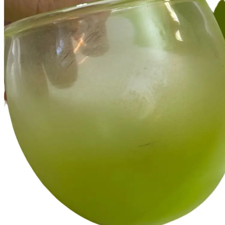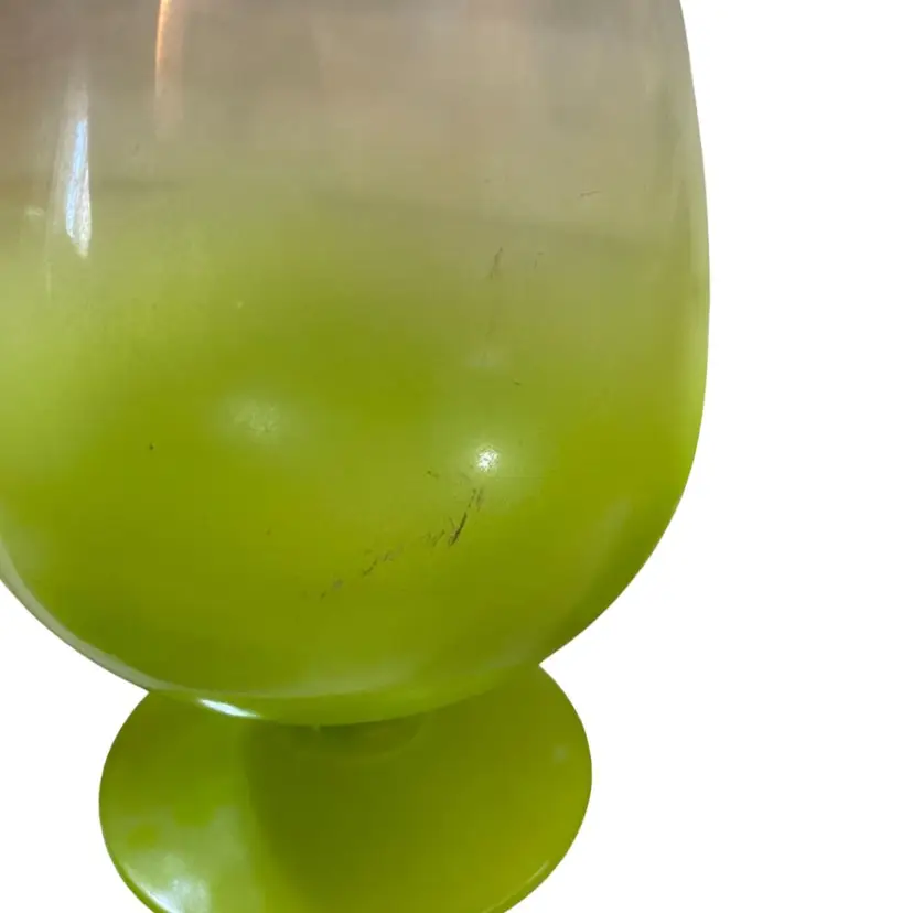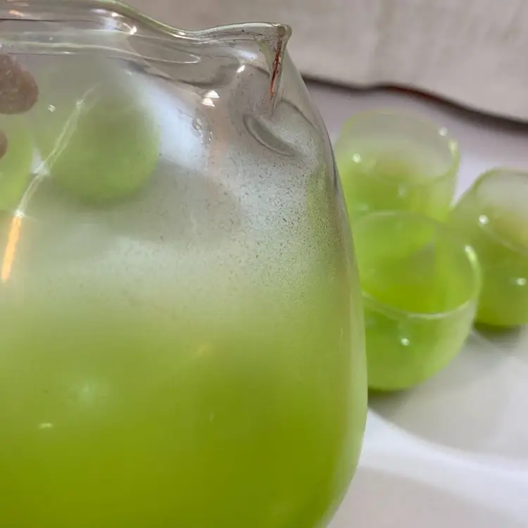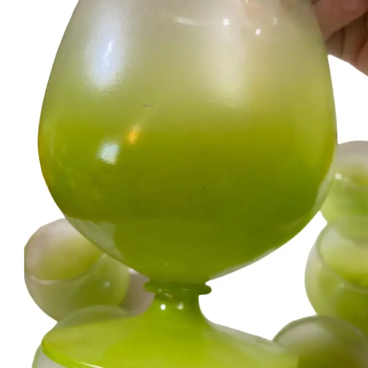 condition: no chips or cracks. on the pitcher there is a large black scuffing mark sorta the shape of a J. The glasses are mostly nice, BUT one glass has a black scuff mark, a brown scuffing mark and a few specks of the green blendo scratched off. Please refer to photos and look them over carefully as they are part of my description.
