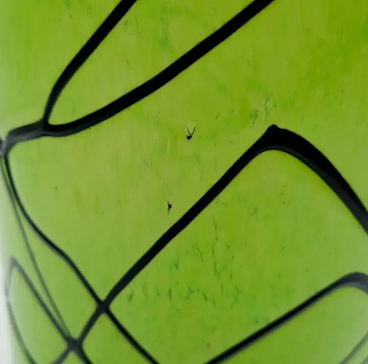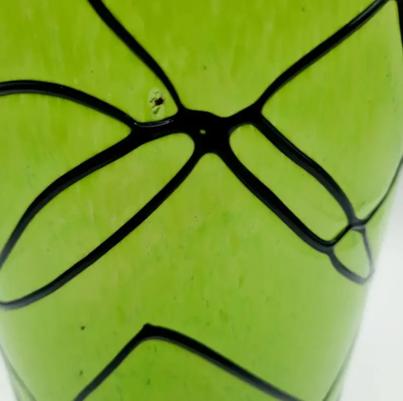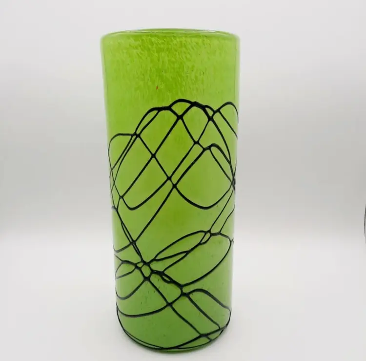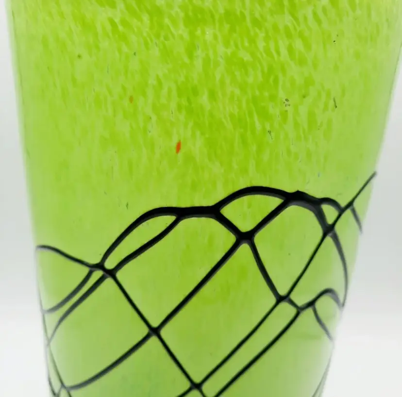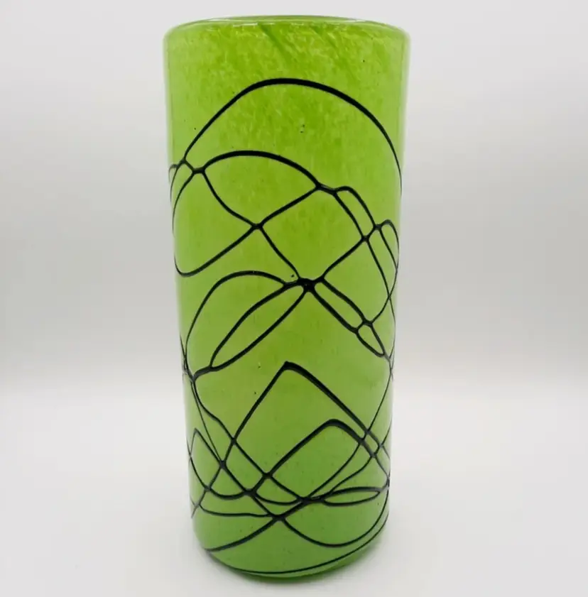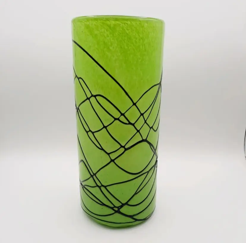 This beautiful handblown glass vase is 11 1/2"H x 5"W and weighs over 5 lbs! It has a few tiny chips where some air bubbles popped, but they are on the exterior only, you can't feel them on the inside of the vase.