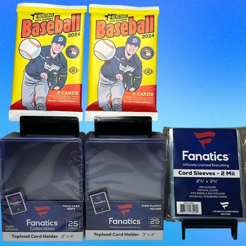 LIMIT 1 please! 2 hobby packs of 2024 Heritage High Number. 1 pack standard top loaders 1 pack thick 59pt top loaders 1 pack standard penny sleeves This is a stacked shipping item and will not ship until the “shipping request” is purchased for $5 or you have an item purchased that includes free shipping to combine it with. There is no deadline to purchase shipping and your stack is saved indefinitely.