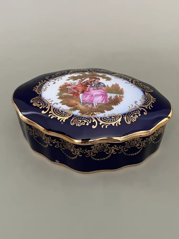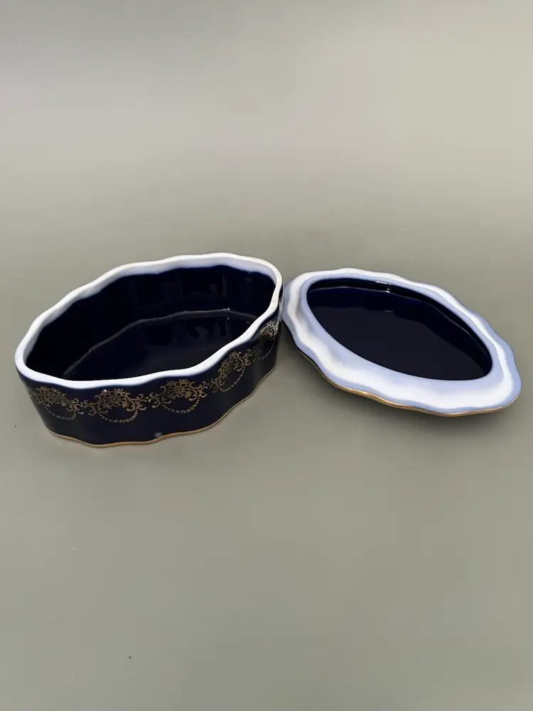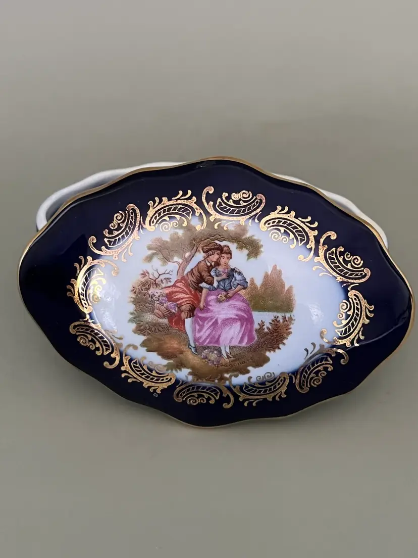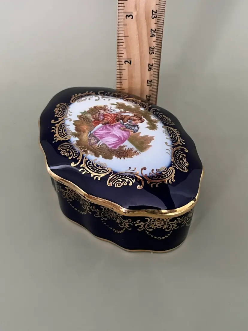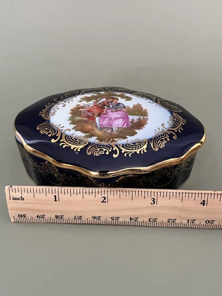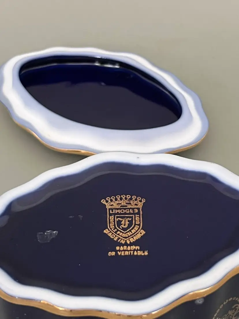 Excellent condition. Limoges cobalt blue with 22K markings. 4” long and 1 1/2 “ high.