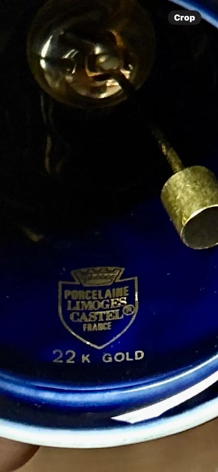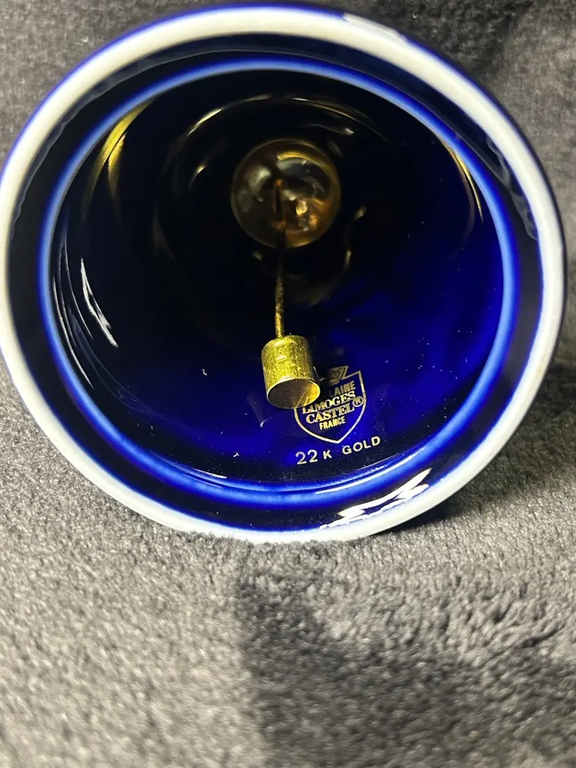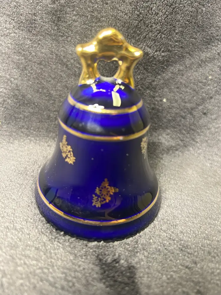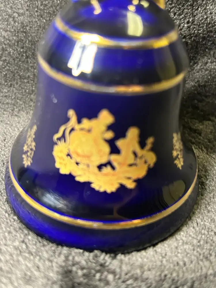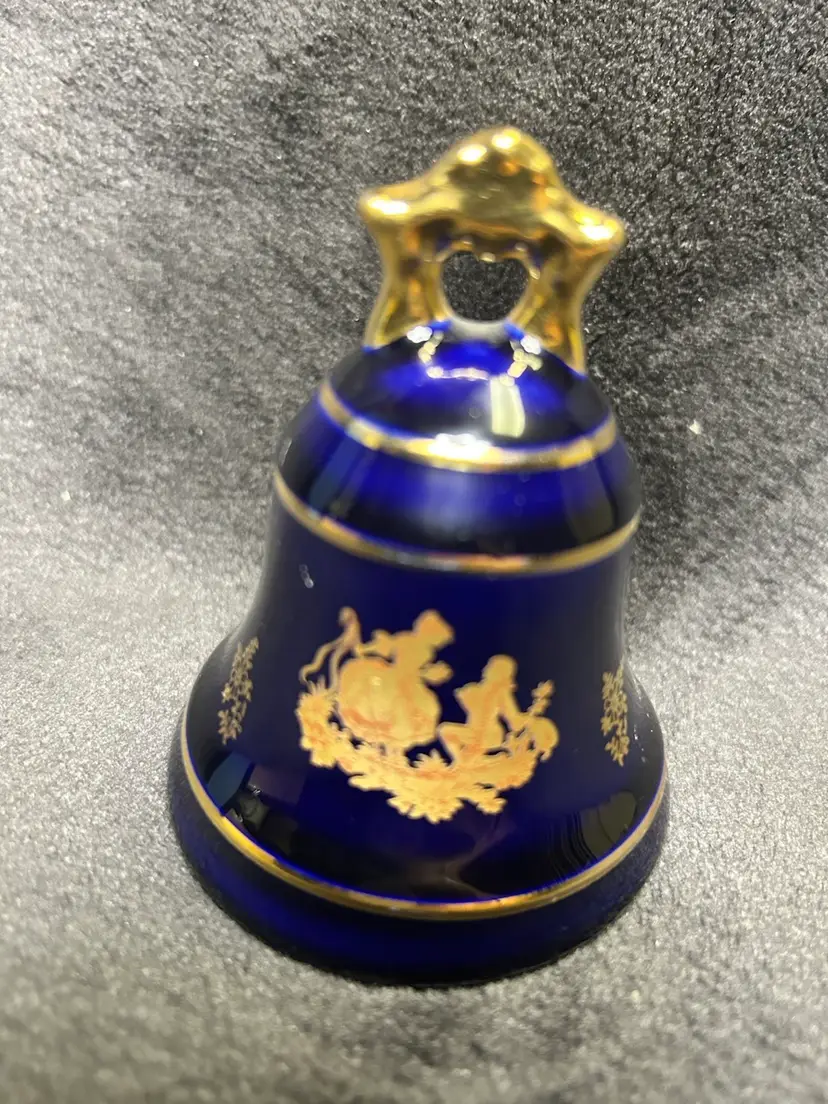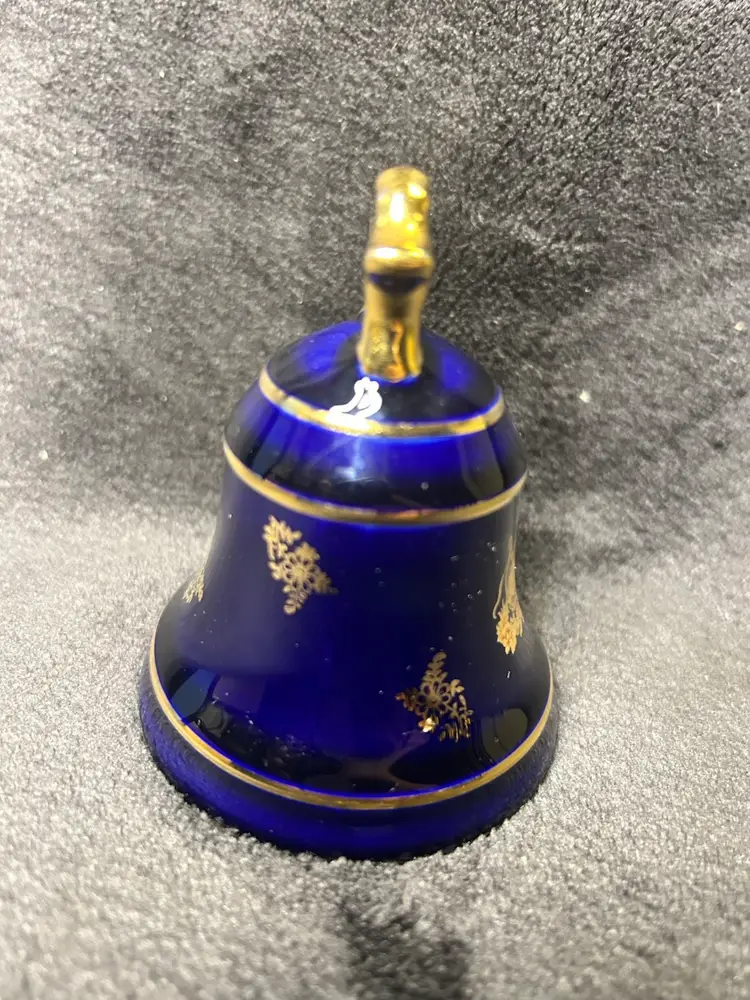 The Limoges Castel Porcelain Cobalt Blue 22k Gold Bell is a small, round bell made of porcelain, hand-painted in cobalt blue with 22k gold accents. Made in France during the late 20th century, this original decorative collectible exudes a romantic theme and