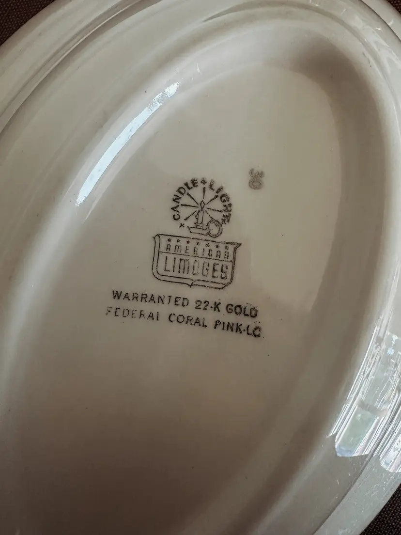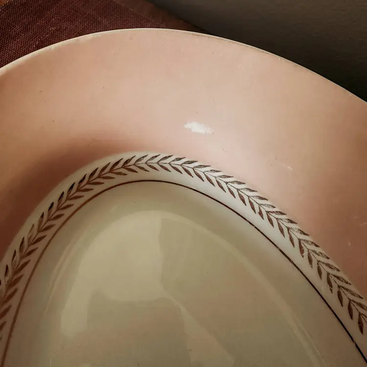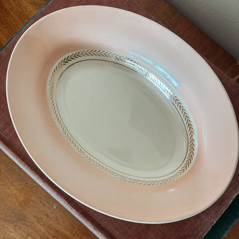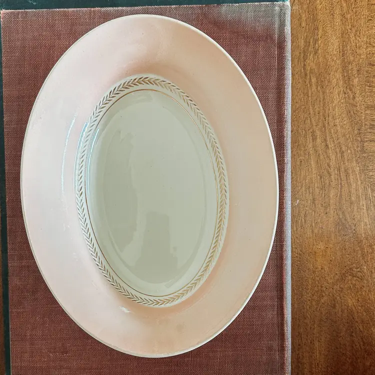 Perfect for spring or Valentine's day! This petit serving bowl measures 10 inches in length, 6 inches in width. Beautiful Coral Pink Color! No chips or cracks but has a discoloration mark on the pink edge ( shown in the 3rd photo) Made in the 1960s