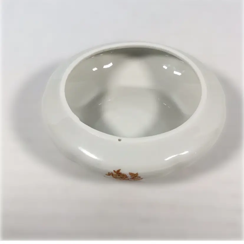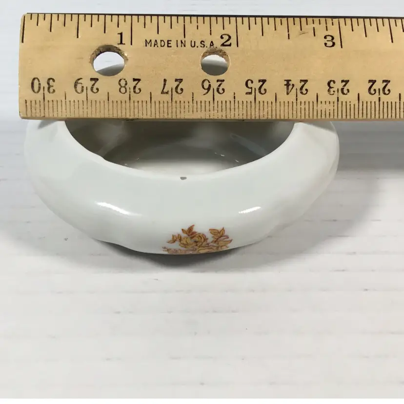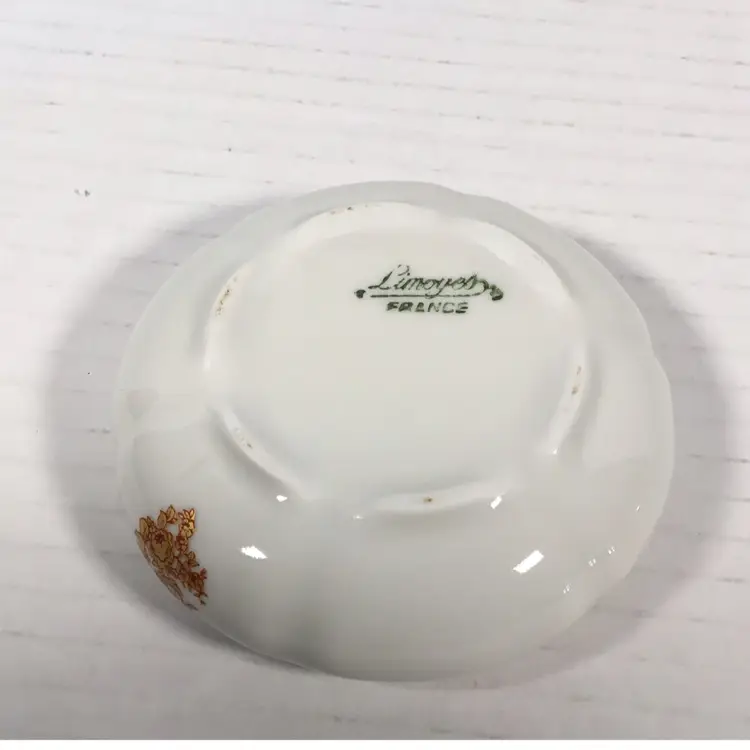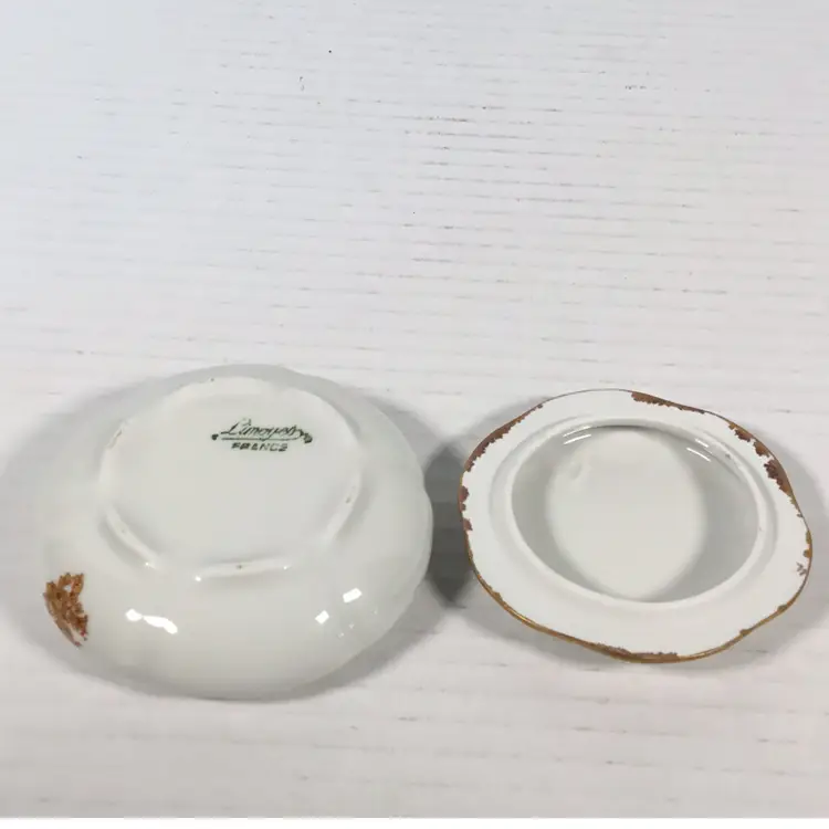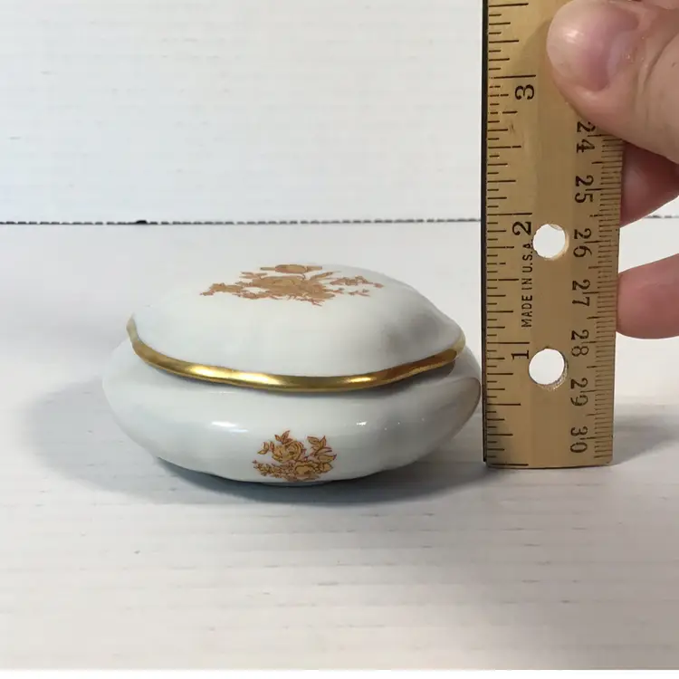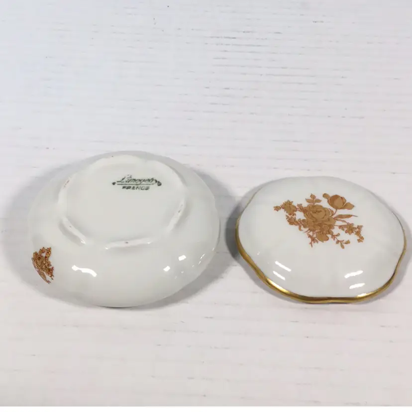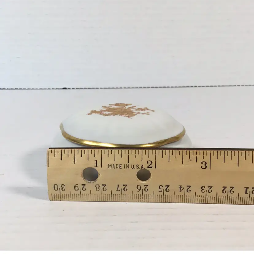 This is a beautiful Limoges trinket/vanity box. It has gold trim accents and a floral bouquet motif. Floral accents are non both the top and side. It measures 1 1/2” tall and 3” wide