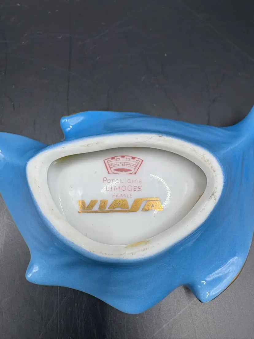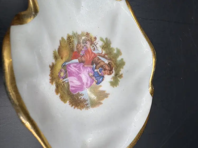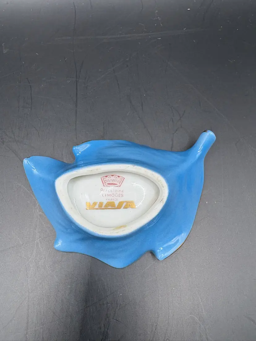 Limoges leaf shaped trinket dish Porcelain Fragonard motif… courting couple Top is white and side base is blue Viasa marking is from Viasa Airline which is a Venezuelan airline which went out of business in 1997 Research indicates that they faces out this dish out in 1970