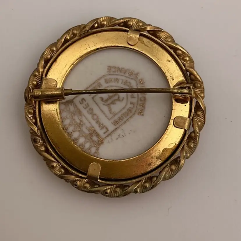 1.75 inch diameter Good condition. There is a small green spot/tarnish on the left side of brooch.