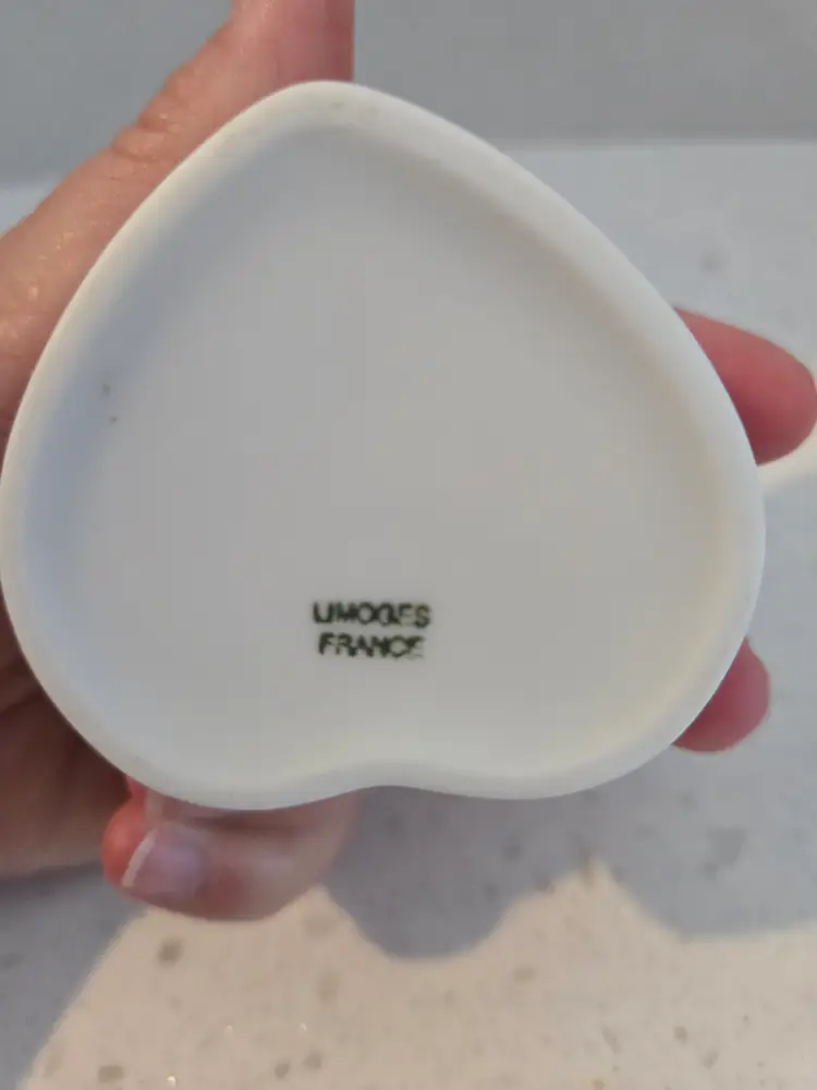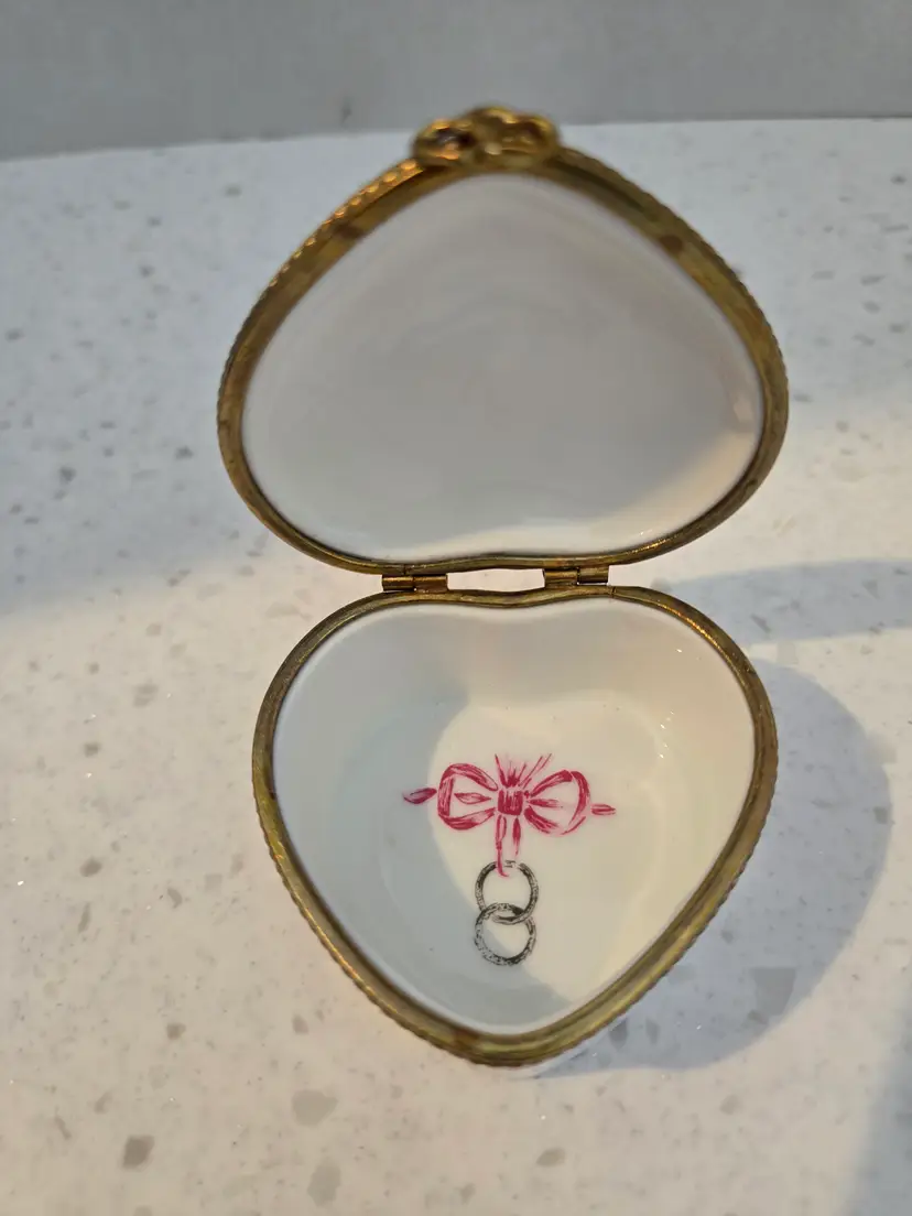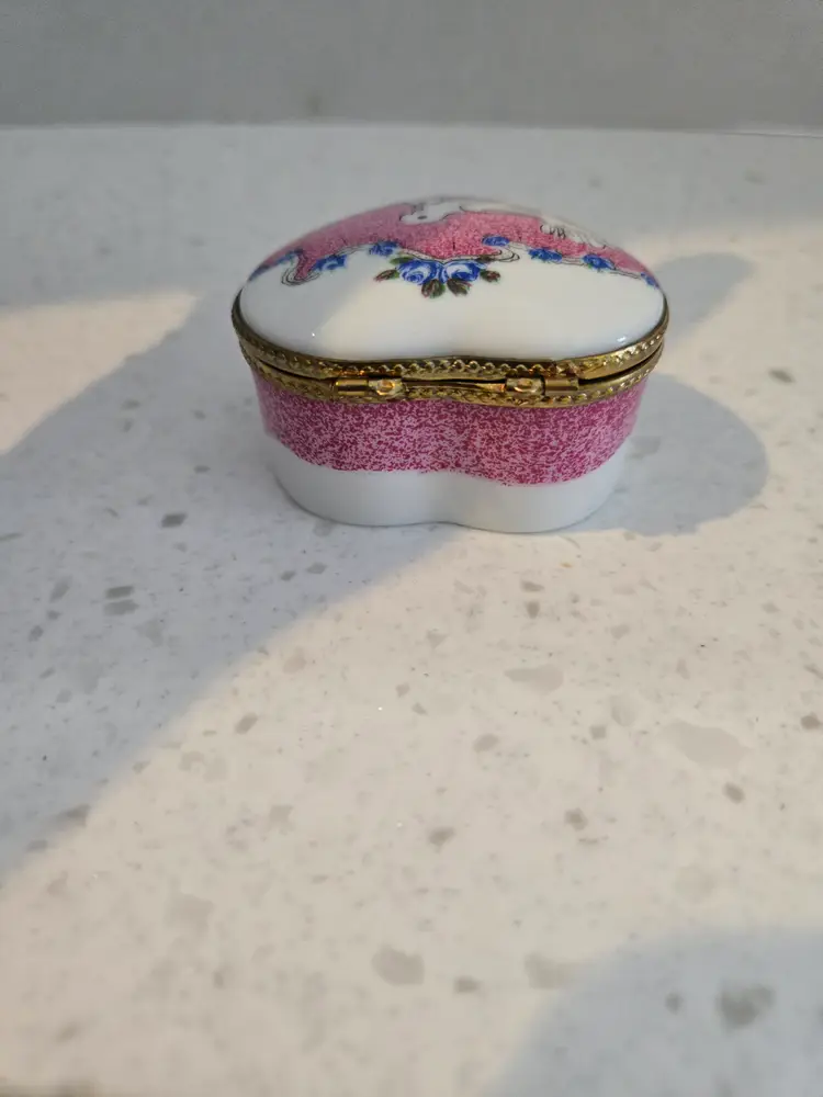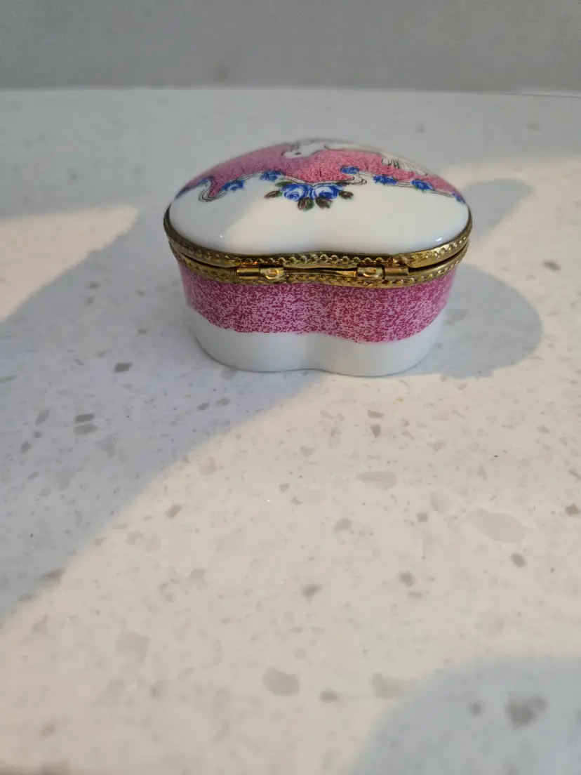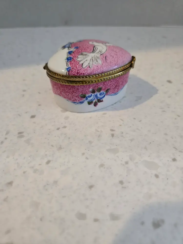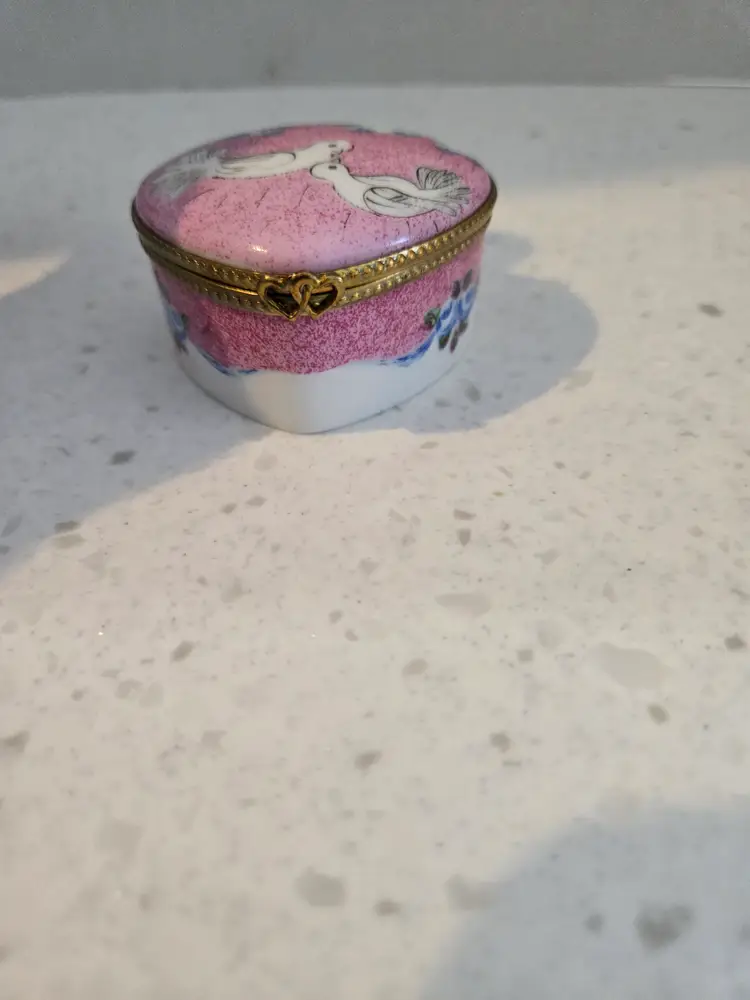 Limoges Trinket box feaures doves and classic Limoges tiny flowers, tiny gold toned hearts on clasp, 2¼" , no chips or cracks