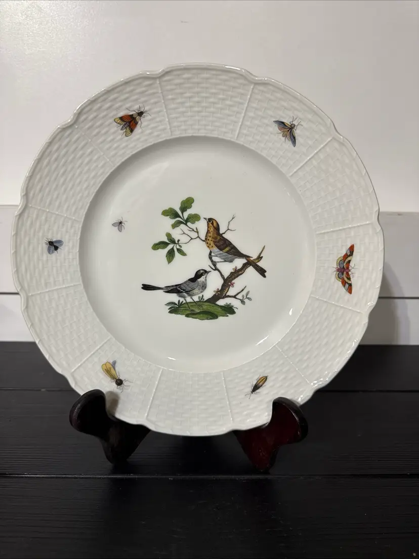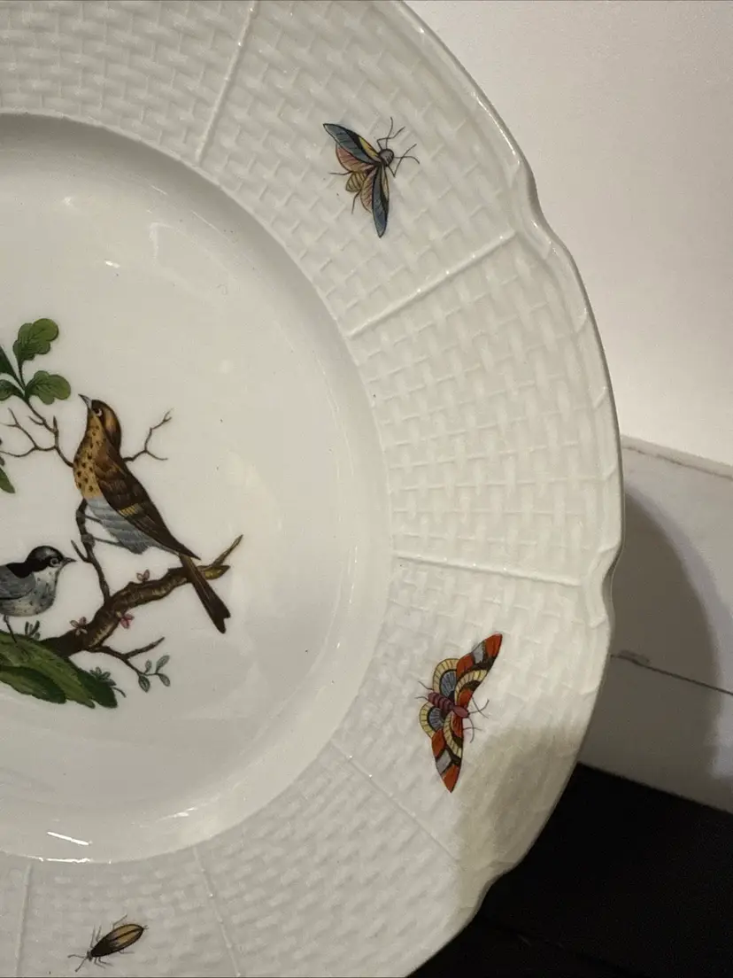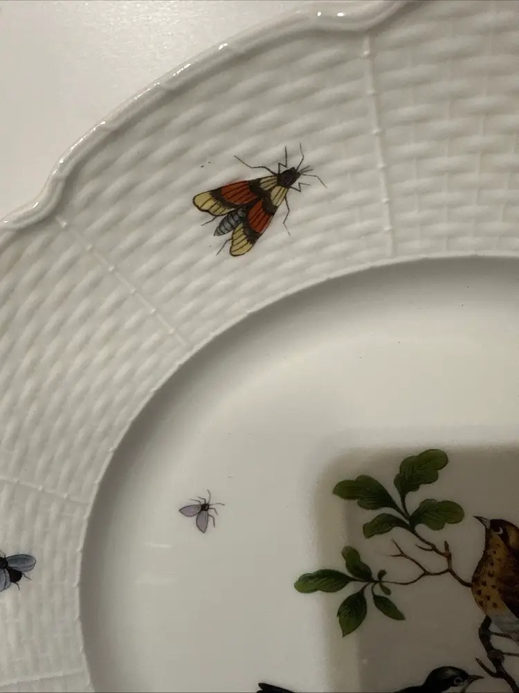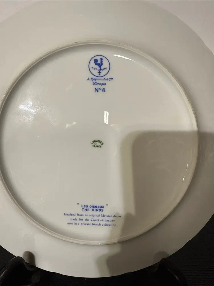 The product is a Ceralene Raynaud Limoges plate in the "Les Oiseaux" (The Birds) pattern. This pattern features various hand-painted birds and insects. The "Les Oiseaux" pattern is often compared to the Herend Rothschild Bird pattern, which was originally created for the Rothschild family in 1860. The plate is made of porcelain and is crafted in Limoges, France. It is a discontinued piece, and it is recommended to be hand-washed