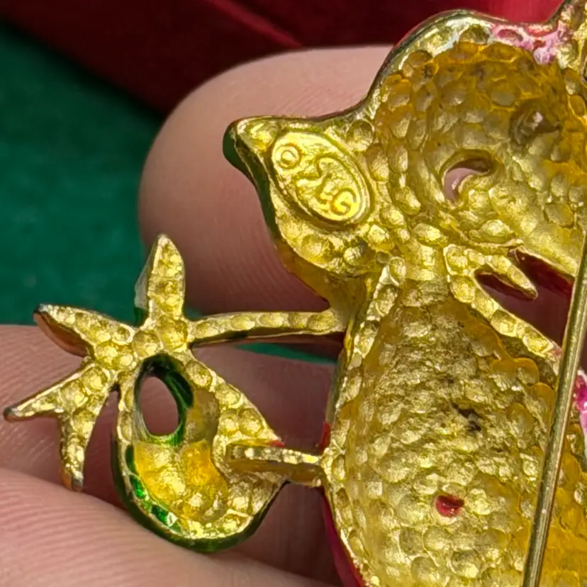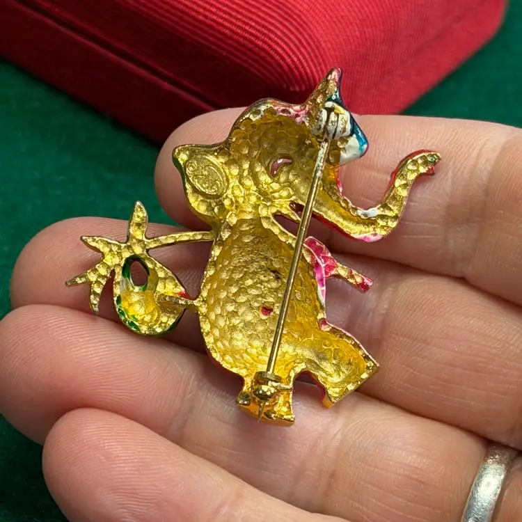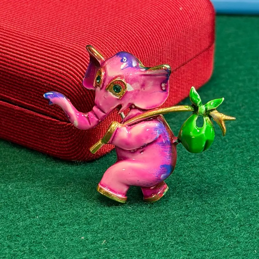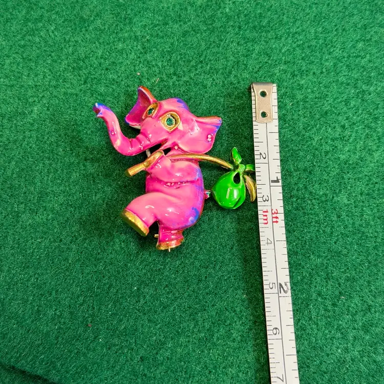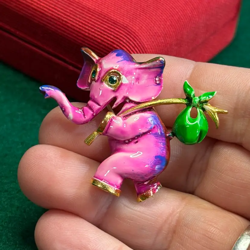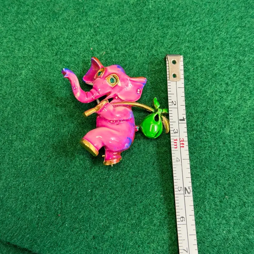 This charming elephant brooch is in good condition with only minor wear to the pink enamel. The brooch is marked and is about 1-1/2 inches tall.