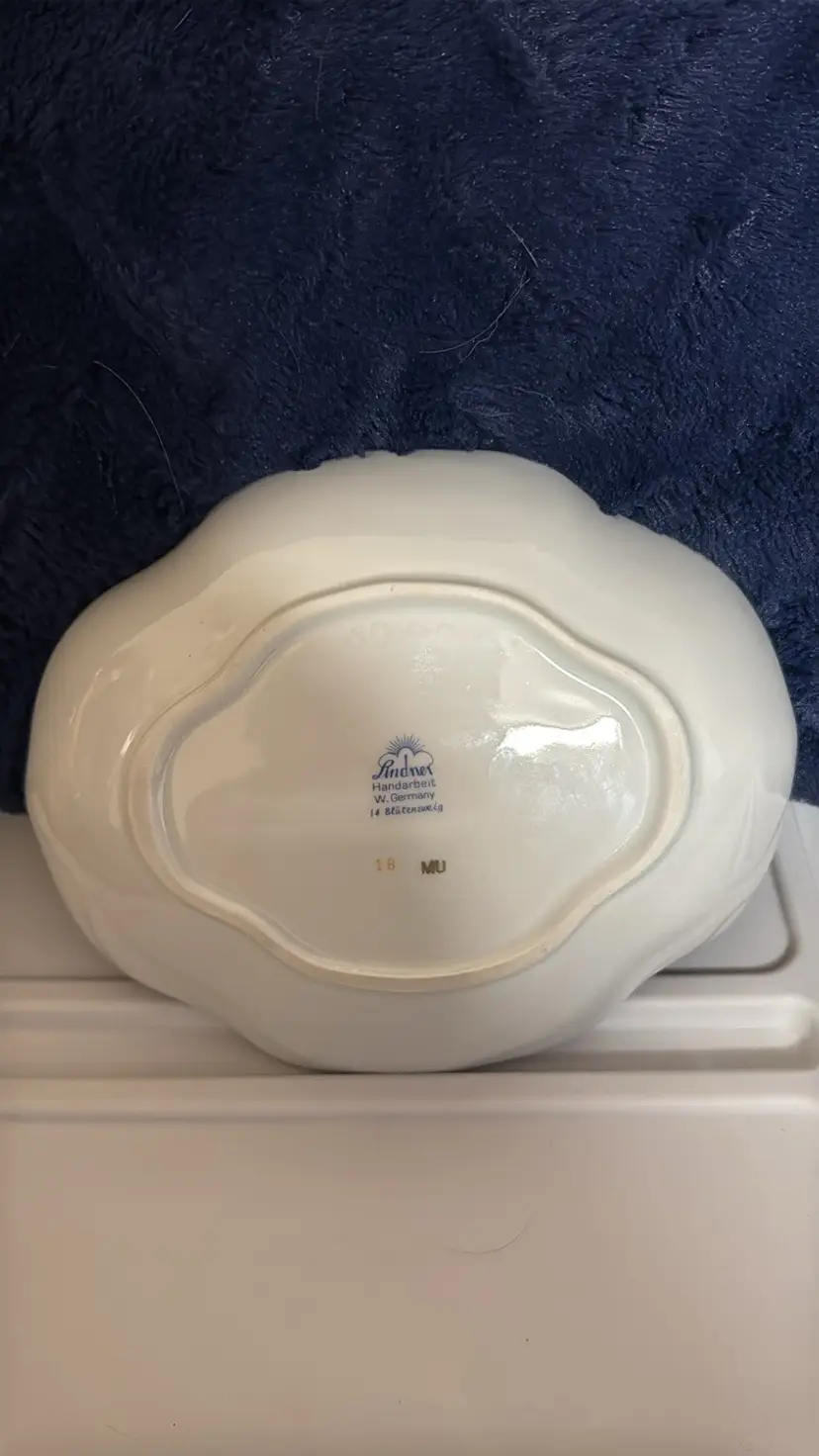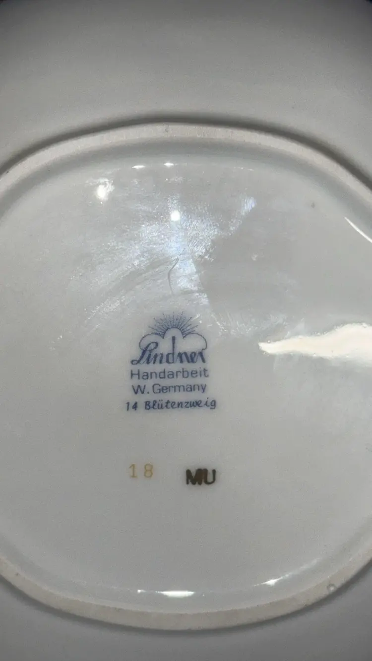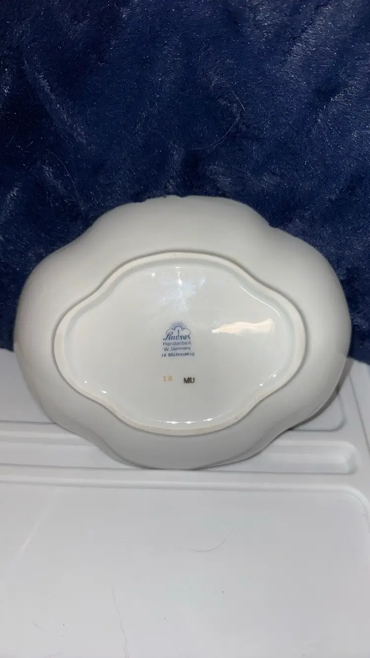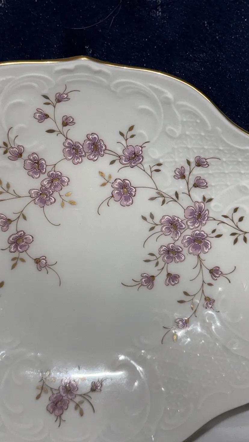 Lindner Handerbeit Blütenzweig W. Germany oval bowl hand painted 8” x 6.5” x 1 3/8” Gold trim and gold leaves with pink and purple flowers 6046 Beautiful like new condition no breaks or chips (51224245)