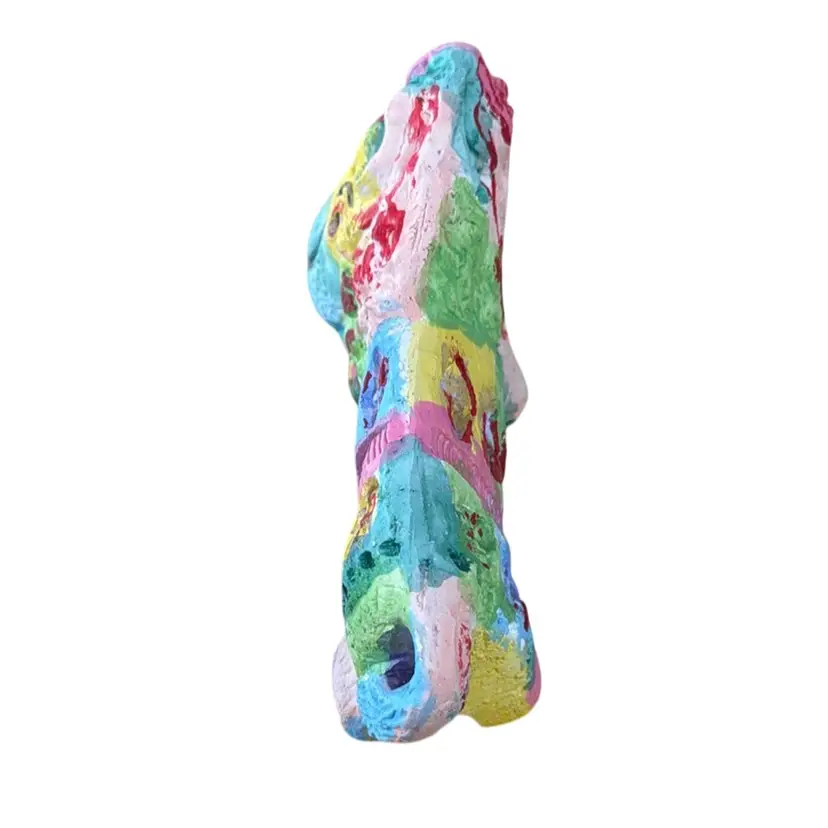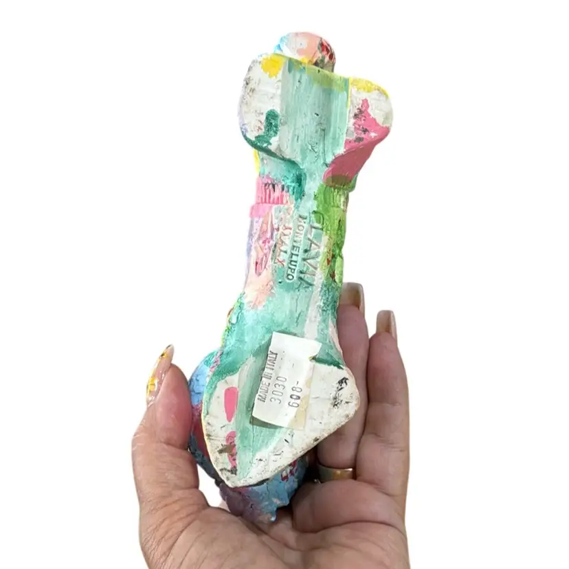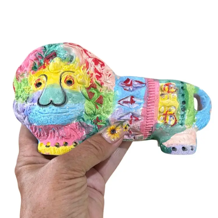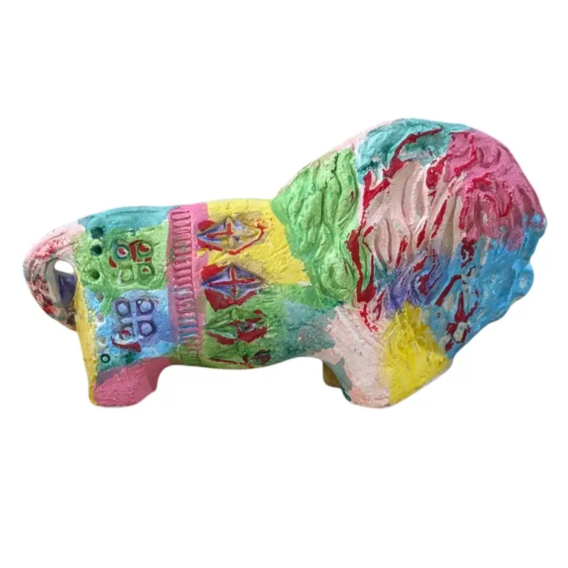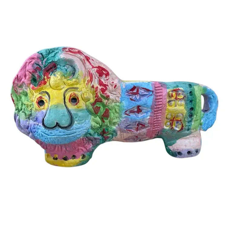 The image shows a colorful Bitossi lion figurine. Bitossi is a well-known Italian ceramics company, and their Rimini collection features animal figures like this lion. These figures are handcrafted from white refractory clay and decorated loads of color. The lion's mane and body are typically decorated by hand with patterns engraved on the fresh clay to create a textured finish. These pieces are considered collectible examples of mid-century Italian design