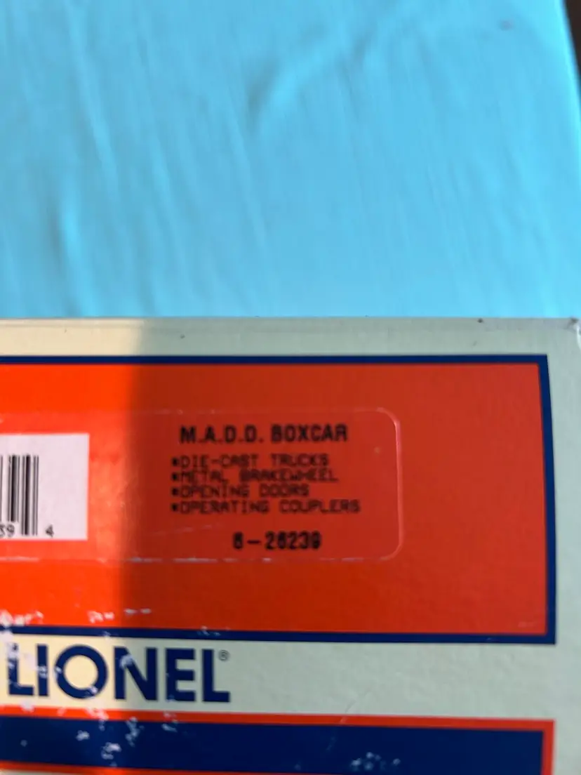 Lionel 6-26239 Mothers Against Drunk Driving Boxcar with Box The box has some ware. I did not test run the train car on my layout. Take a look at the pictures for more details about the train cars. Feel free to ask any questions about the item. The item is used and being sold as is.