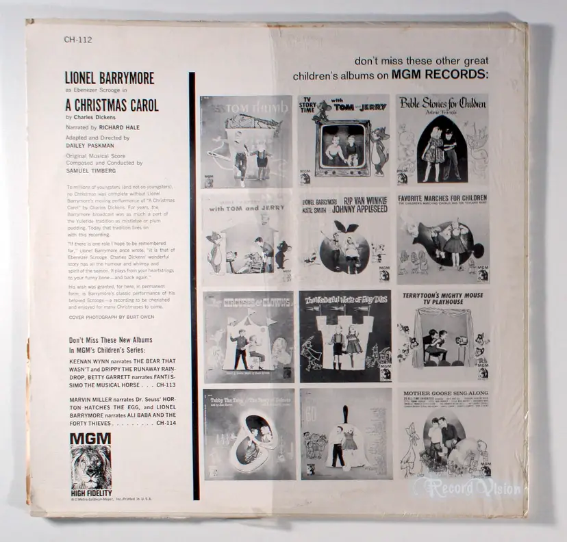 A Christmas Carol / Beloved Hymns & Carols, by Lionel Barrymore, released by MGM Records, features a narrated adaptation of Charles Dickens’ A Christmas Carol on Side A, with Barrymore delivering a memorable performance as Ebenezer Scrooge, a role he played on radio for nearly two decades starting in 1934. Side B includes a selection of cherished Christmas carols performed by the Canterbury Choir under Macklin Marrow’s direction, such as Deck the Halls, God Rest Ye Merry Gentlemen, and O Holy Night. The album, initially released in 1947 on shellac and later on vinyl in 1950, became a holiday tradition, re-released multiple times due to its popularity and Barrymore’s iconic portrayal. Its historical significance lies in cementing Barrymore’s association with Scrooge, a role he cherished, and its contribution to the mid-20th-century revival of Christmas traditions. No specific tracks from the album are noted as hit singles, as its prominence stems from the narrated story and collective carols rather than individual chart success.