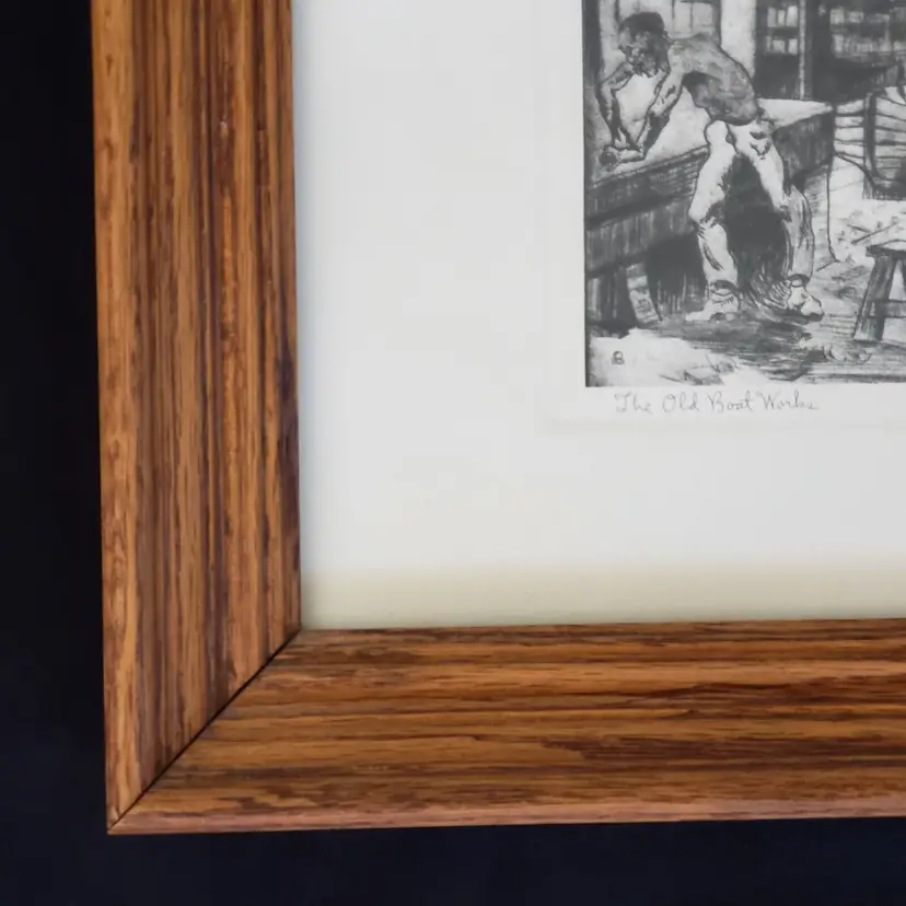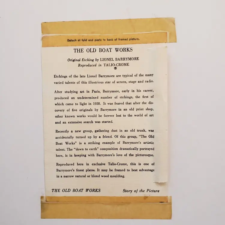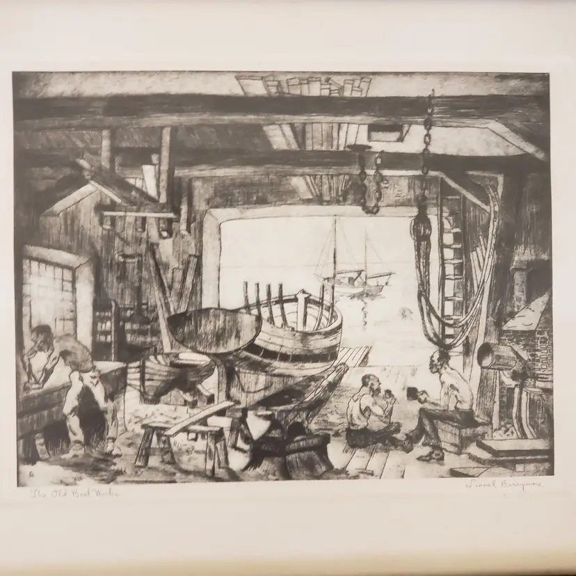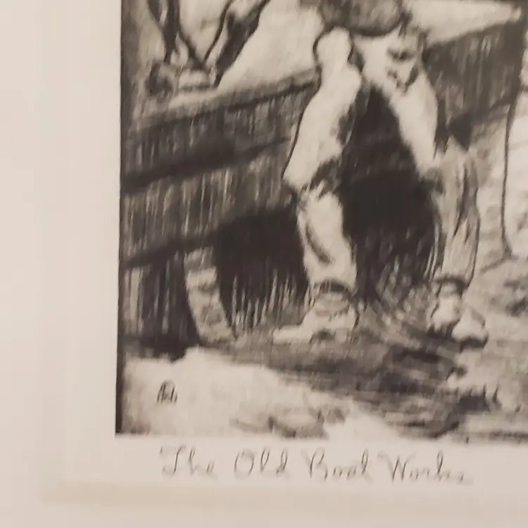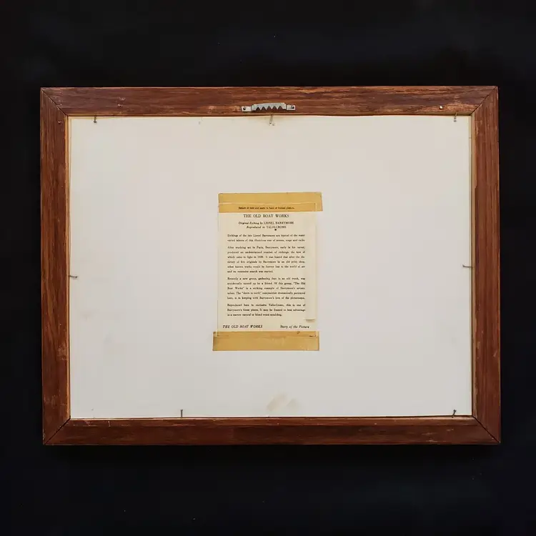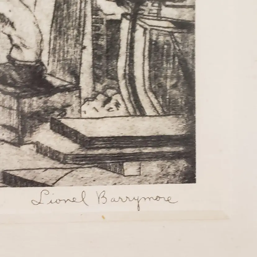 Artist: Lionel Barrymore Unit of Sale: Single-Piece Work Signed By: Facsimile Lionel Barrymore Size: Medium (up to 36in.) Date of Creation: Unknown Framing: Matted & Framed Size Type/Largest Dimension: Medium (Up to 30in.) Listed By: Dealer or Reseller Framed/Unframed: Matted & Framed Width (Inches): 18 3/4 Item Height: 8 1/8" Style: Americana Features: Framed, Matted, Signed Item Width: 10 3/4" Signed: Yes Color: Black and White Material: Etching Original/Licensed Reprint: Reproduction Subject: Boat workers Print Surface: Paper Type: Print Edition Type: Open Edition Height (Inches): 14 1/2" Theme: Americana, Art, Boat Workers Production Technique: Etching