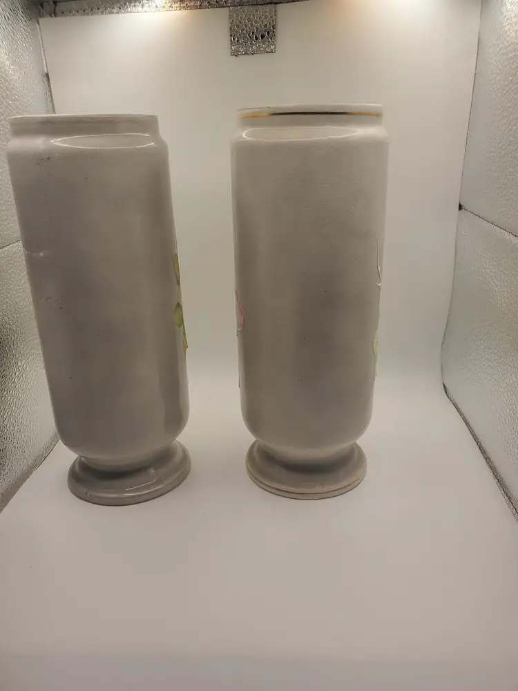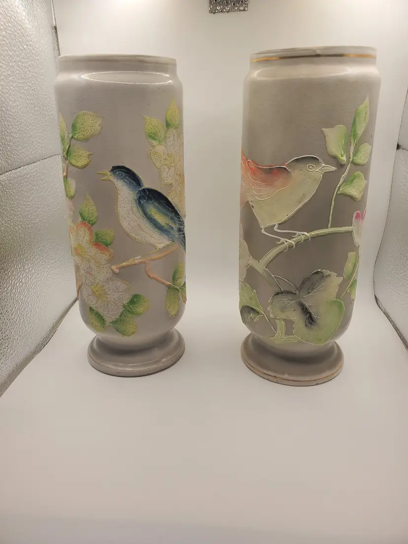 Beautiful vintage pair of handpainted vases. Birds! Some crazing showing age but still beautiful. 8 3/4" high.