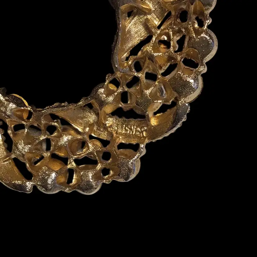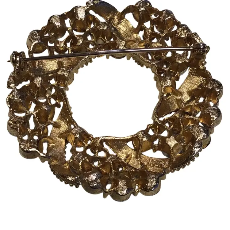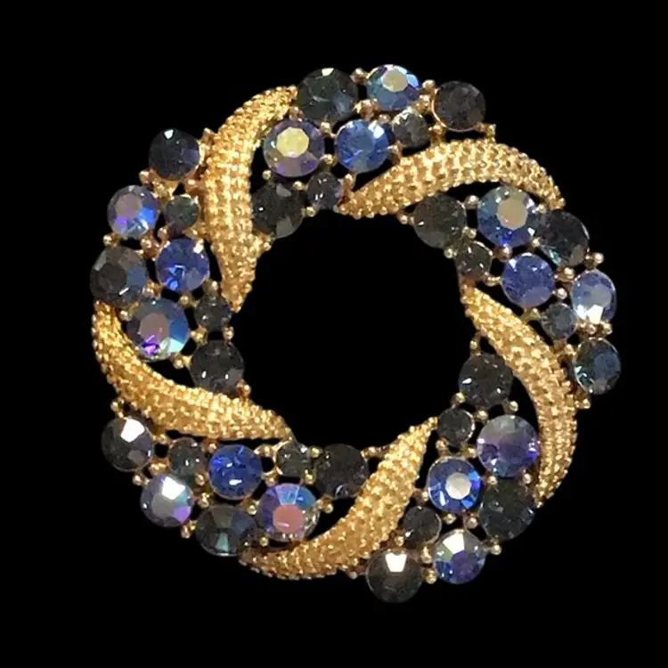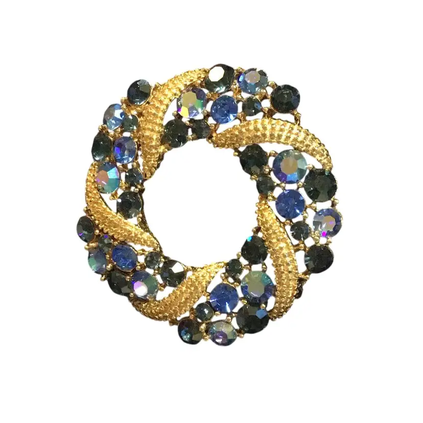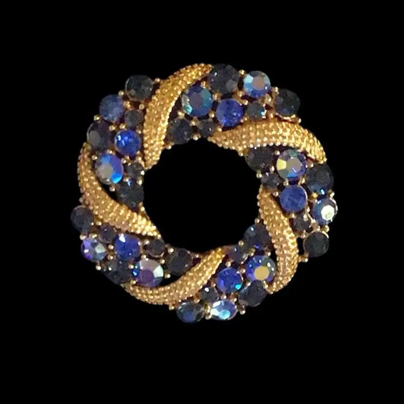 Pebbled gold tone wreath with midnight blue & Aurora Borealis cobalt blue. No visible signs of wear, 2-1/4”. #058