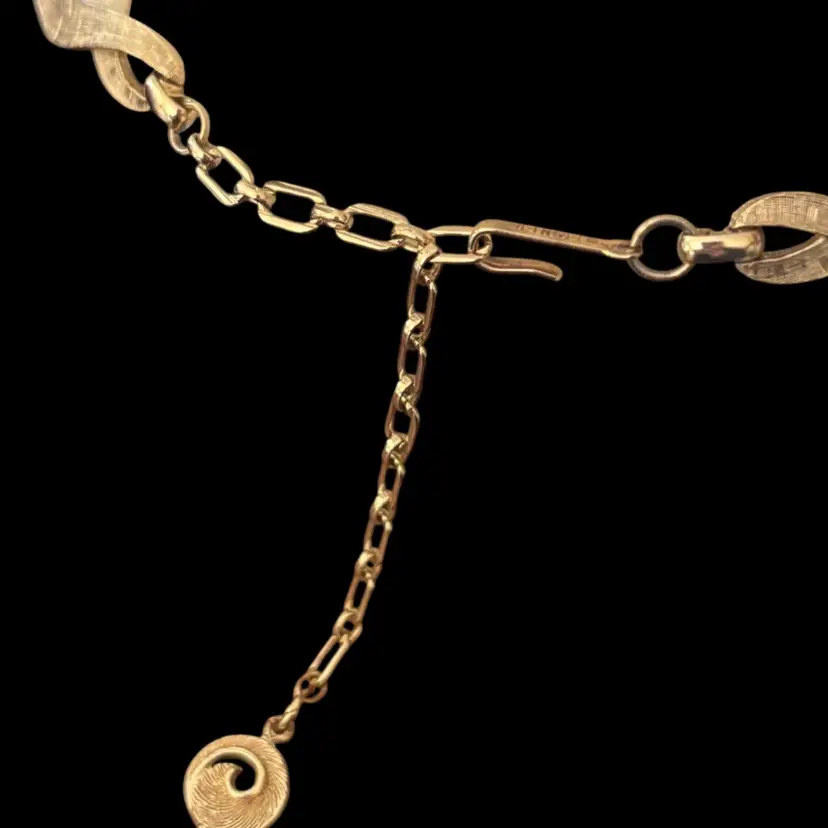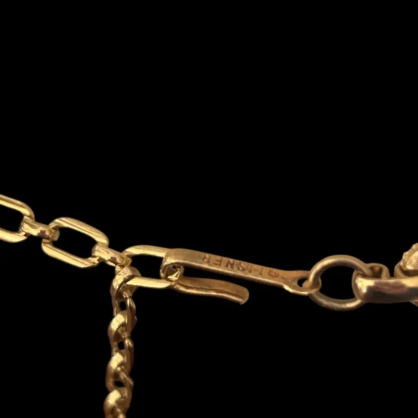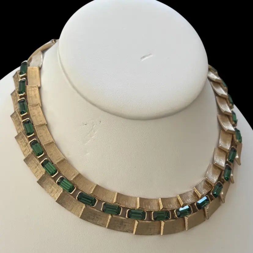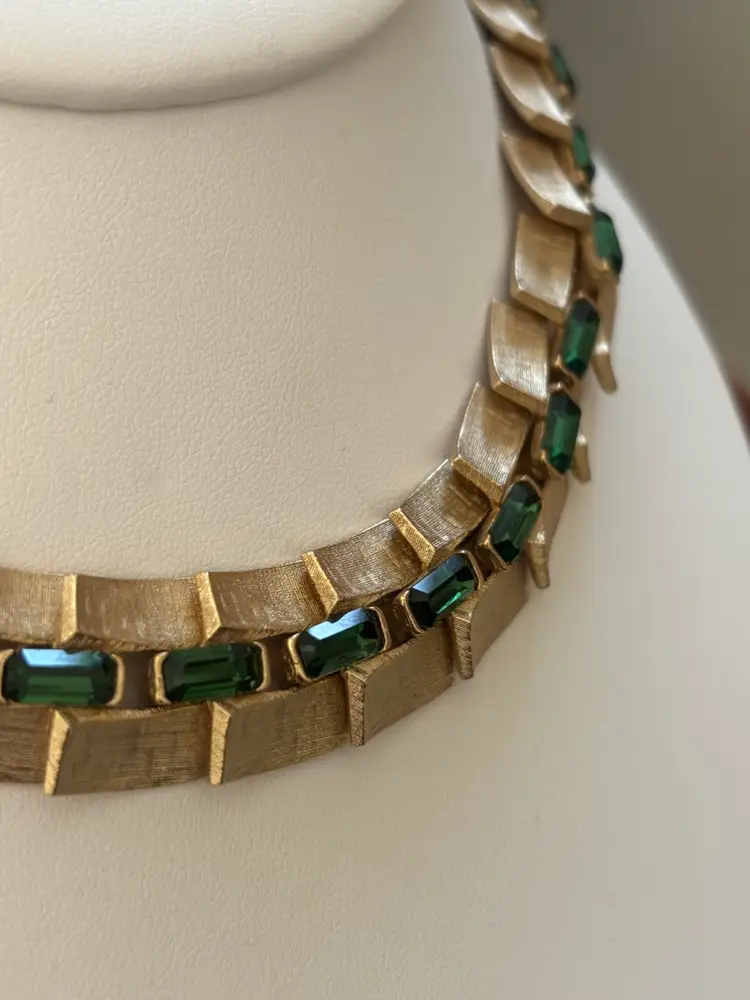 Lovely vintage brushed gold tone with emerald green rhinestone necklace, marked Lisner. In nice condition 12” with 3.5” extender.