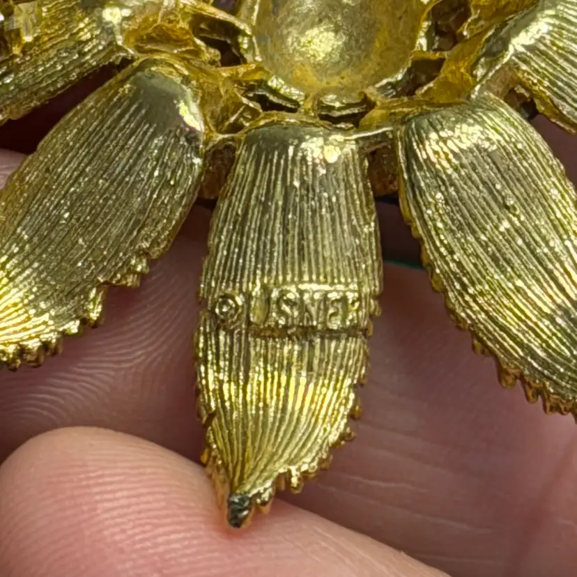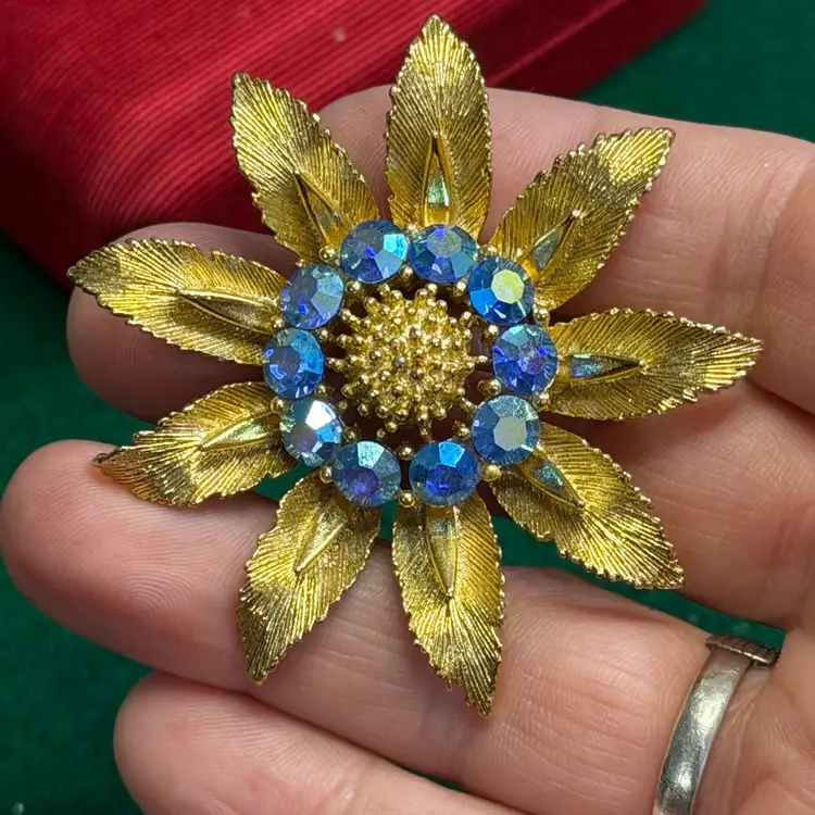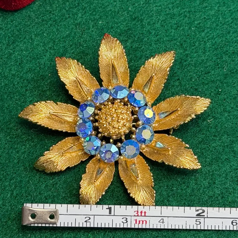 This lovely Lisner brooch is in good condition with all its rhinestones and only minor signs of wear. It is about 2 inches across.