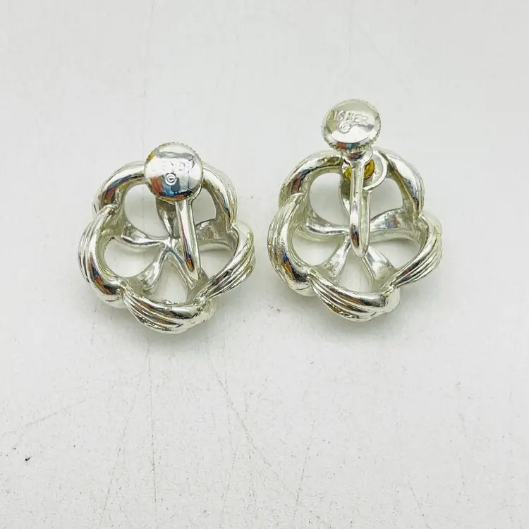 Charming vintage Lisner earrings crafted in silver tone metal with a ribbon-style floral design. These signed Lisner earrings feature screwback clasps, perfect for non-pierced ears. A beautiful mid-century accessory that adds timeless elegance to any jewelry collection. Features: Brand: Lisner (signed) Metal Tone: Silver tone Design: Floral ribbon motif Style: Clip-on screwback earrings (for non-pierced ears) Condition: Pre-owned, good vintage condition 0.75 inch