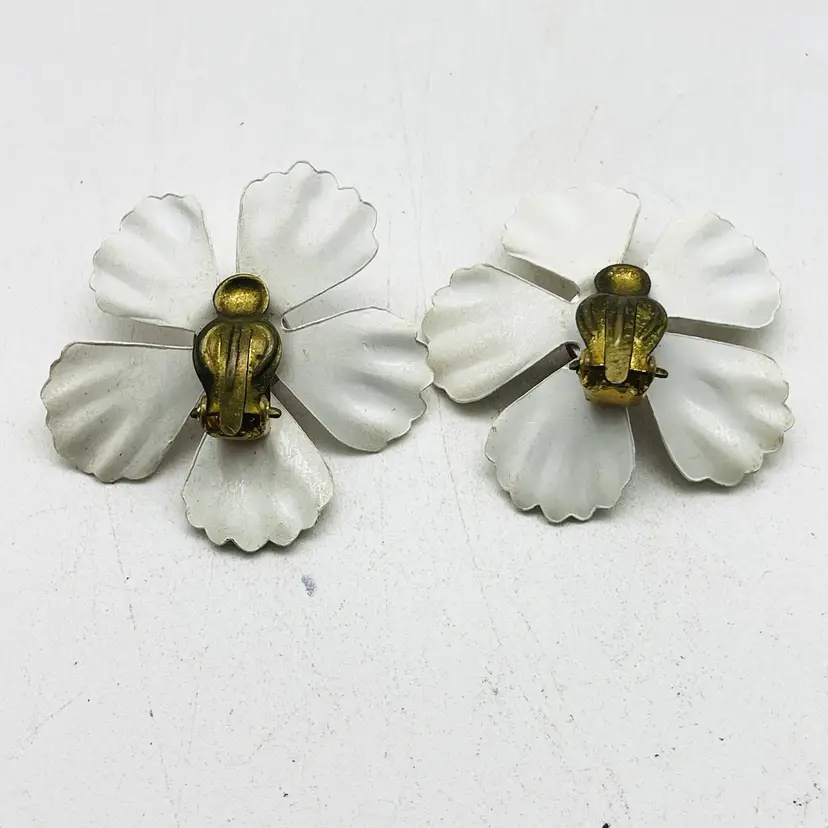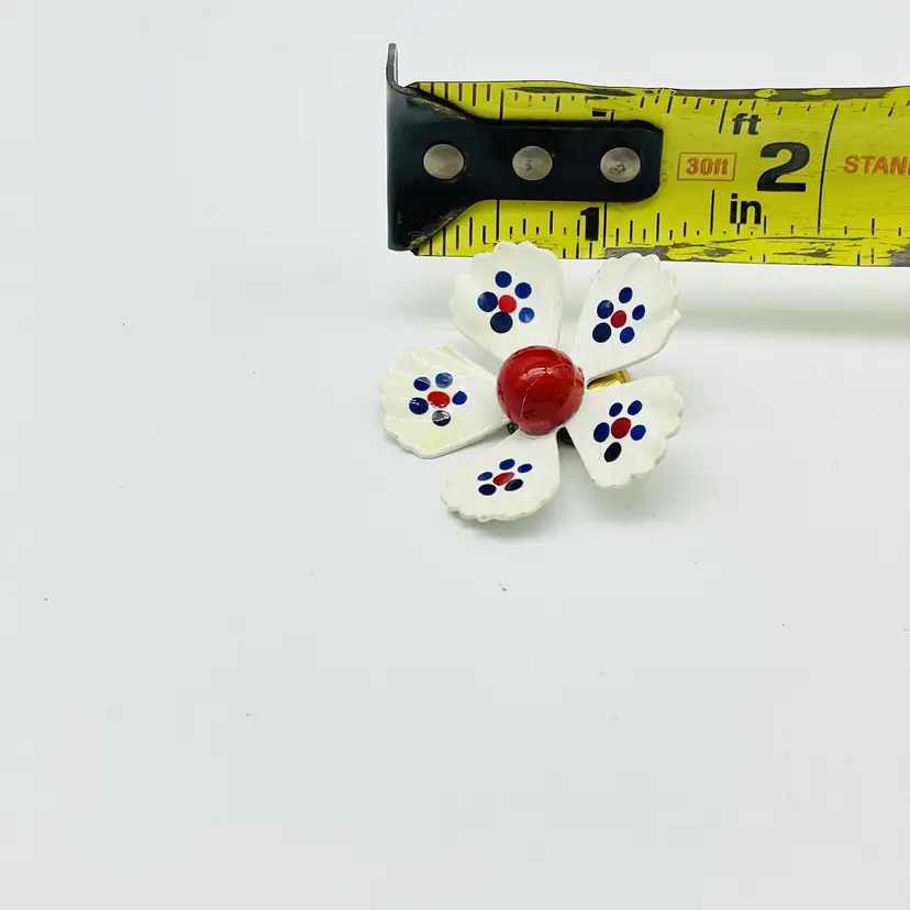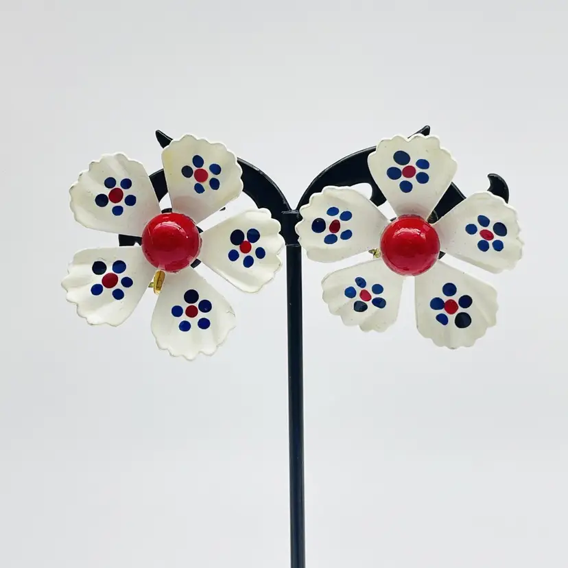 Charming vintage 1960s white enamel flower clip-on earrings with red centers and blue dot accents. Fun and bold retro design. Features: Clip-on backs (for non-pierced ears) White enamel petals with red and blue dots, 1.25 inch Bright red center bead Lightweight and comfortable Perfect retro statement accessory vintage enamel earrings, flower clip on earrings, red white blue earrings, 1960s jewelry, retro costume jewelry, mod earrings, patriotic earrings, enamel floral earrings, vintage fashion jewelry