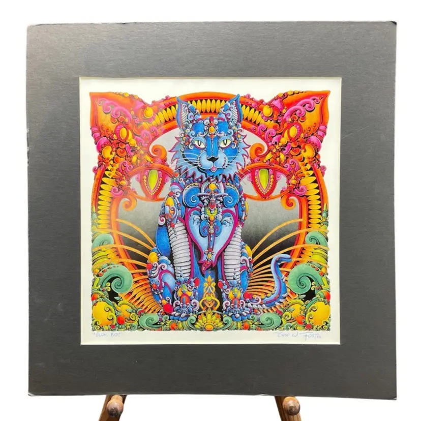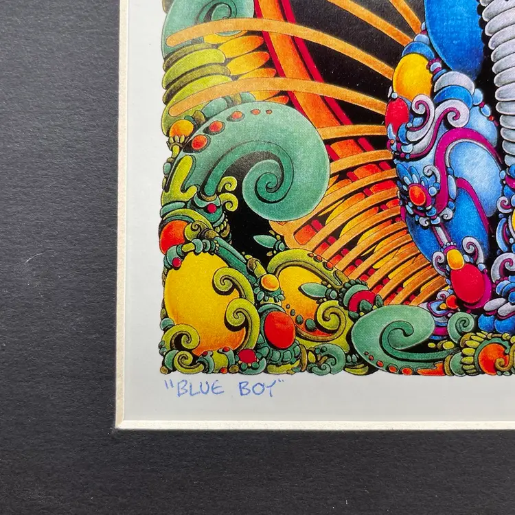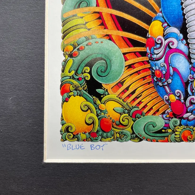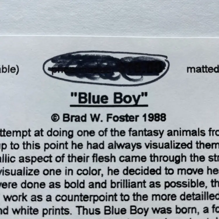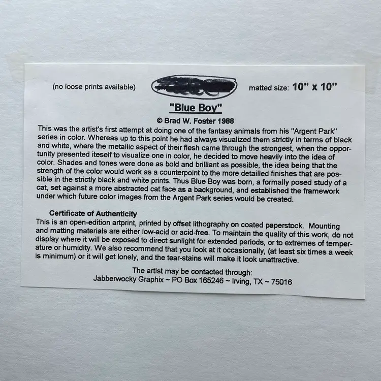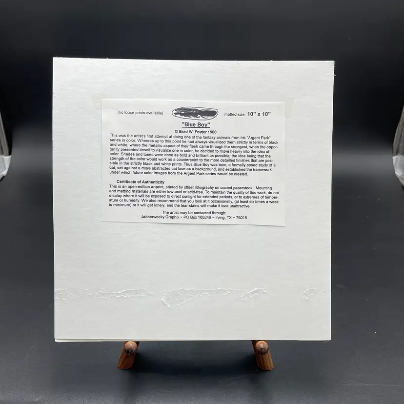 This is a vintage 1988 Brad W. Foster matted lithograph titled "Blue Boy". Signed by artist. There is an info sheet attached to the back as shown in pictures. Measures approximately 10" x 10". The matte has some wear around the edges. No flaws to the print. Stand not included.