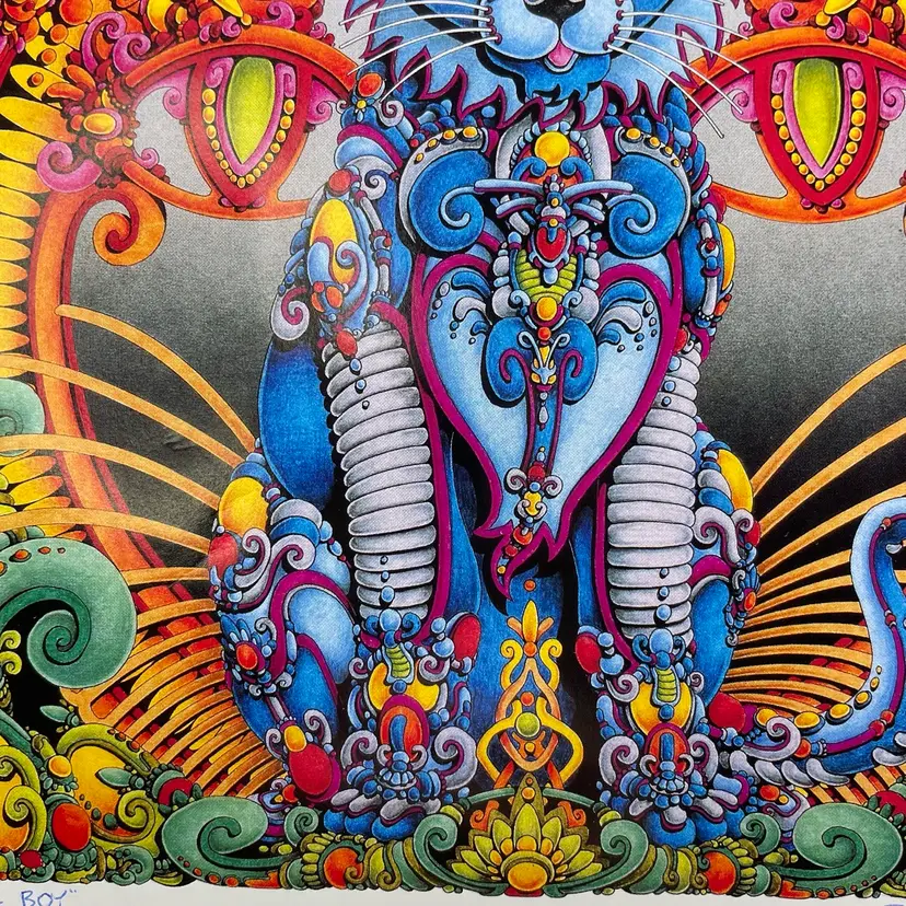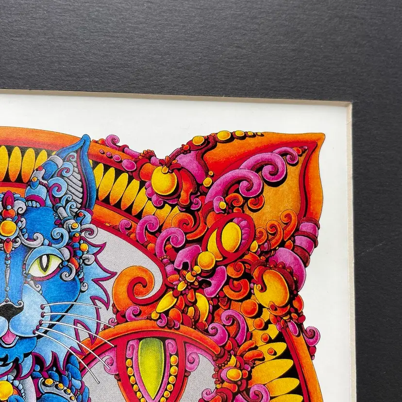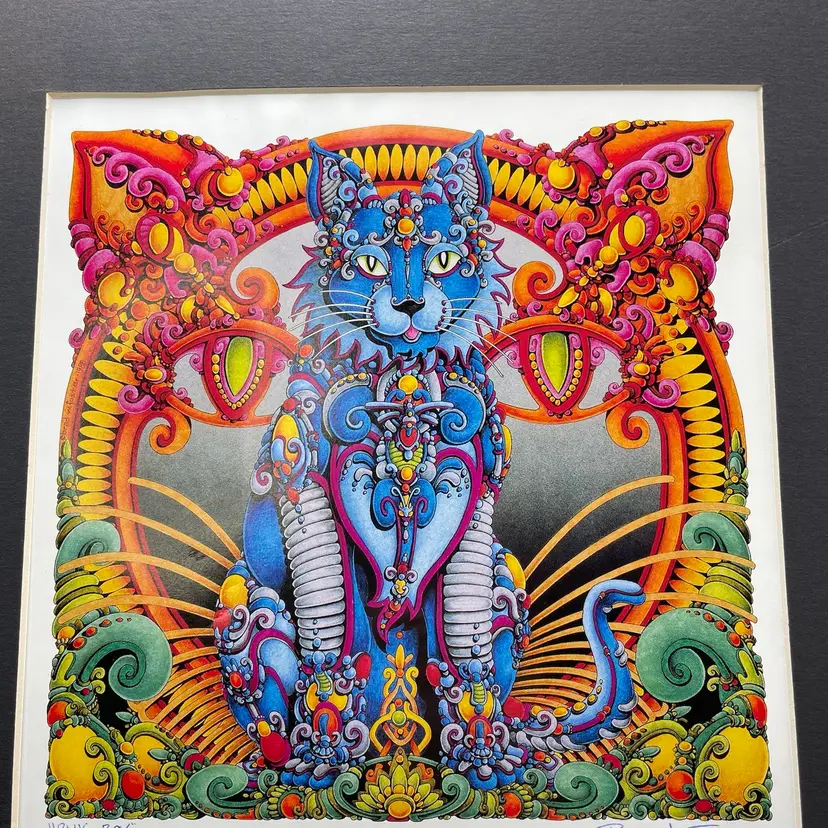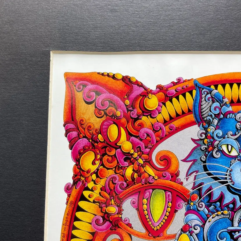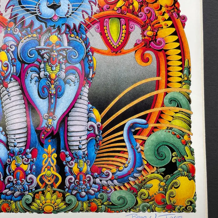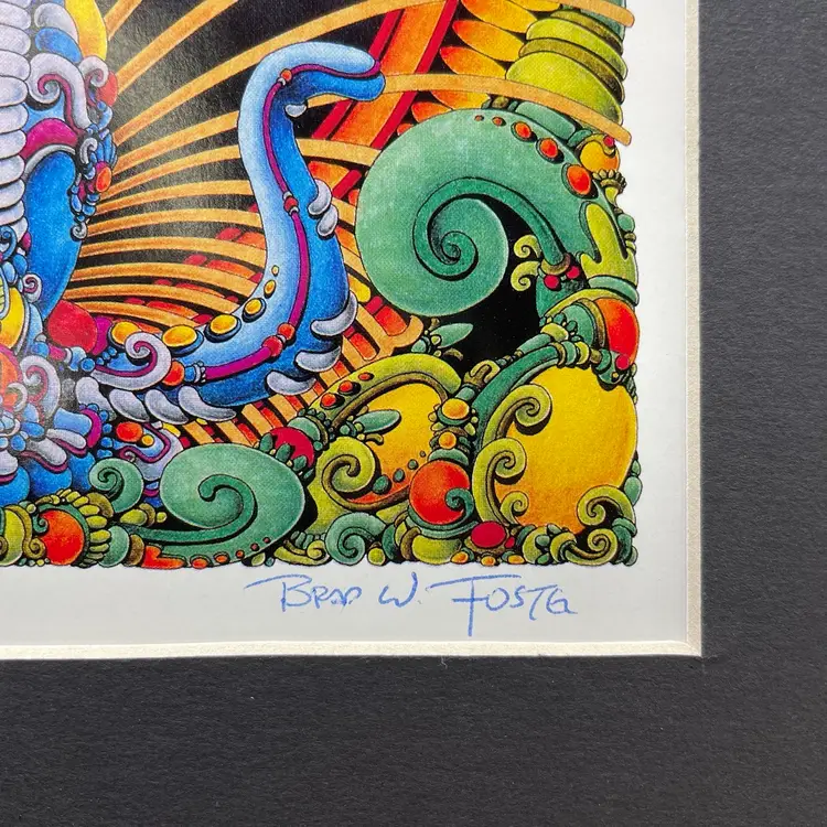 This is a vintage 1988 Brad W. Foster matted lithograph titled "Blue Boy". Signed by artist. There is an info sheet attached to the back as shown in pictures. Measures approximately 10" x 10". The matte has some wear around the edges. No flaws to the print. Stand not included.