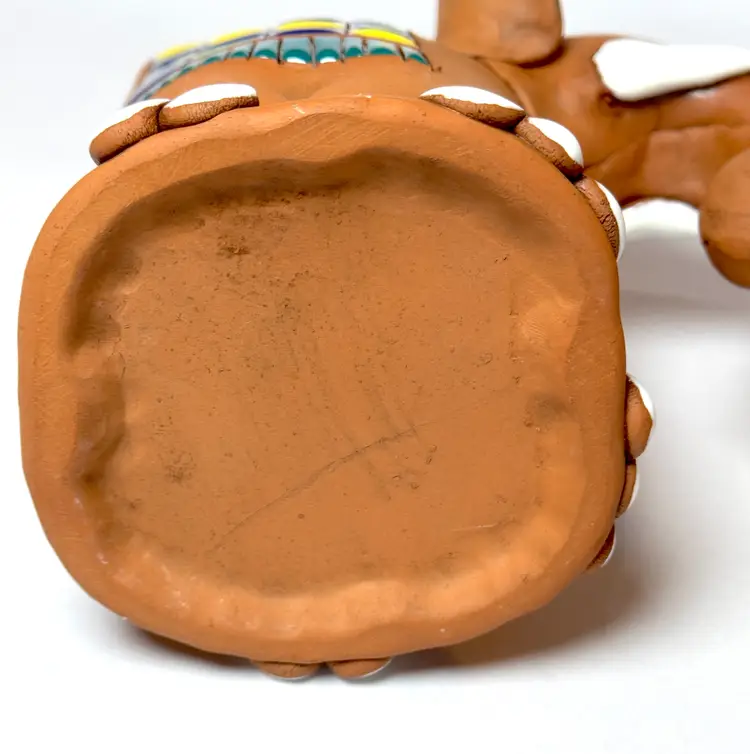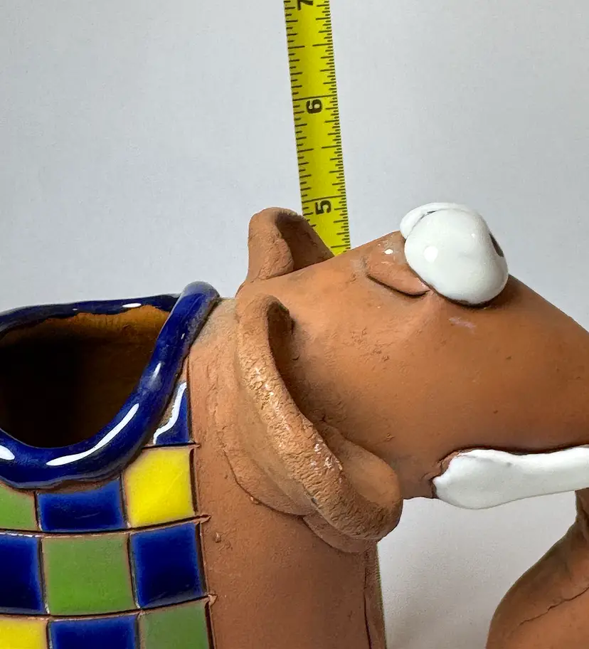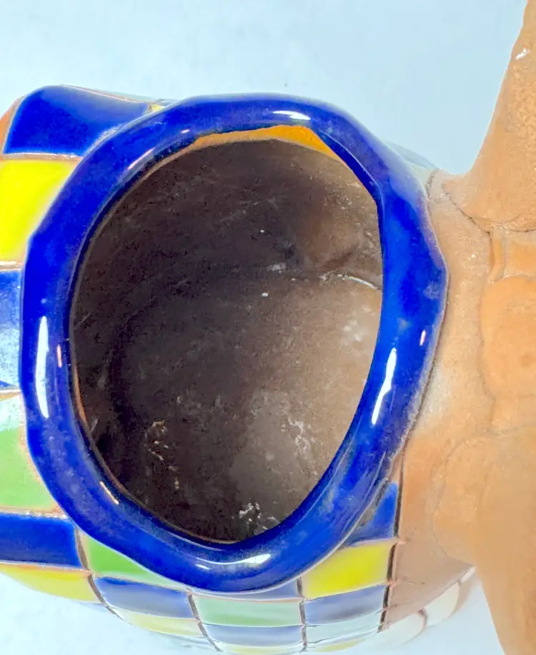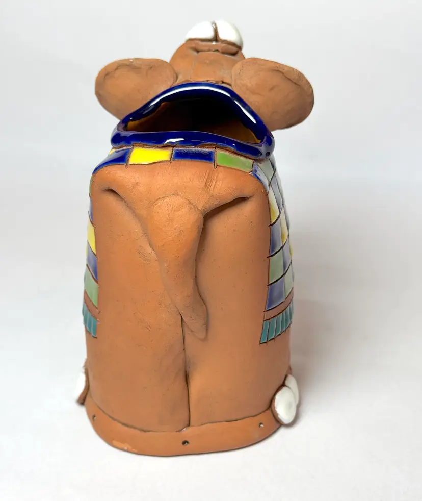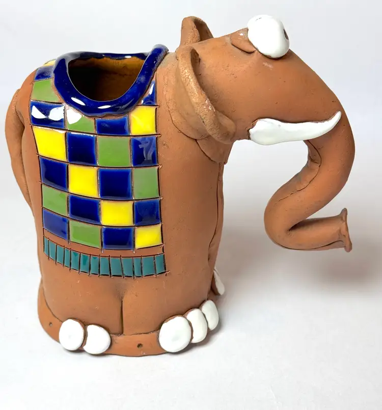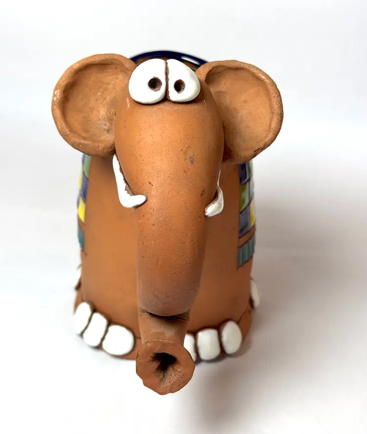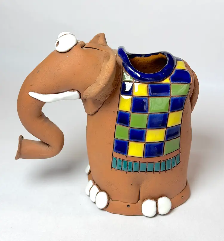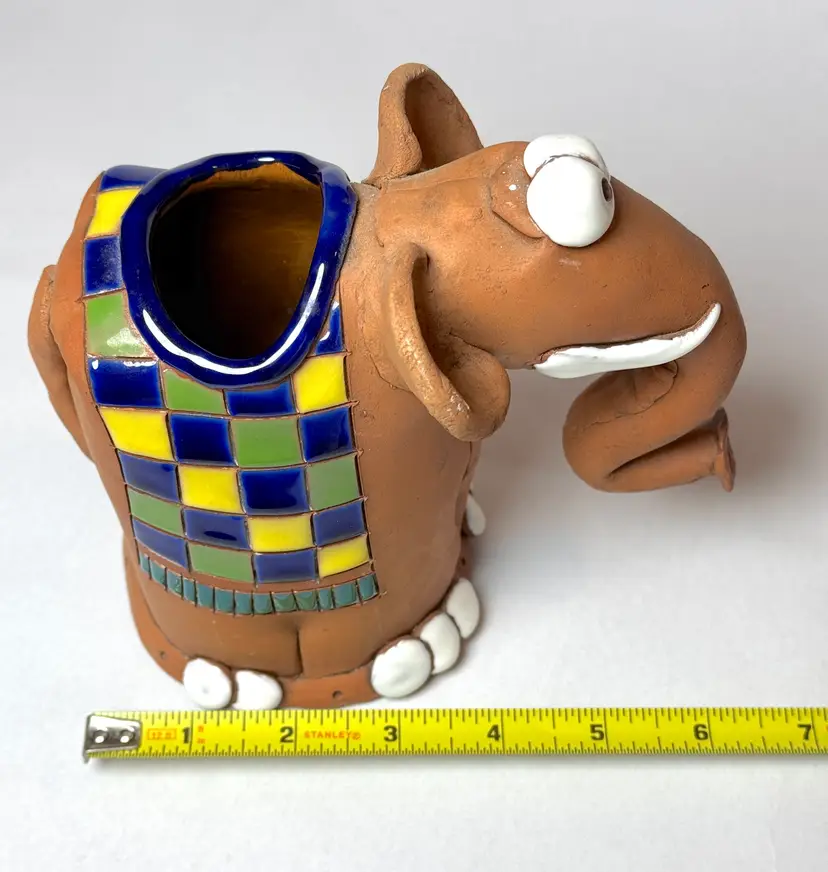 This is a little elephant vase, made in Lithuania and known as a Drambliukas. It is handmade of clay with a glazed interior and decoration. I have not bee able to find another one like this online. Very special!