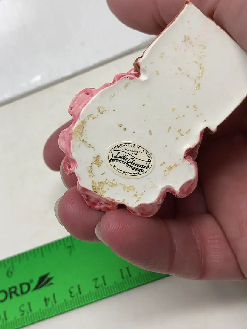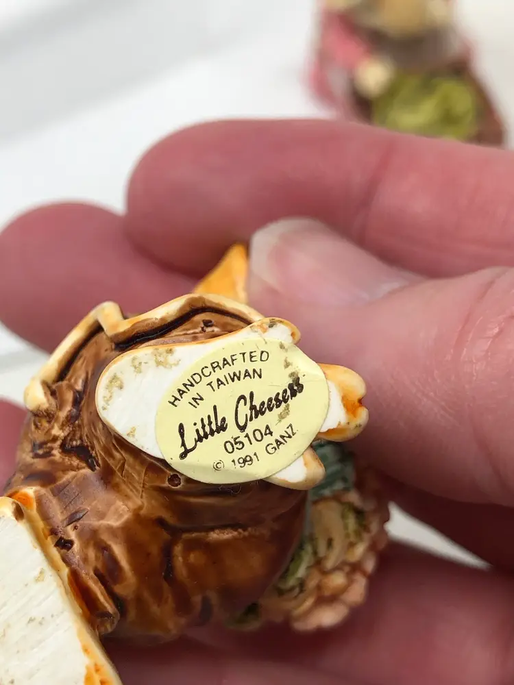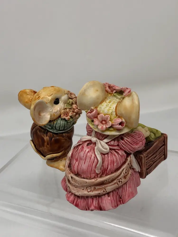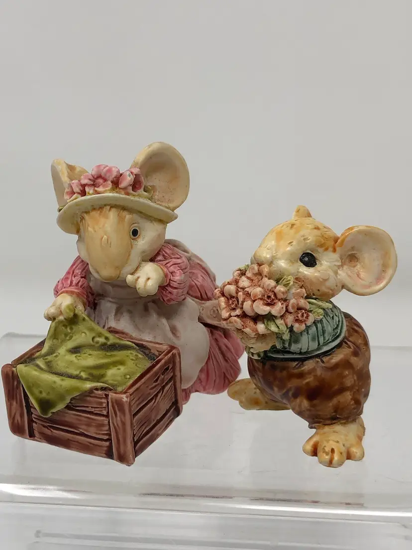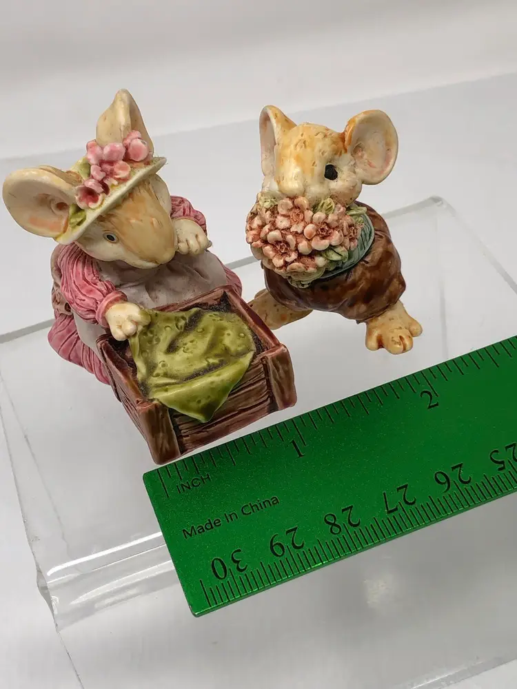 2 little mouse figurines, 2" Mama Woodsworth with a crate and 1 1/2" little mouse with a pink bouquet. No chips or cracks original labels on both