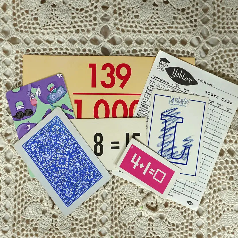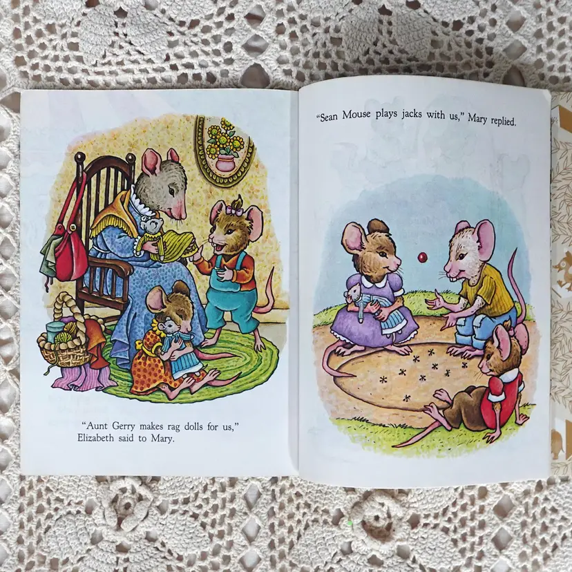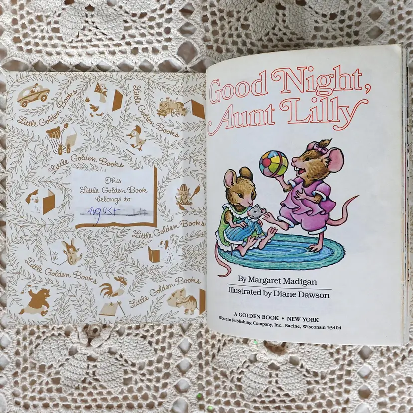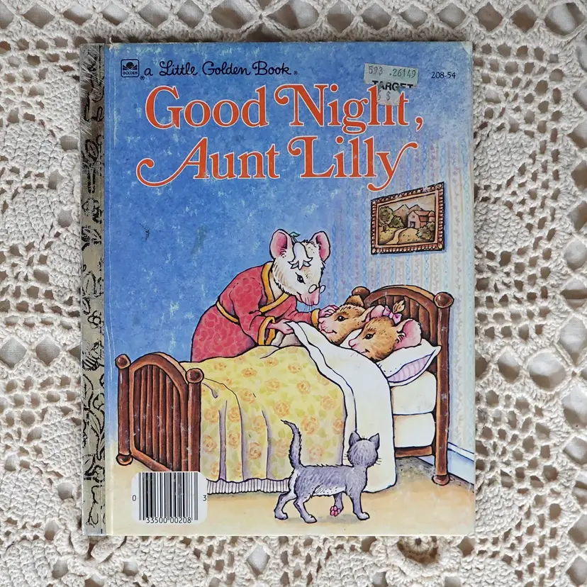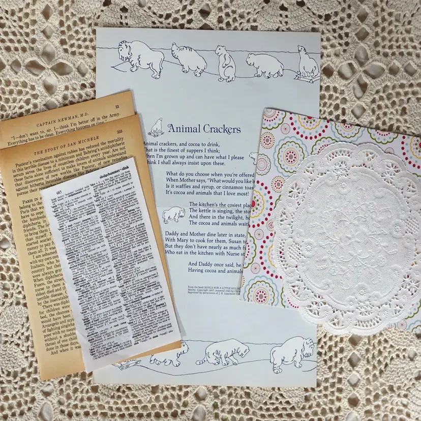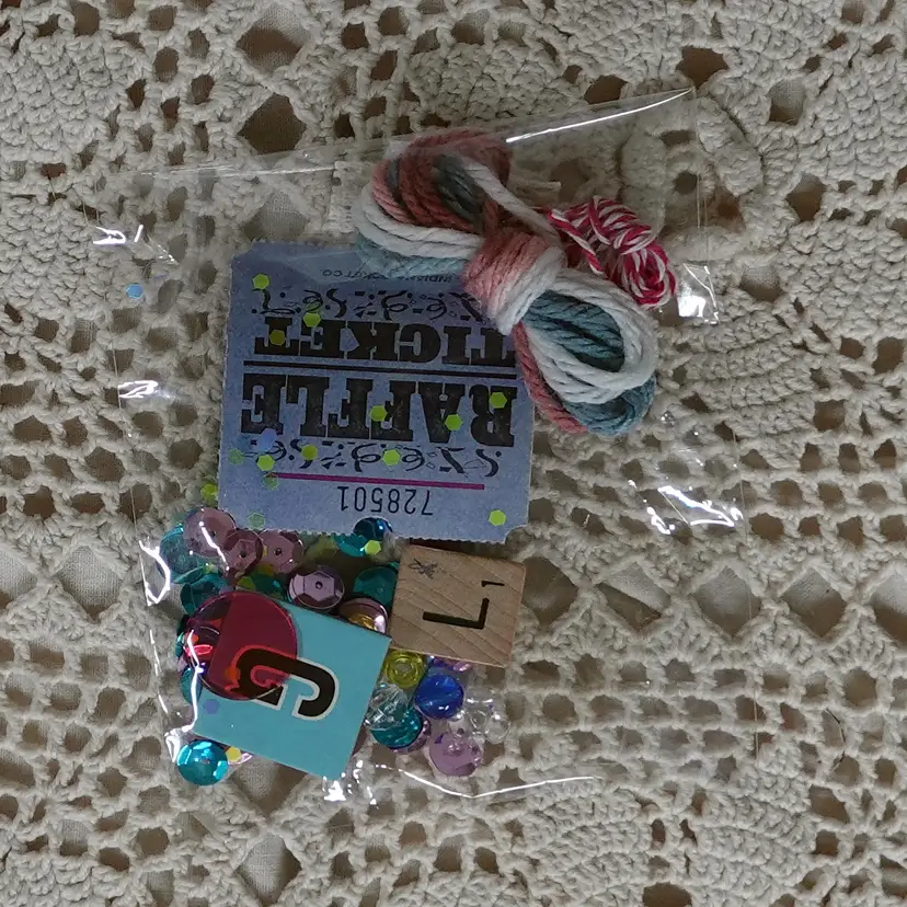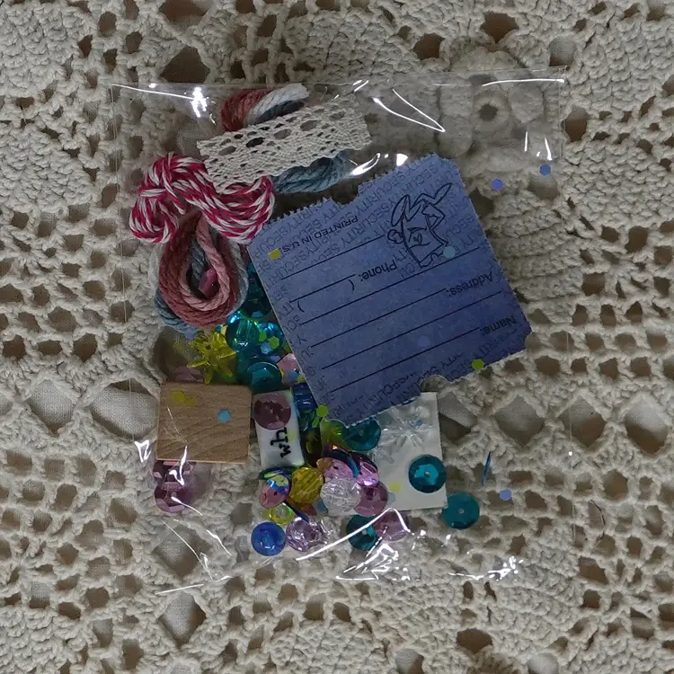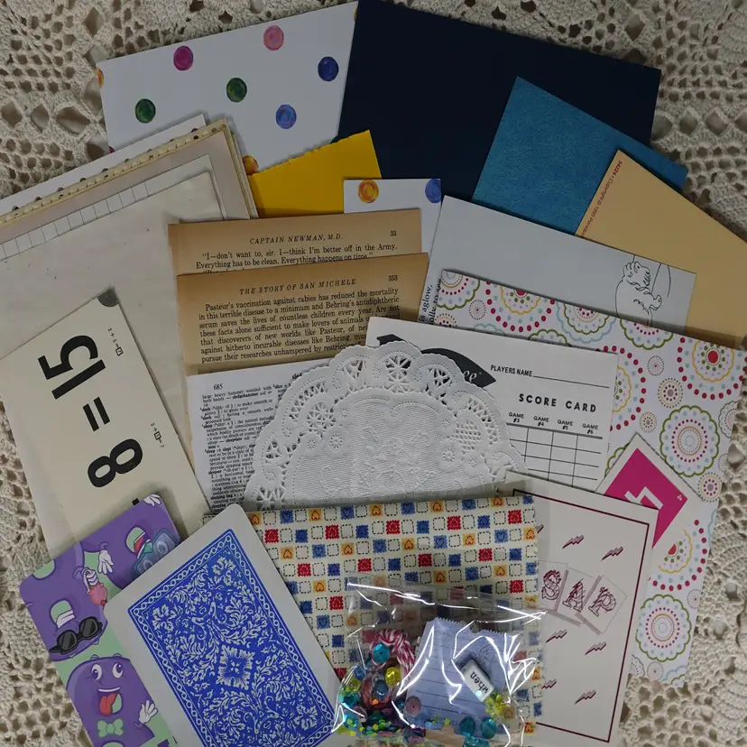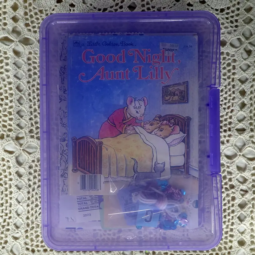 Fun Little Golden Book junk journal mini kit inside a Bin! The kit includes the following... Dollar Tree Bin, Little Golden Book, Coordinating Scrapbook Paper, Coffee Dyed Page, Lined Notebook Paper, Blank Paper, Ideals Magazine Sheet, Old Book Pages, Paper Doilie, Flash Cards Game Sheet, Playing Card, Coordinating Scrap Fabric for spine, and Bag Full Of Goodies. The bag includes.. Confetti, String, Ticket, Beads, Game Pieces and More.