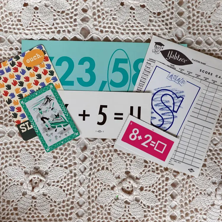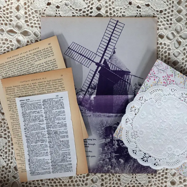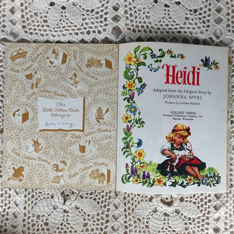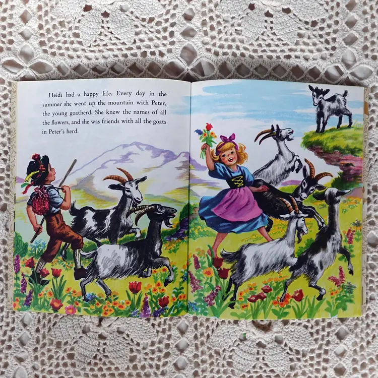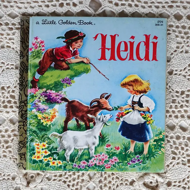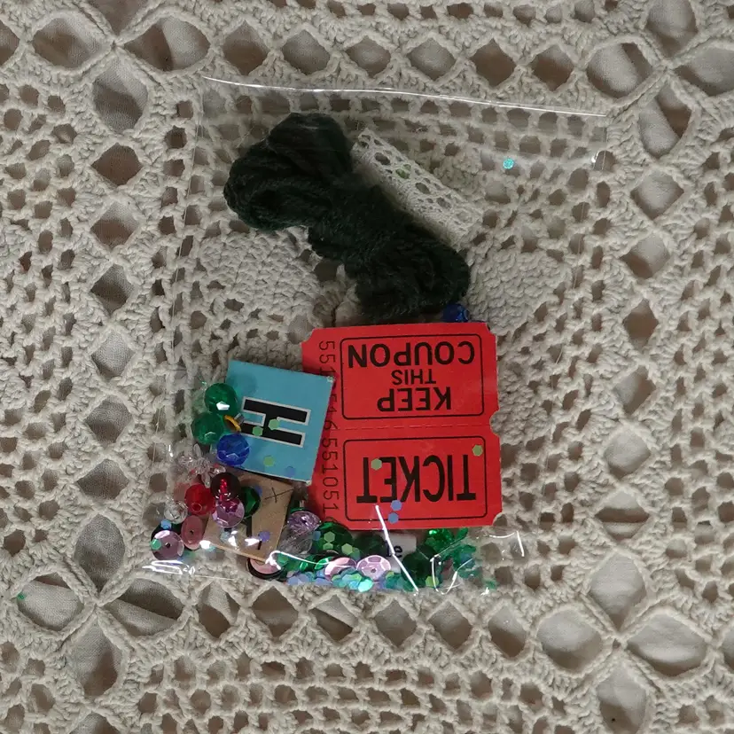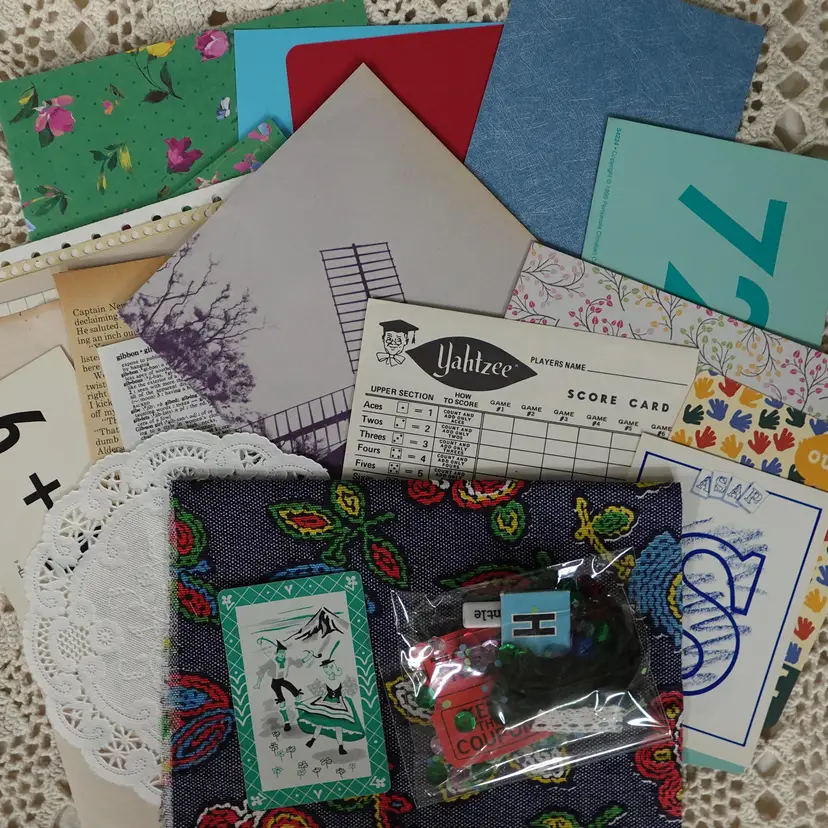 Fun Little Golden Book junk journal mini kit inside a Bin! The kit includes the following... Dollar Tree Bin, Little Golden Book, Coordinating Scrapbook Paper, Coffee Dyed Page, Lined Notebook Paper, Blank Paper, Ideals Magazine Sheet, Old Book Pages, Paper Doilie, Flash Cards Game Sheet, Playing Card, Coordinating Scrap Fabric for spine, and Bag Full Of Goodies. The bag includes.. Confetti, String, Ticket, Beads, Game Pieces and More.