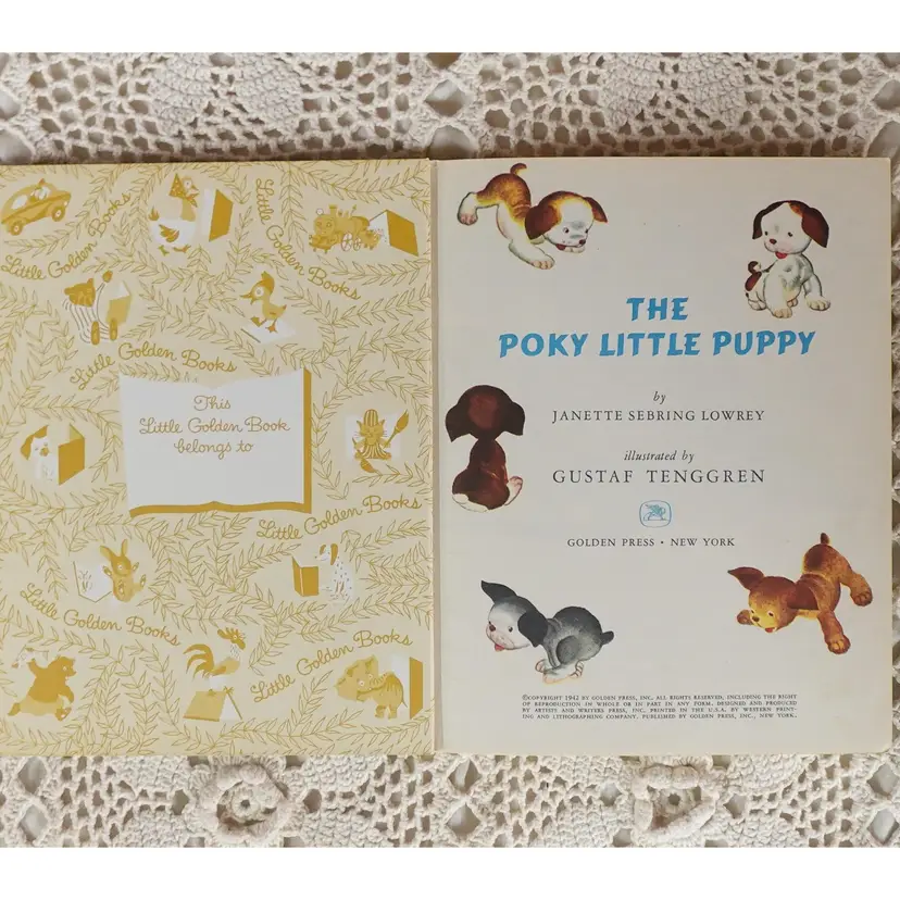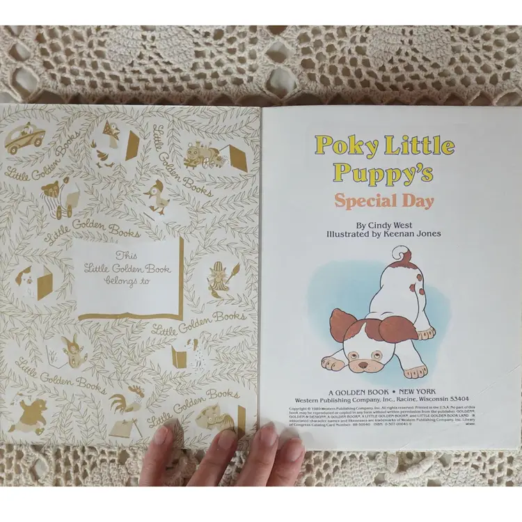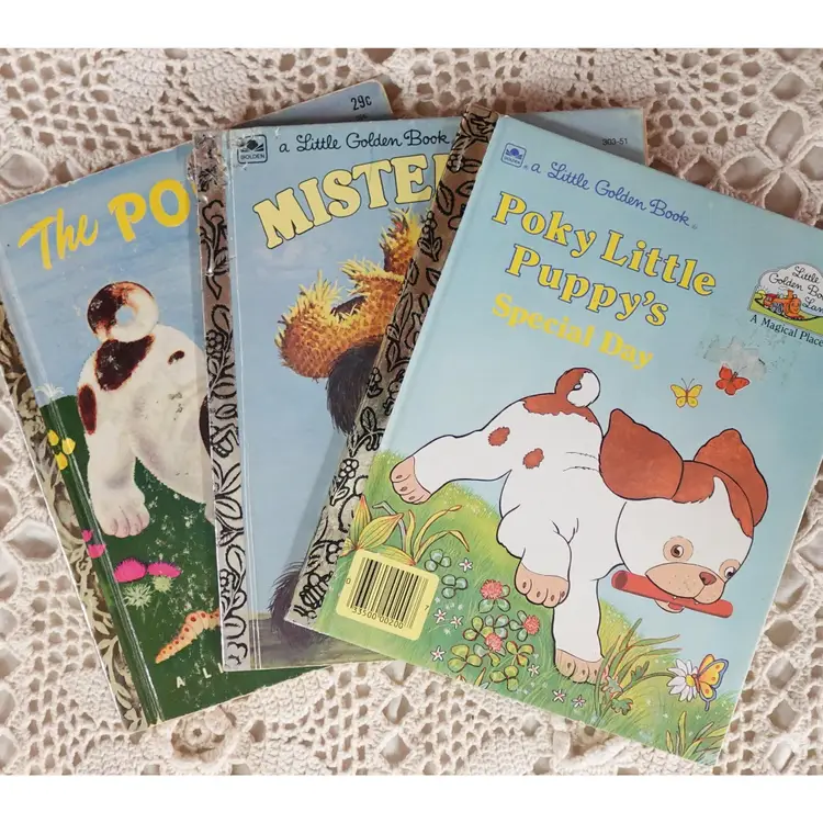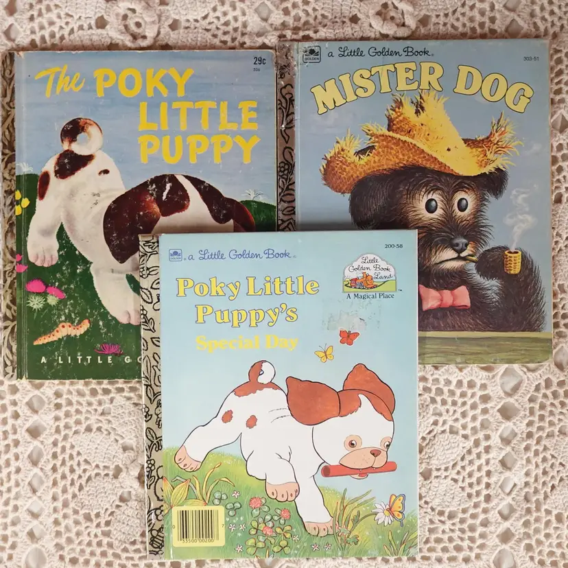 Great condition, minimal wear on both books. The Mister Dog has some chew marks (Go figure for the doggy) This bundle includes... The Poky Little Puppy Copyright 1942. (RARE D Printing) (Golden Happy Book) Mister Dog Copyright renewed 1980, & Pokey Little Puppy's Special Day 1989 (Little Golden Book Land) Sku #0032 Please note: I will always combine shipping.