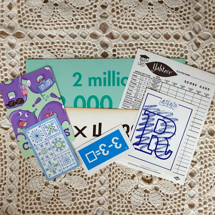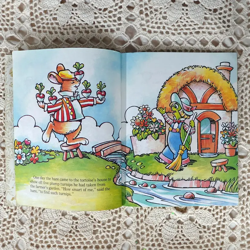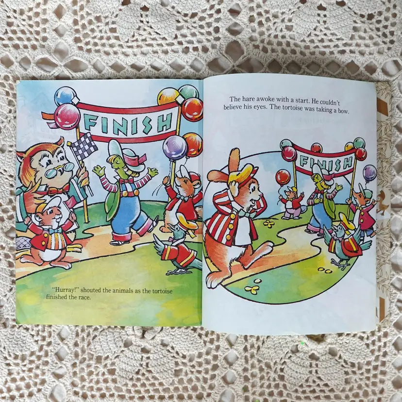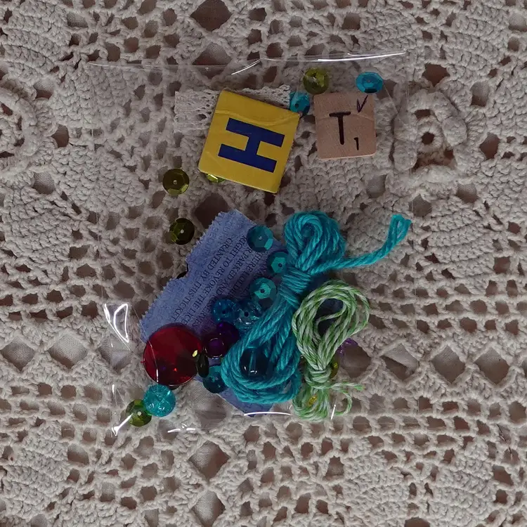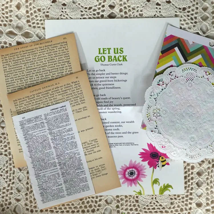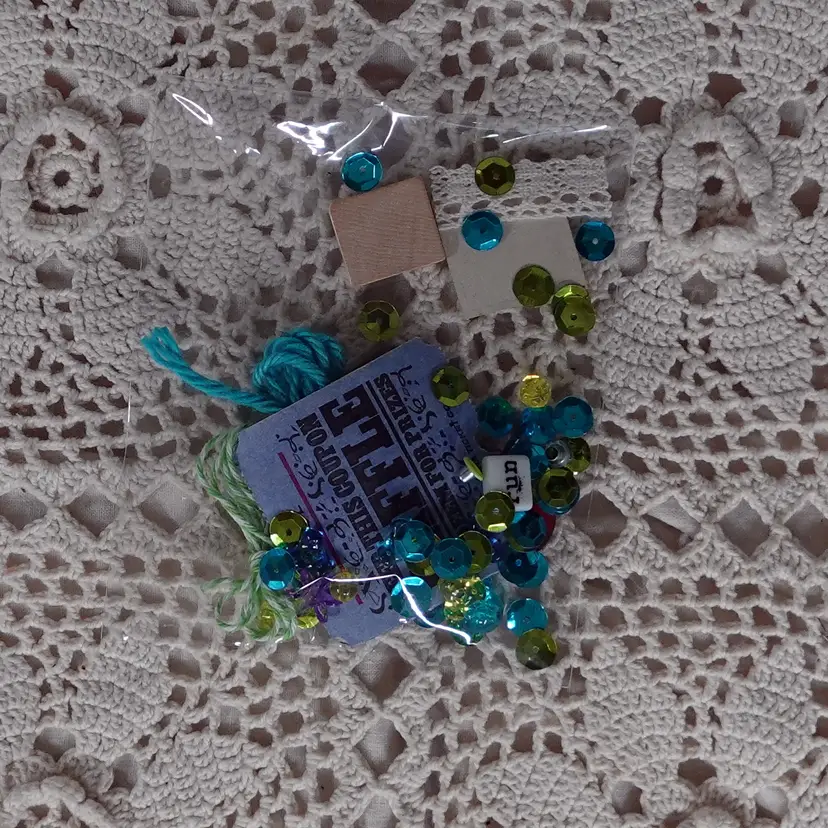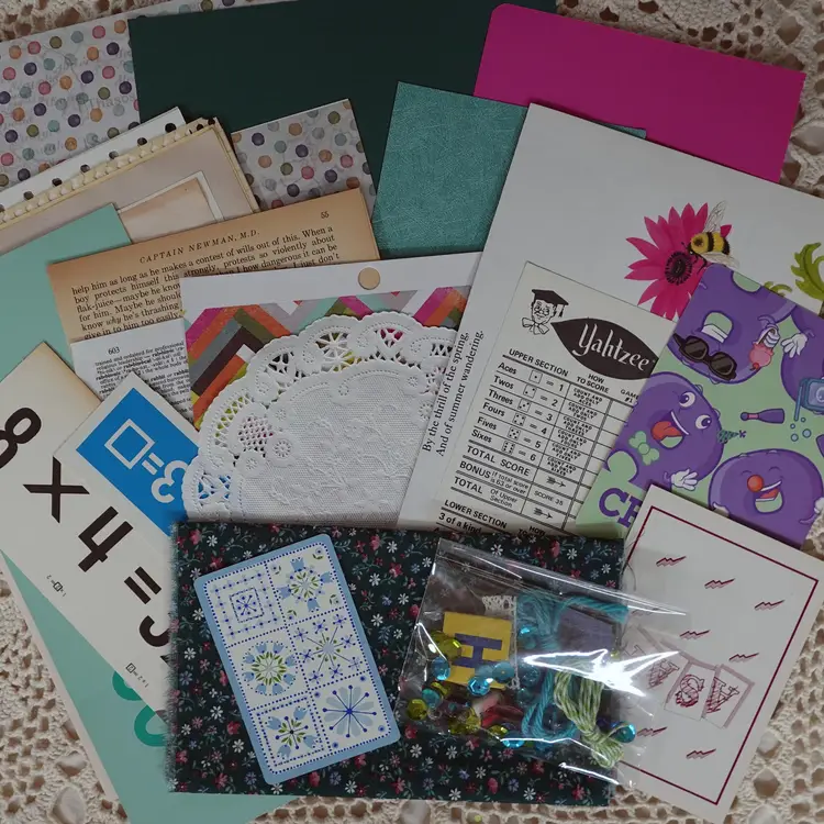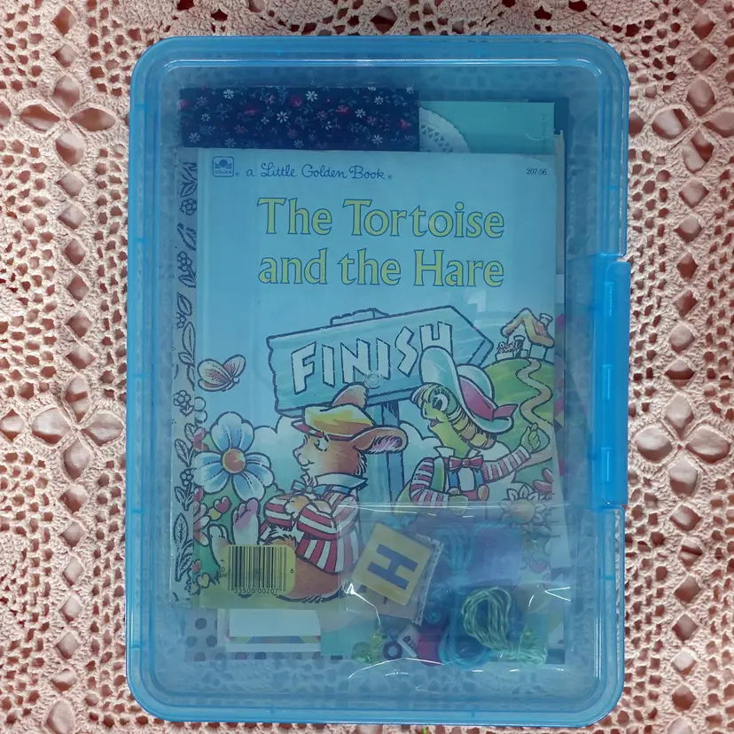 Fun Little Golden Book junk journal mini kit inside a Bin! The kit includes the following... Dollar Tree Bin, Little Golden Book, Coordinating Scrapbook Paper, Coffee Dyed Page, Lined Notebook Paper, Blank Paper, Ideals Magazine Sheet, Old Book Pages, Paper Doilie, Flash Cards Game Sheet, Playing Card, Coordinating Scrap Fabric for spine, and Bag Full Of Goodies. The bag includes.. Confetti, String, Ticket, Beads, Game Pieces and More.