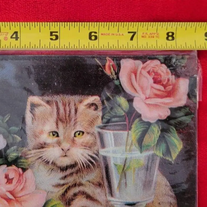 Super cute - Little Mischievous Cat Kitten Metal Sign With Pink Roses Flowers 8.5x6 inches - New