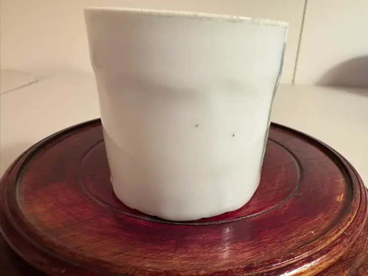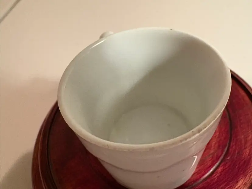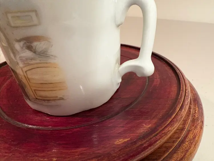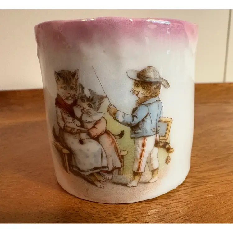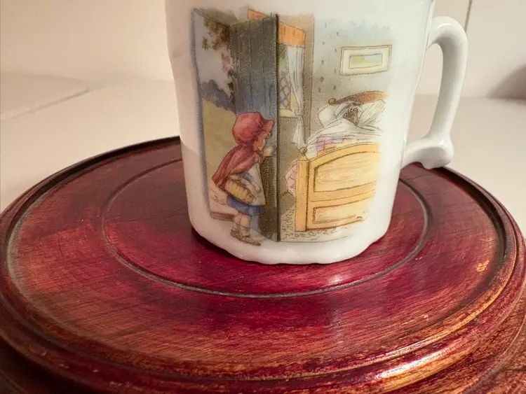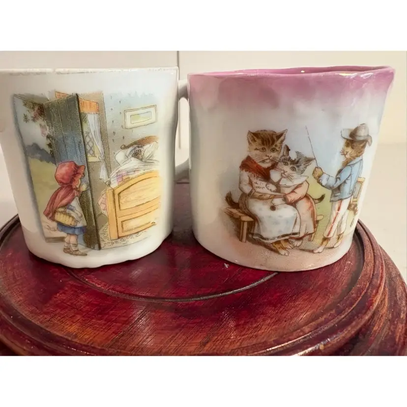 A vintage porcelain child’s tea cup featuring a Little Red Riding Hood design. The second one is of a mother cat and kitten with a school teacher. Both are 2 1/2” tall