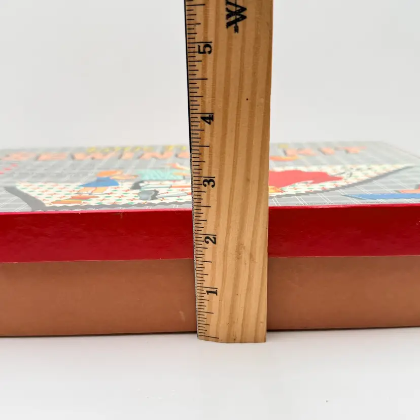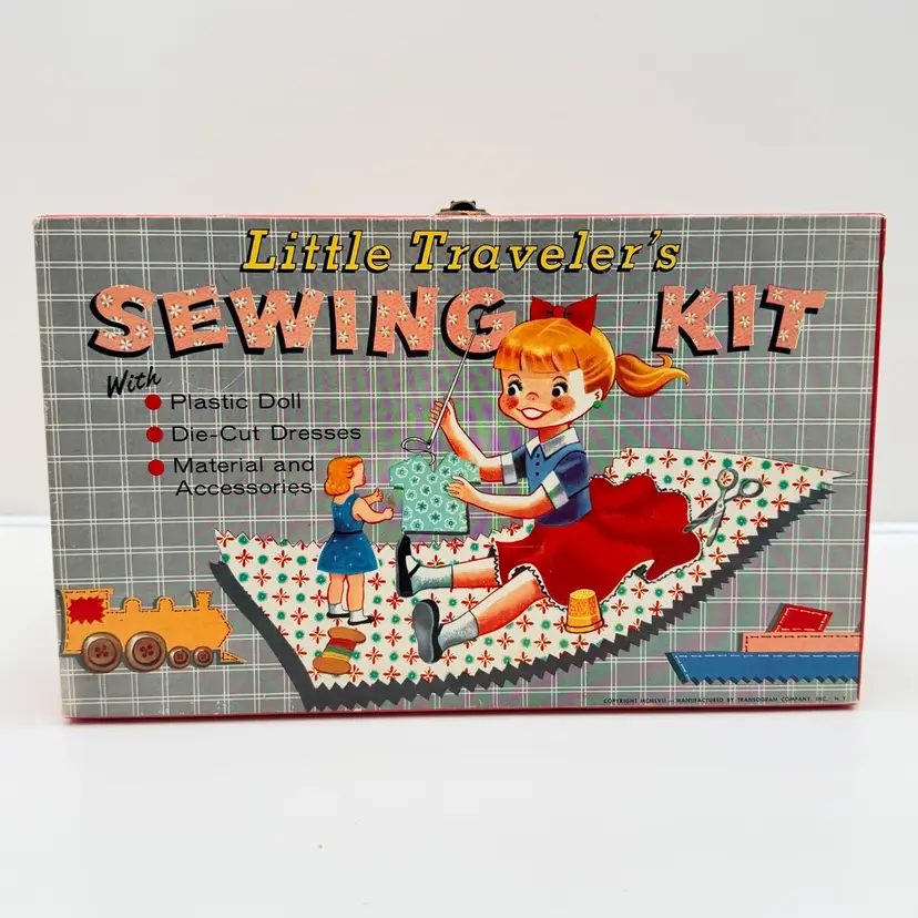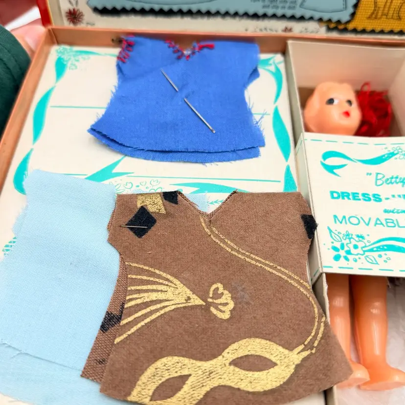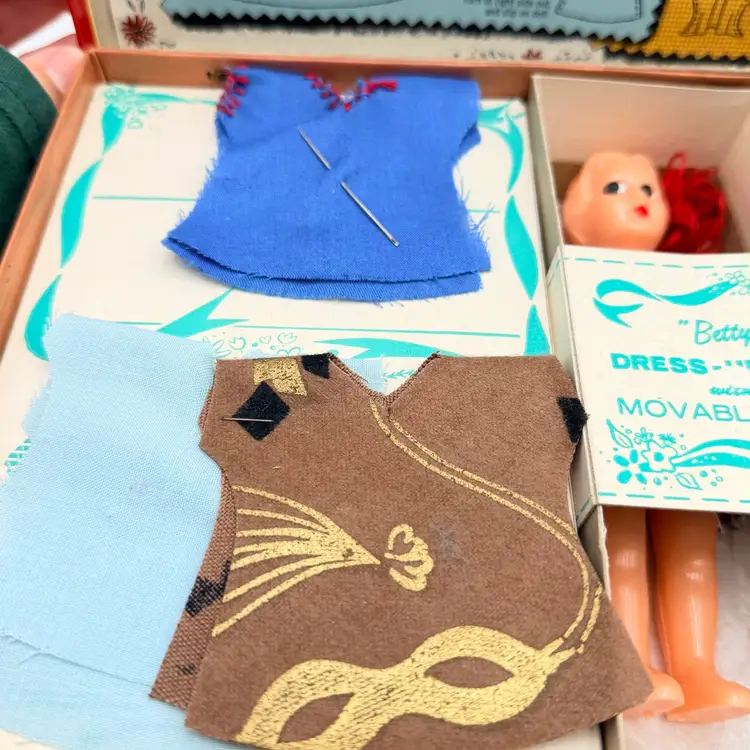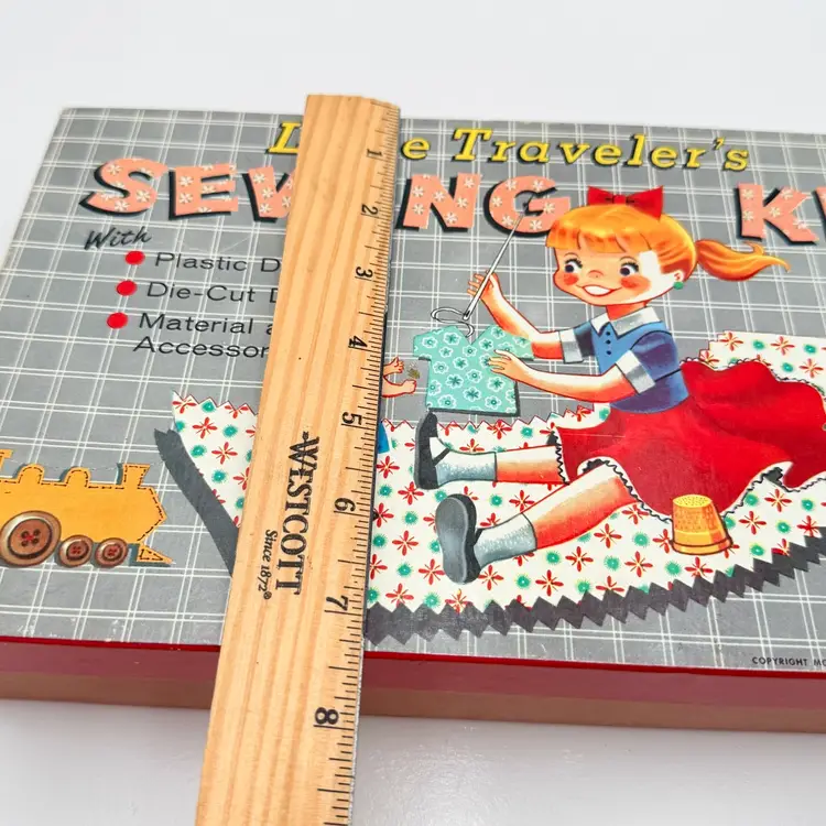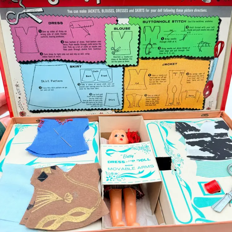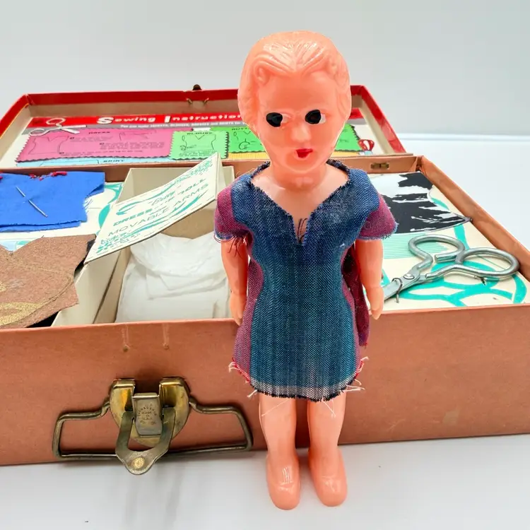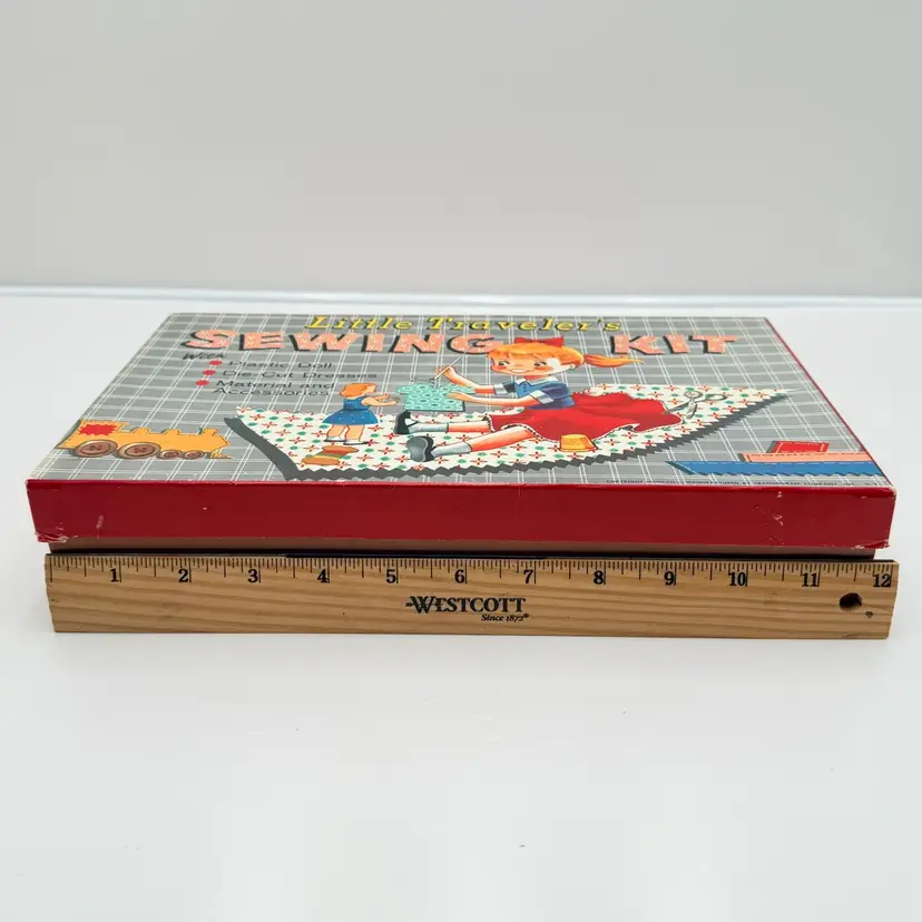 Kid includes the original new outfits to be sewn less one that was completed and on the doll. It has the original scissors, thimble, and instructions. 12 inches long, 2.5 inches deep and 7 inches wide One spot on back of cardboard box is damaged.