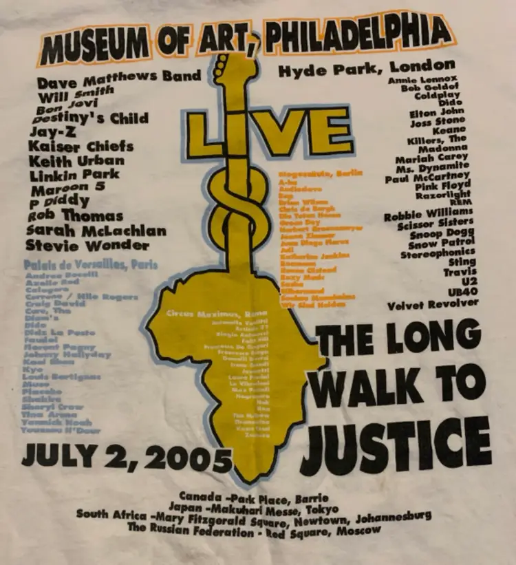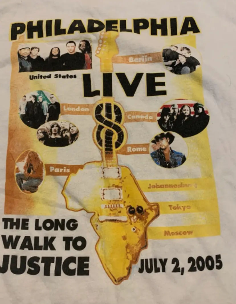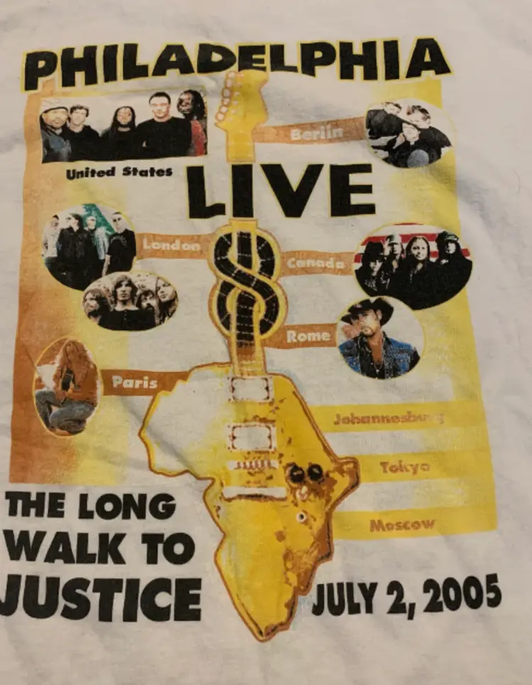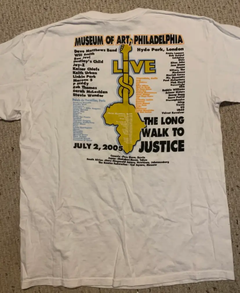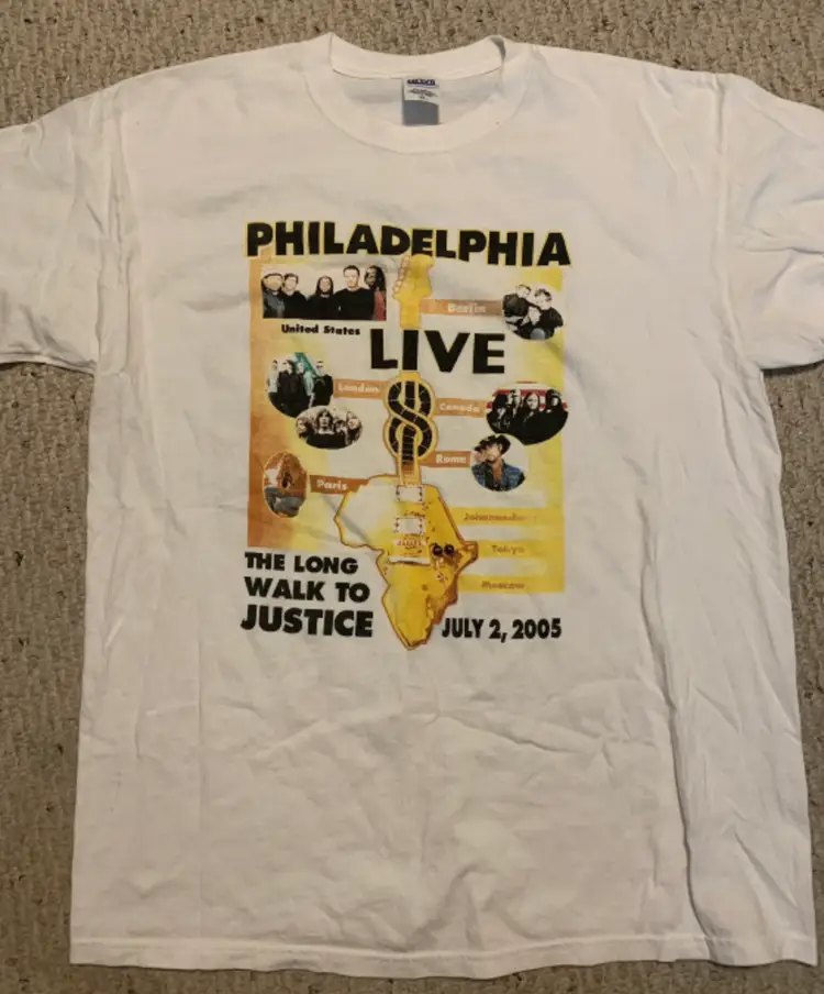 On 2 July 2005, a Live 8 concert was held in Philadelphia, Pennsylvania, in front of the Philadelphia Museum of Art, with a densely packed audience stretched out for one mile along the Benjamin Franklin Parkway. This is a T-Shirt from that event! Size on tag reads XL. FREE SHIPPING!