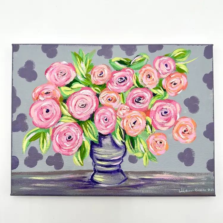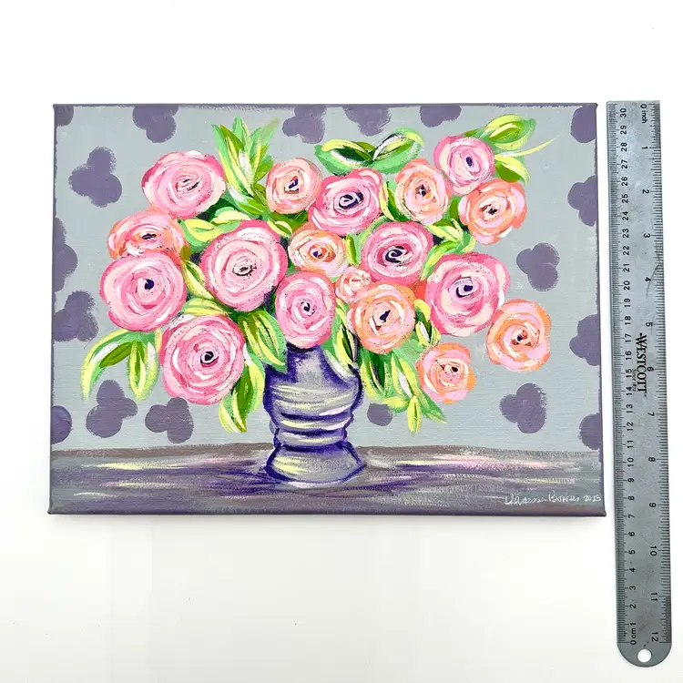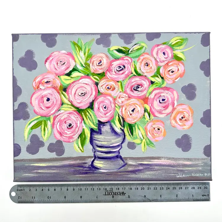 Acrylic floral painting as completed in Theme Park Art in Bloom Live 9” X 12” “Art in Bloom”