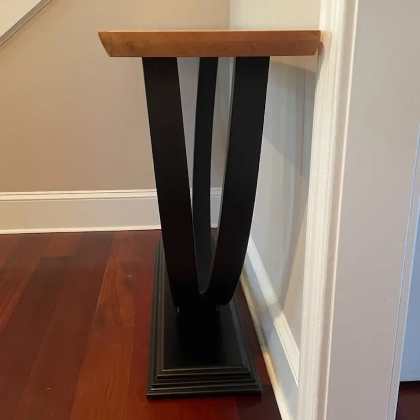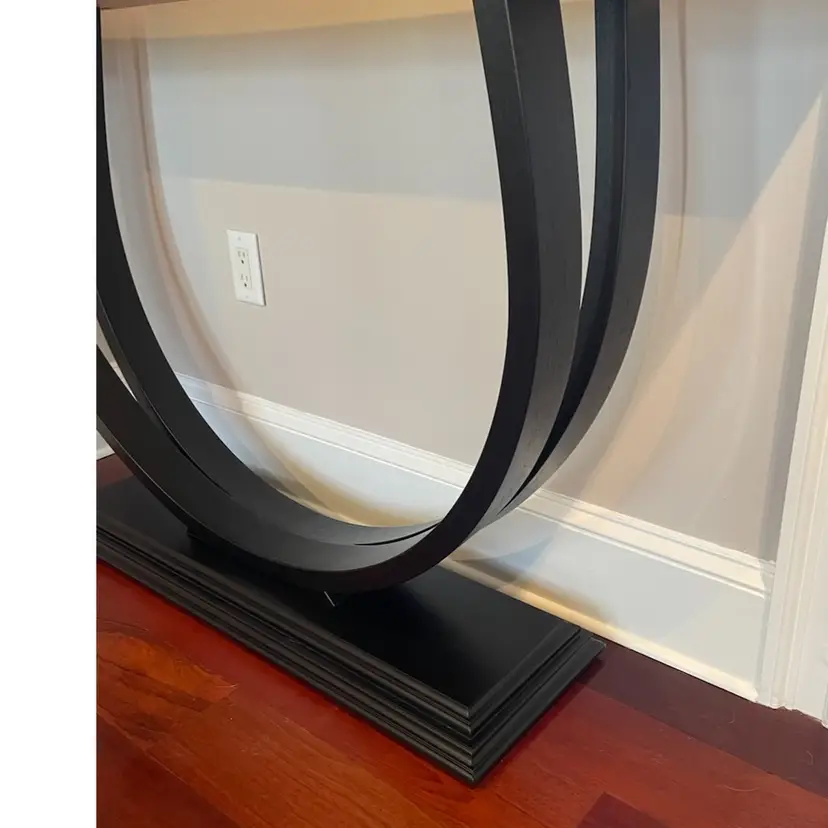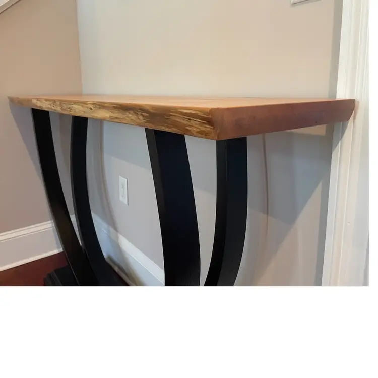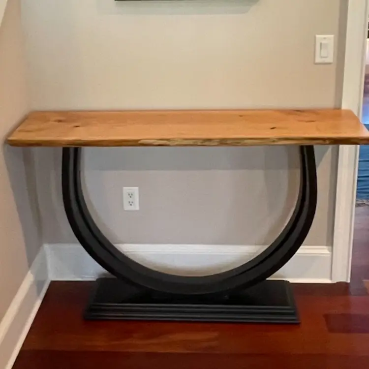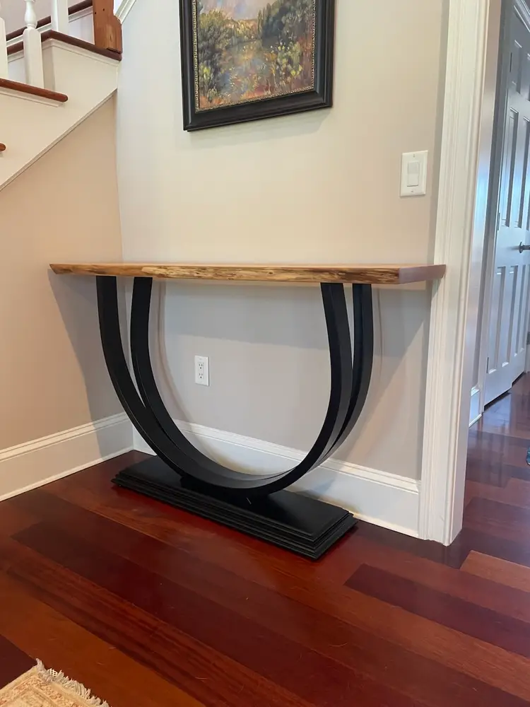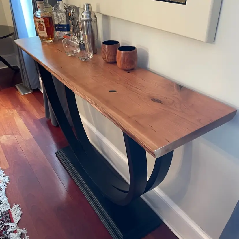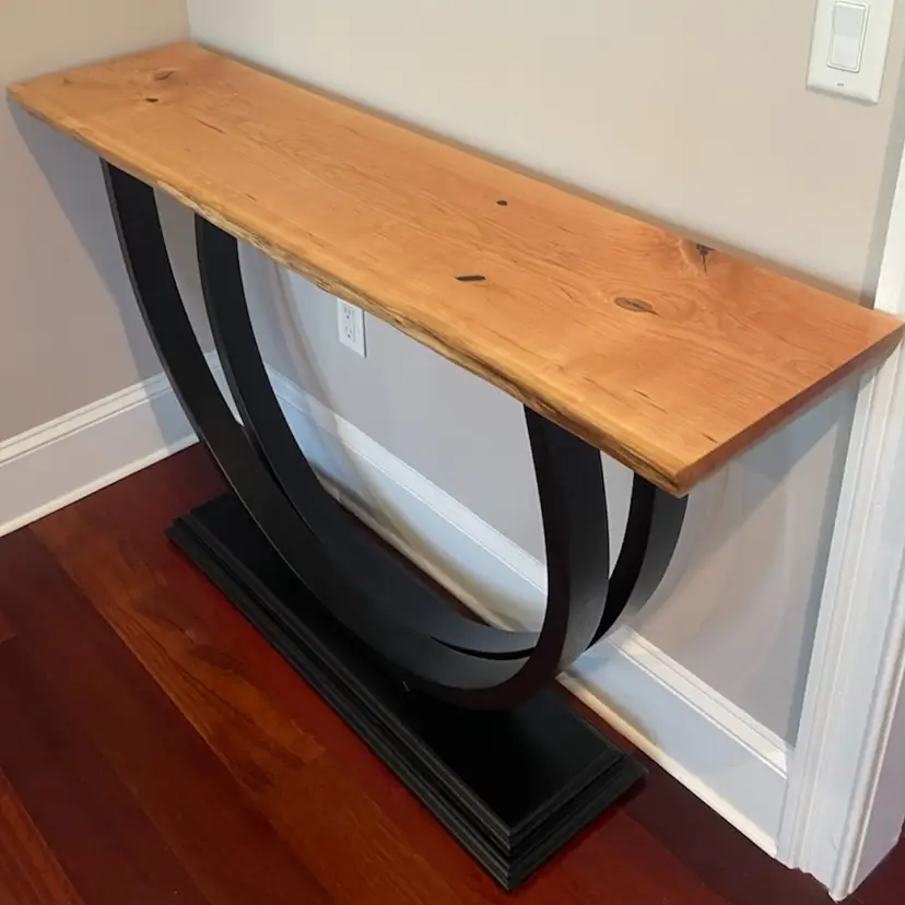A beautifully sculpted shape; two circular legs seamlessly joined at the thick molded base so as to be made from one single piece of wood. This was made by steam bending the layers of wood and then glueing and clamping them into a form to maintain the shape. Finished with black paint and sprayed lacquer. The top is a Live Edge Cherry Slab finished with sprayed lacquer. A very stunning piece that fits with any decor. Made To Order with your choice of Wood and Size. 1 1/2" thick Top 14" Deep 54" Wide 33 1/2 Tall
