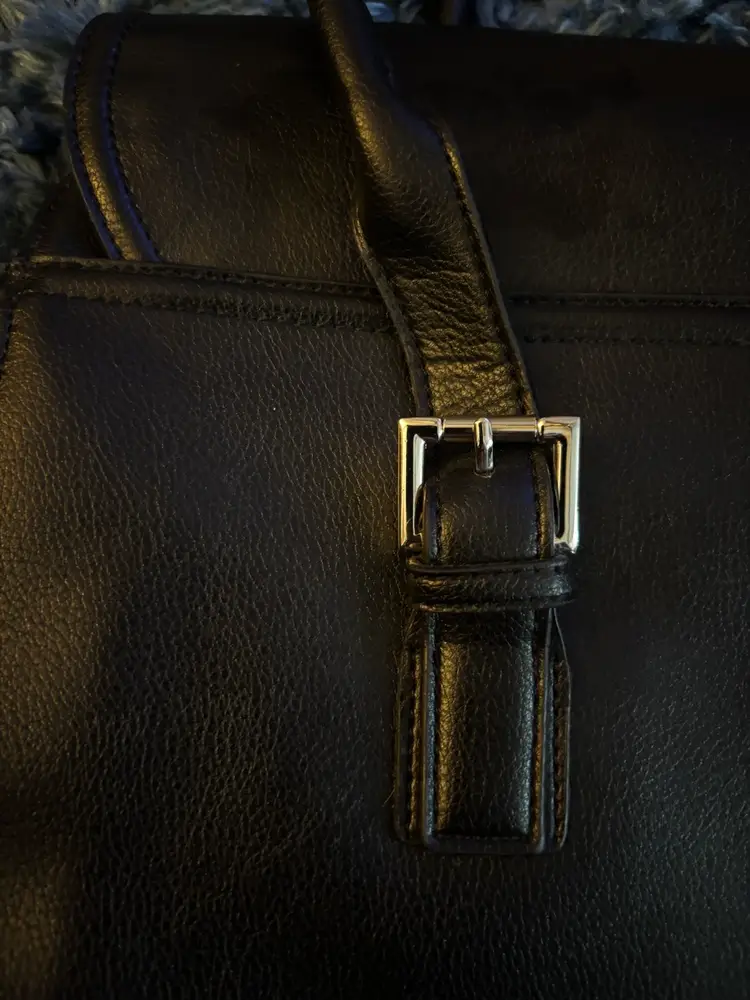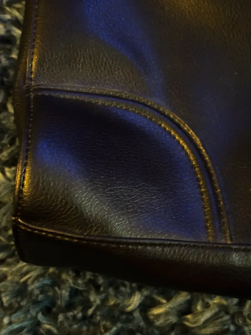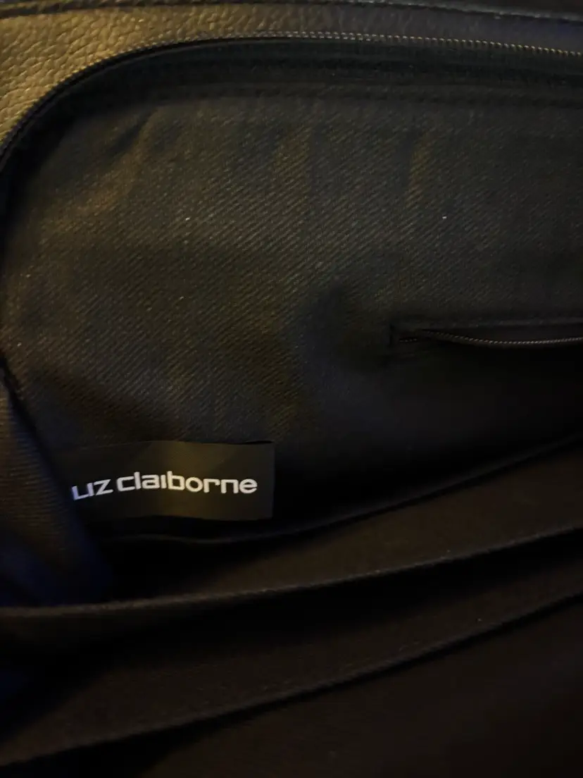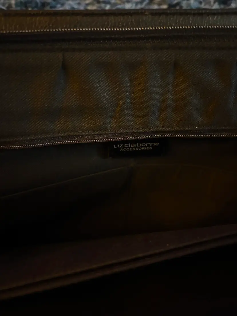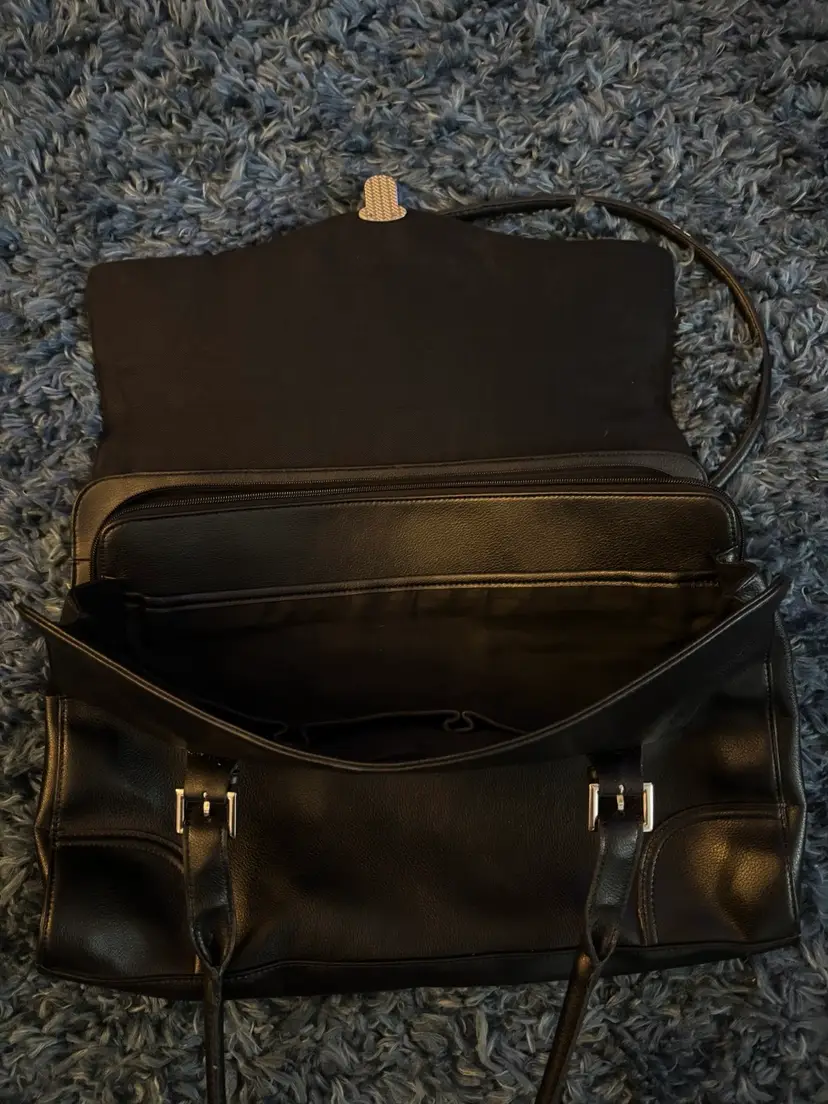 Approx. 16”x 13” Shell 100% polyvinyl Lining 100% cotton Nice bag in pristine condition, one little place under strap shown in photo. Black with silver tone metal. Briefcase style. Lots of pockets/sections/dividers! Reinforced corners! Will hold tablet/laptop