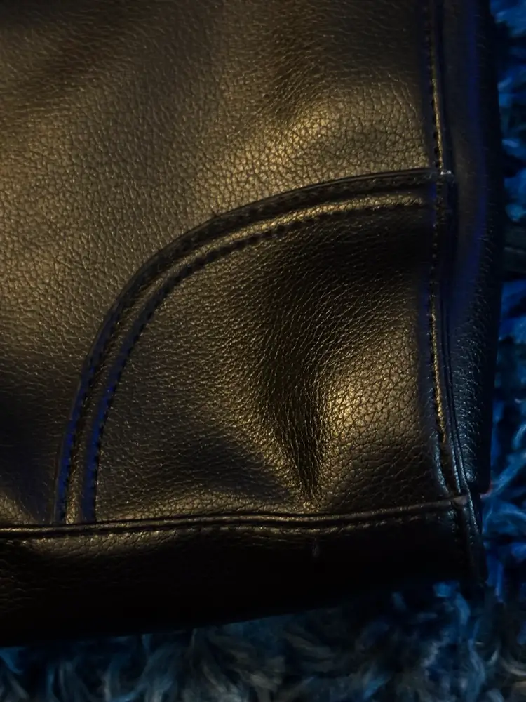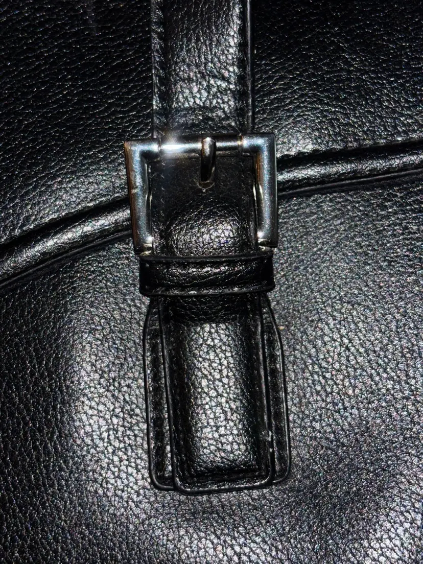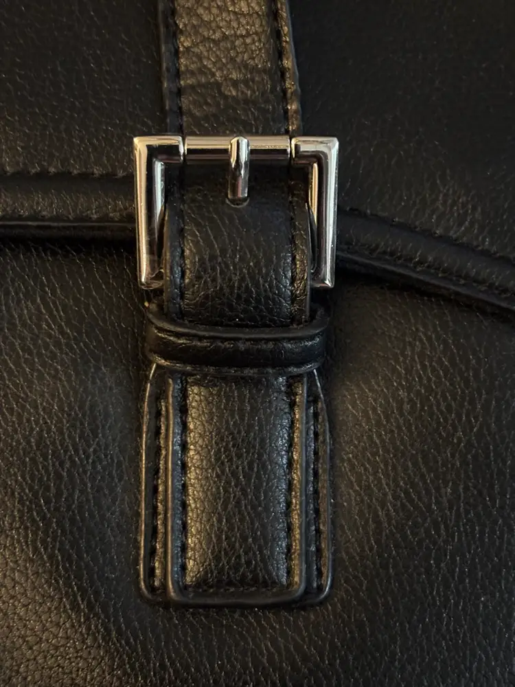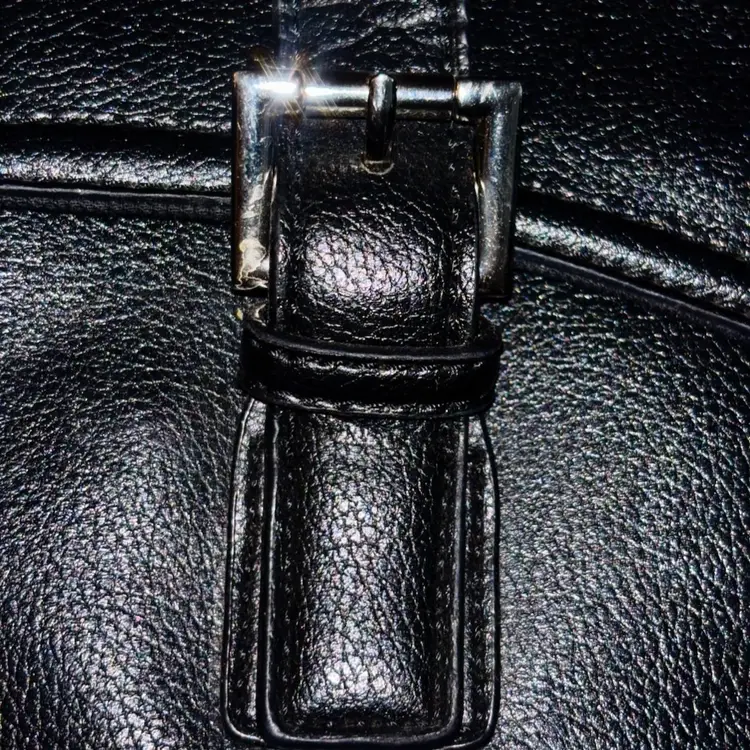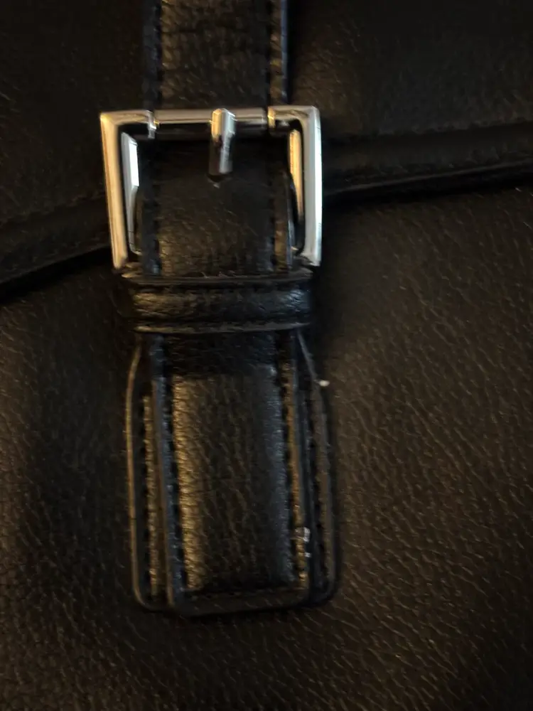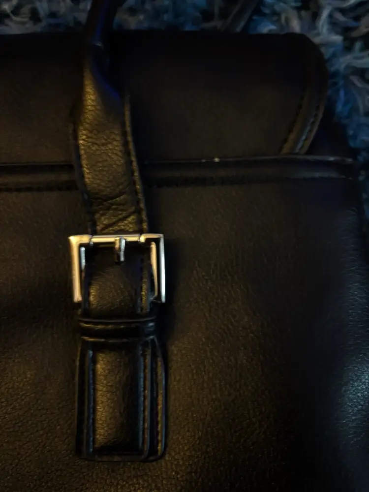 Approx. 16”x 13” Shell 100% polyvinyl Lining 100% cotton Nice bag in pristine condition, one little place under strap shown in photo. Black with silver tone metal. Briefcase style. Lots of pockets/sections/dividers! Reinforced corners! Will hold tablet/laptop