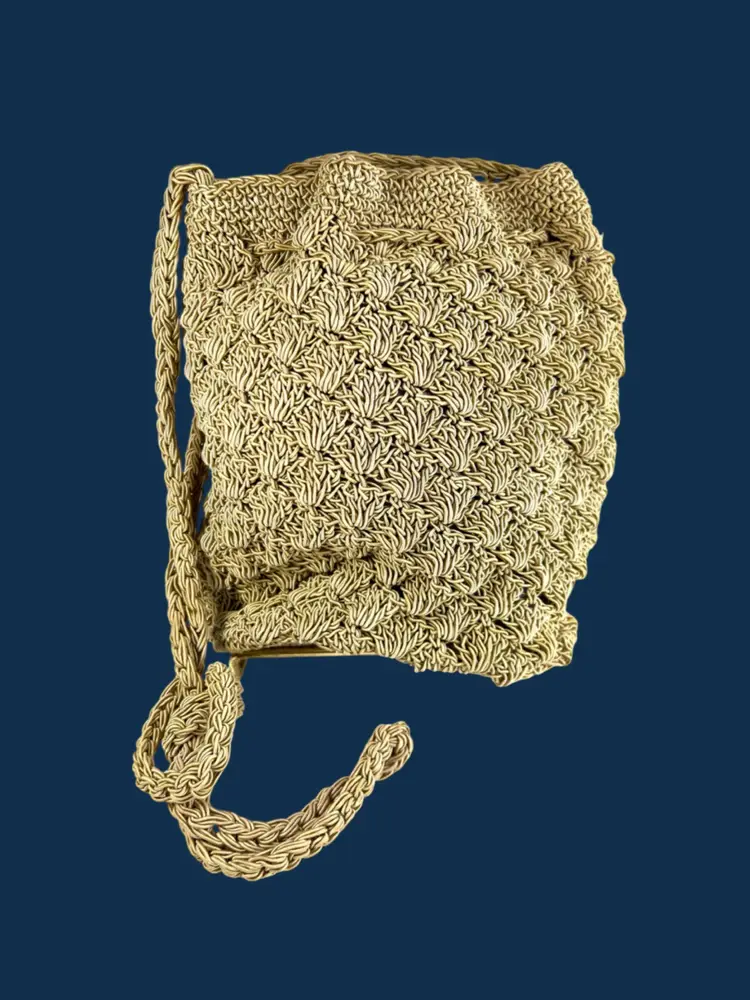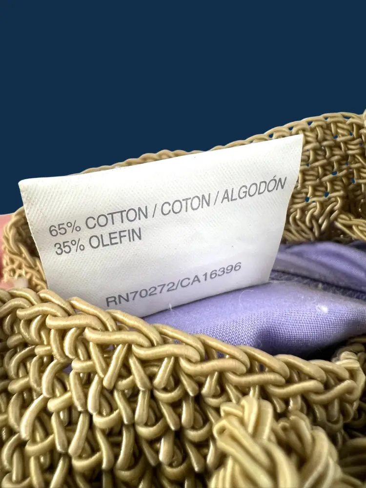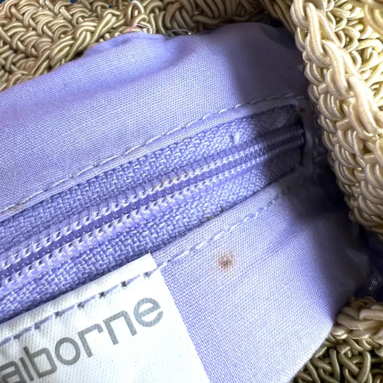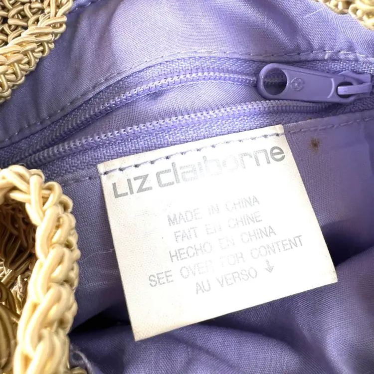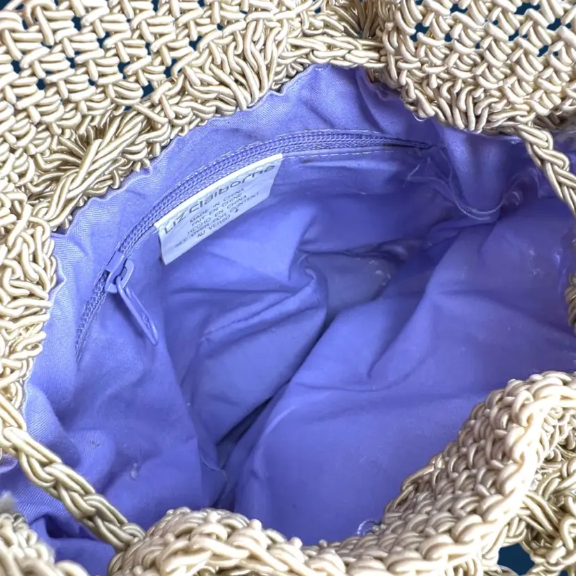 Liz Claiborne tagged on interior Beige Tan Crossbody or Shoulder Bag. Crocheted Boho with Cotton/Olefin material. π Lavender Purple Interior. Zippered Inside Pocket. 8β H x 6β W x 5β D (without straps) 23β shoulder strap drop Weighs 6 ounces Condition: Zippers well. Interior near pocket- needs minor spot cleaning.