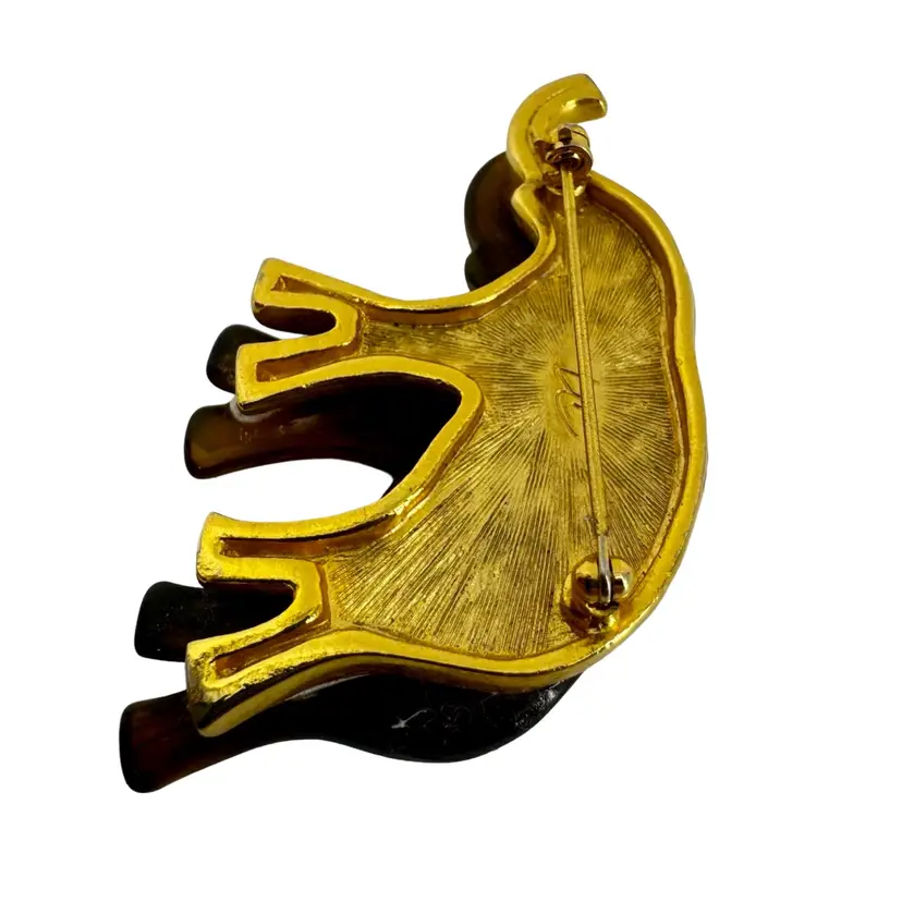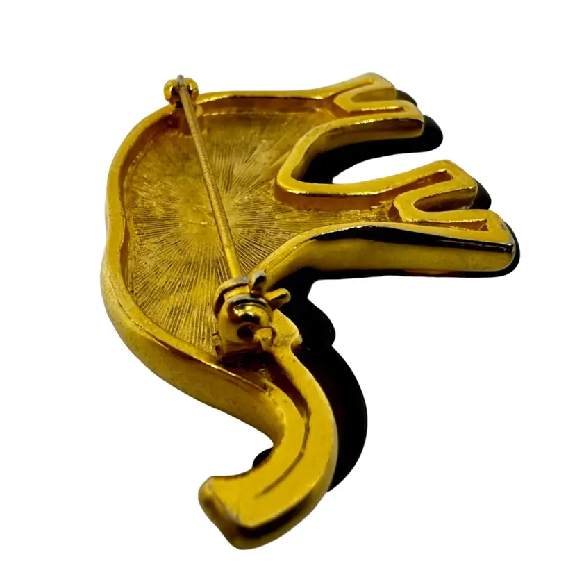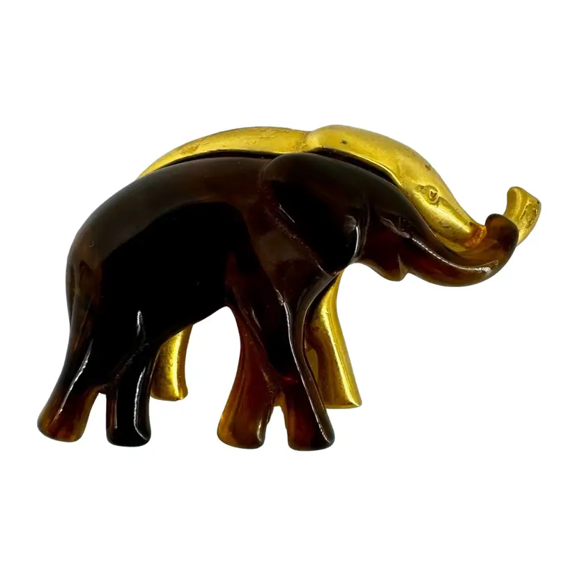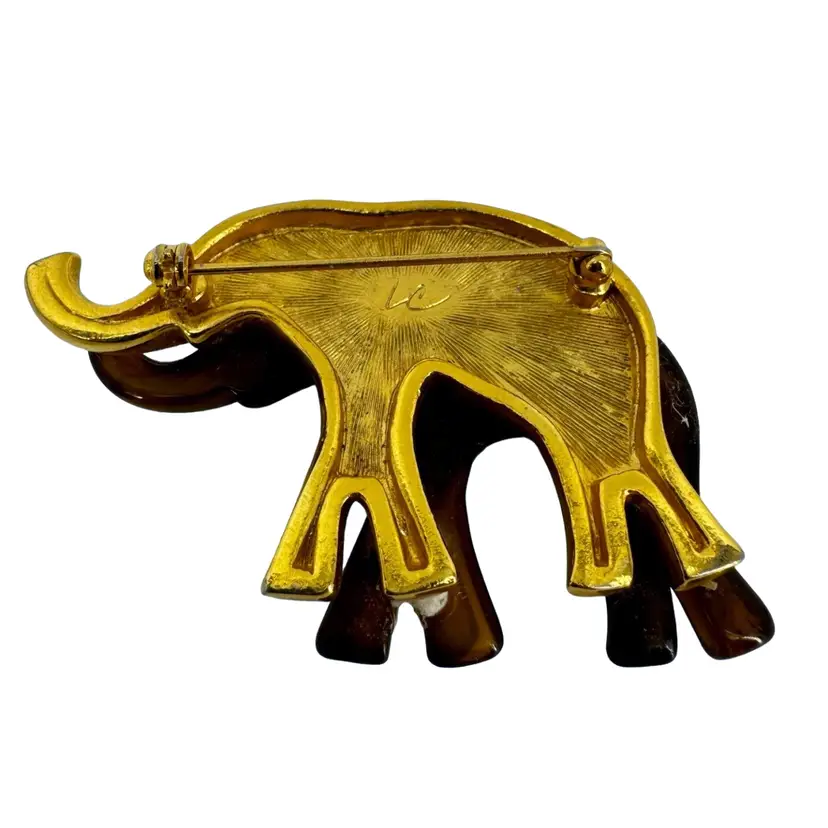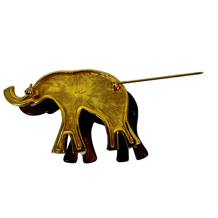 In very good vintage condition. The piece is marked LC for the maker and the clasp is in working order. There is a white spot on the bottom backside leg of the elephant. Please review pictures as part of the description.