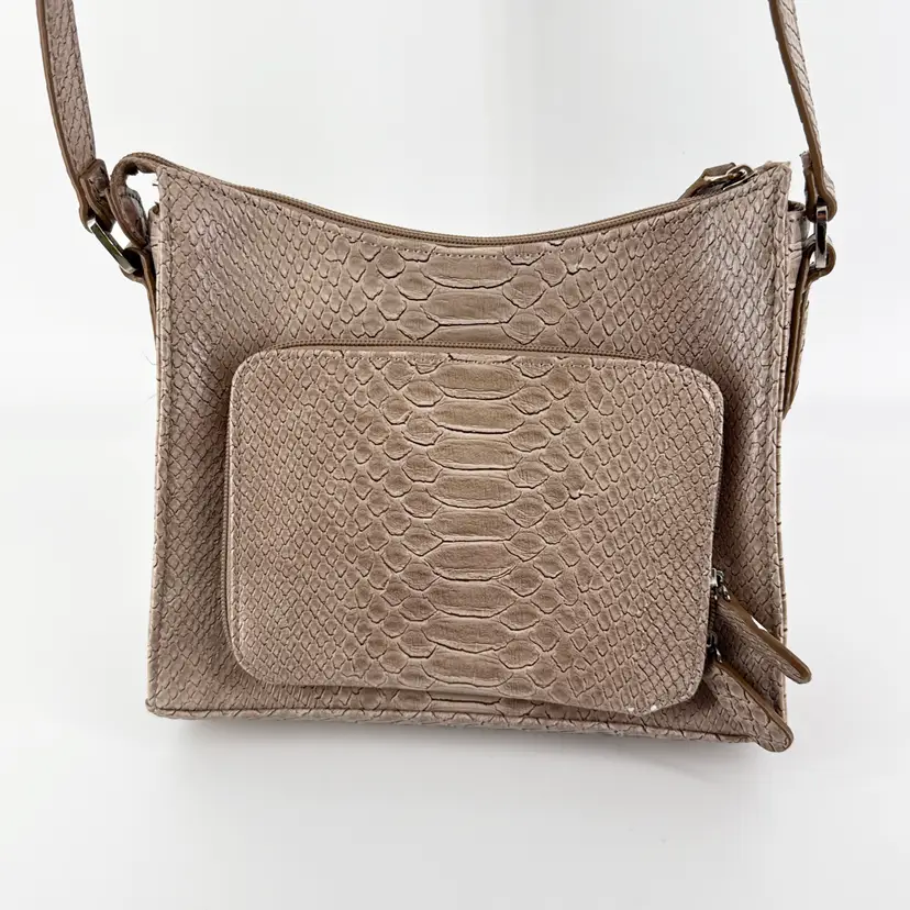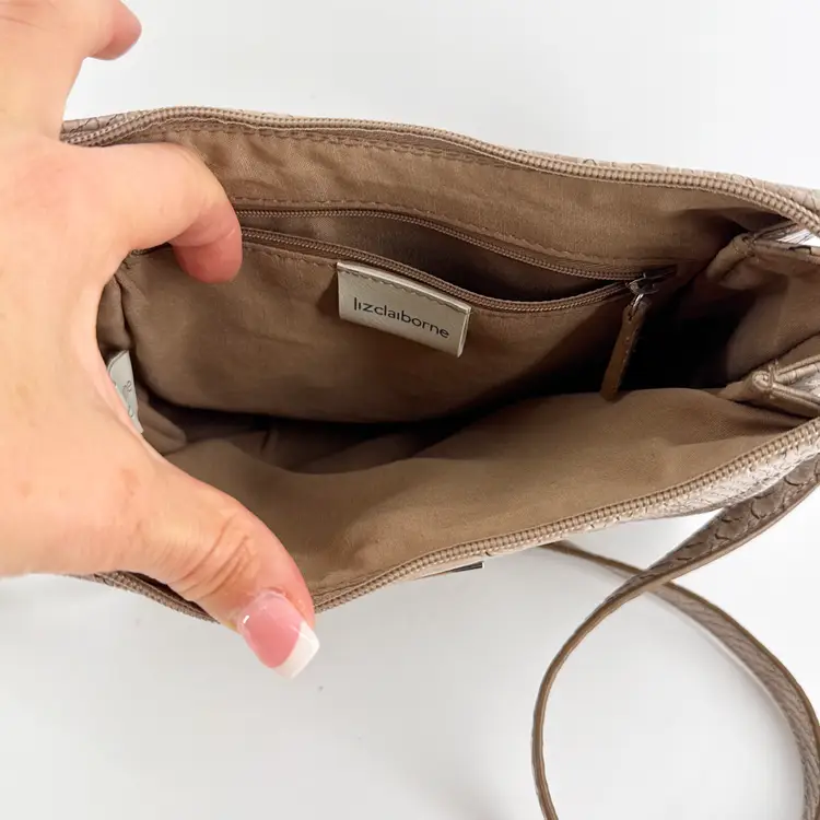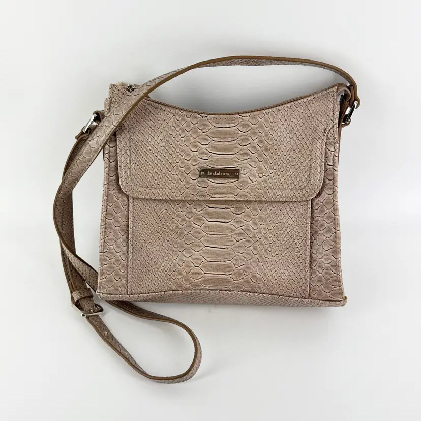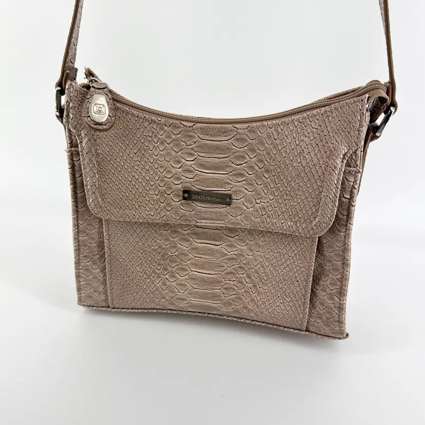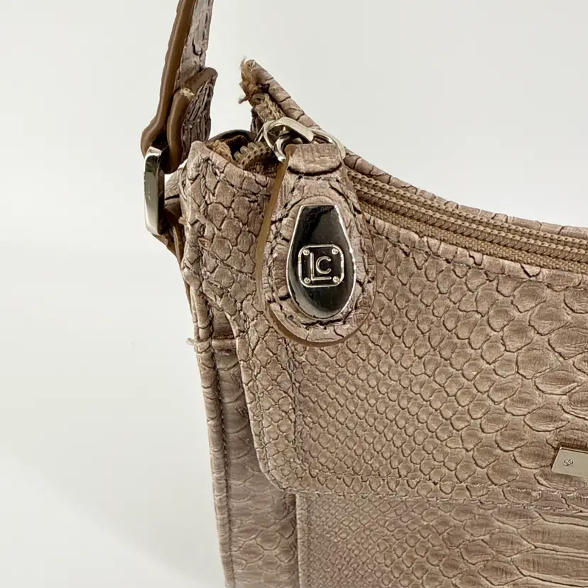 It has an adjustable strap and is 100% Polyvinyl. It measures 9"x7"x3.25" and is in excellent condition. There are no rips, stains or repairs. (See photos).