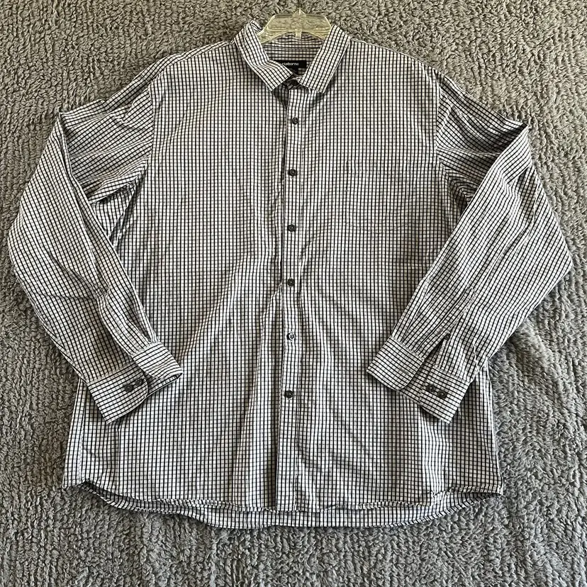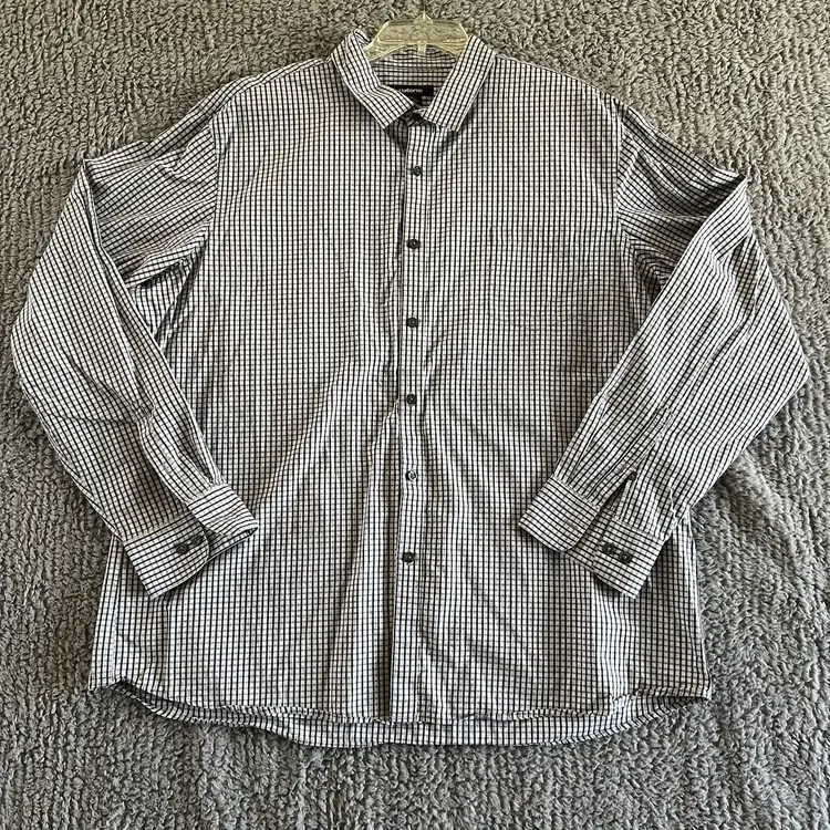 Neckline: Collared Closure: Button Occasion: Casual, Workwear Size: 2XL Fabric Type: Woven Accents: Button Vintage: No Personalize: No Department: Men Collar Style: Button-Down Features: Lightweight, Pockets Season: Fall, Spring, Summer, Winter Handmade: No Pattern: Plaid Sleeve Length: Long Sleeve Chest Size: 54 in Garment Care: Machine Washable Color: Gray Material: Cotton Brand: Liz Claiborne Fit: Regular Size Type: Regular Type: Button-Up Theme: Classic Country/Region of Manufacture: Mauritius